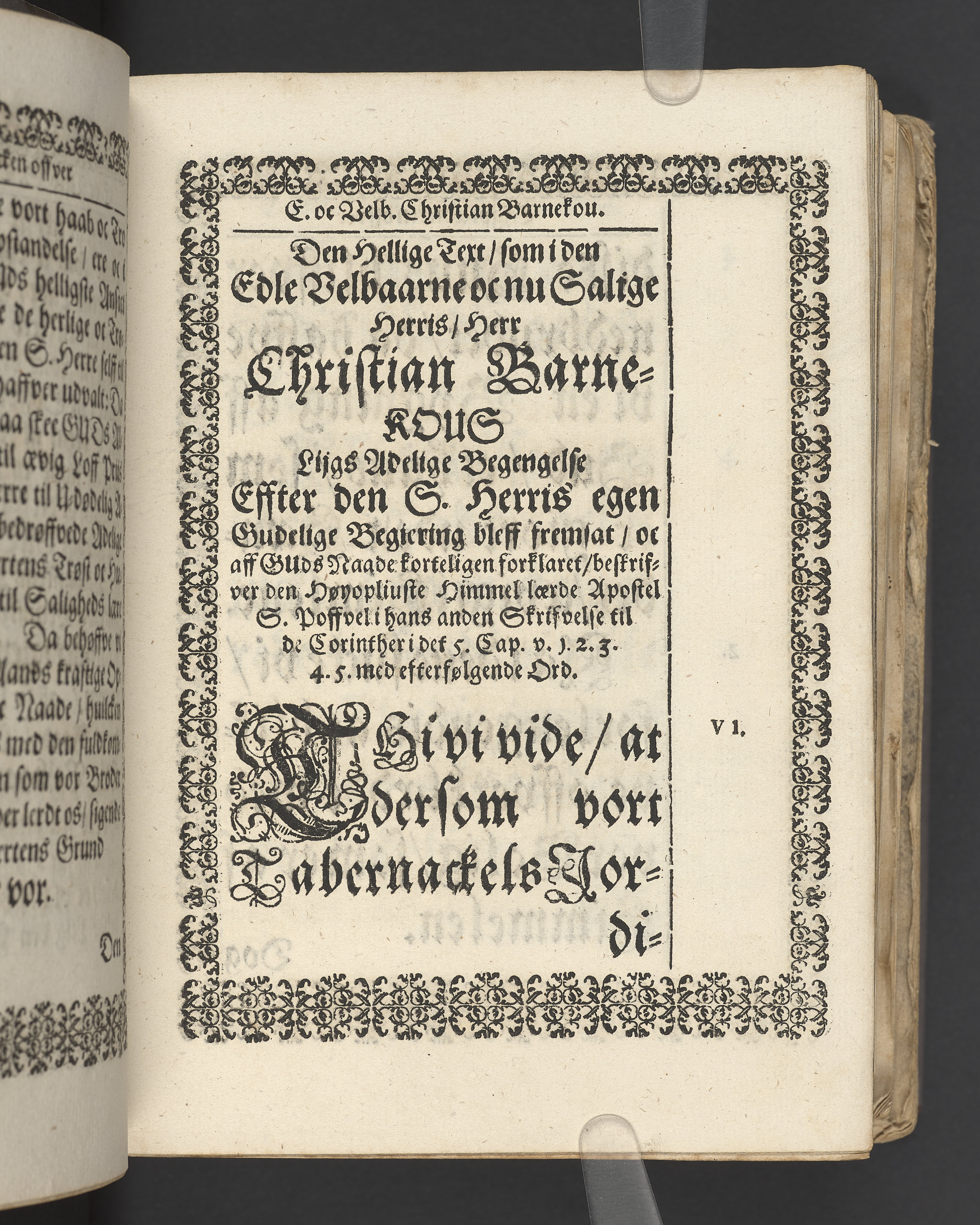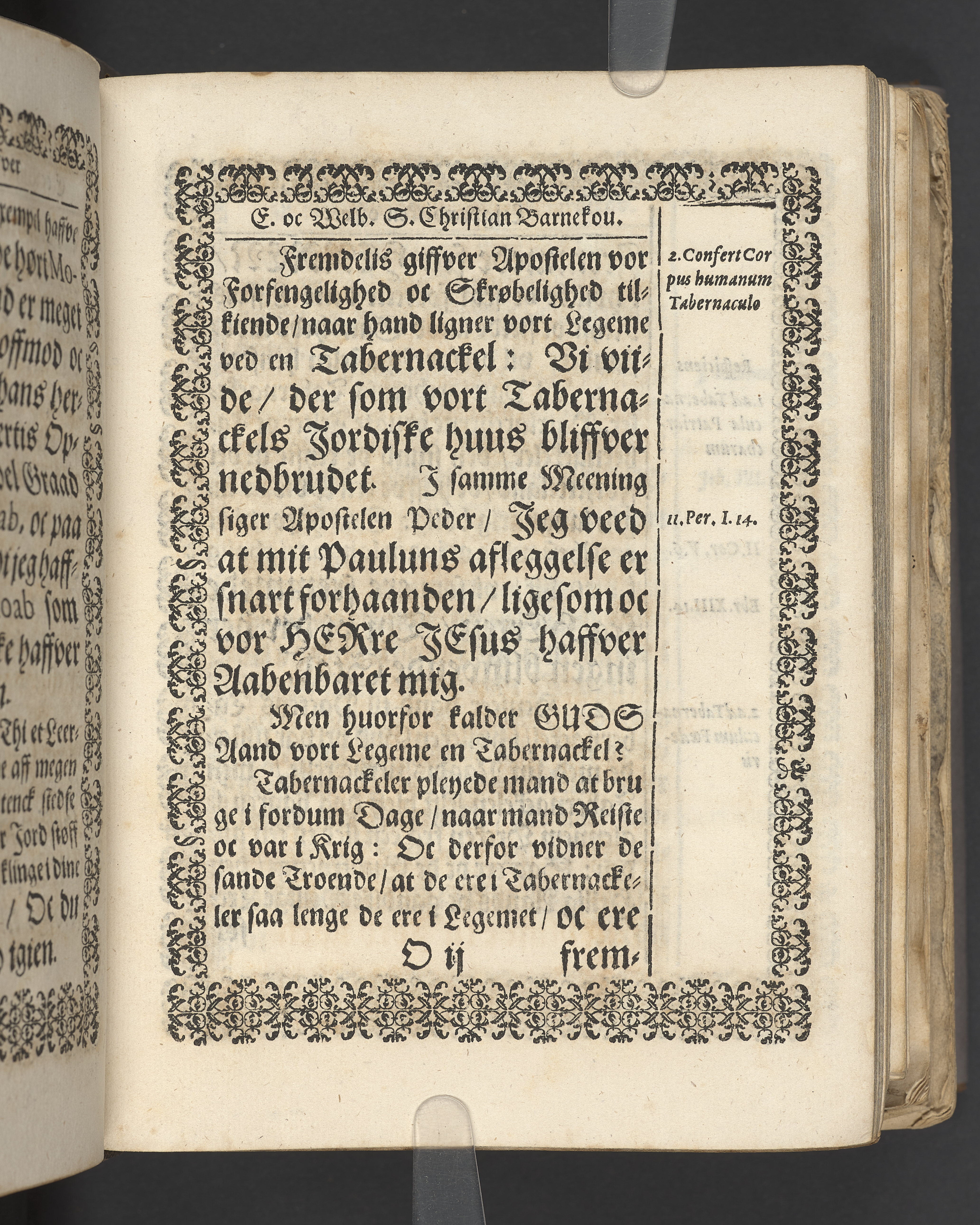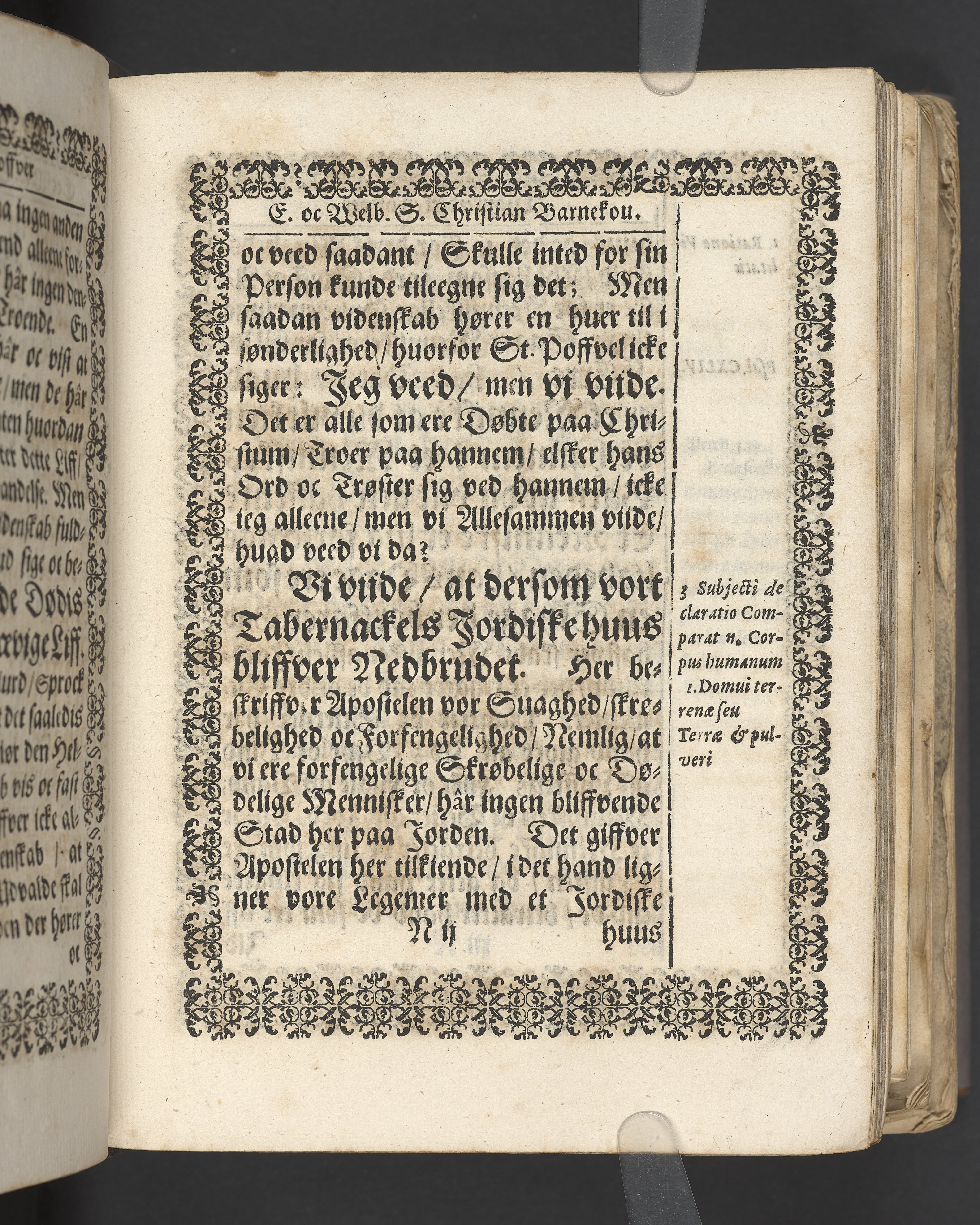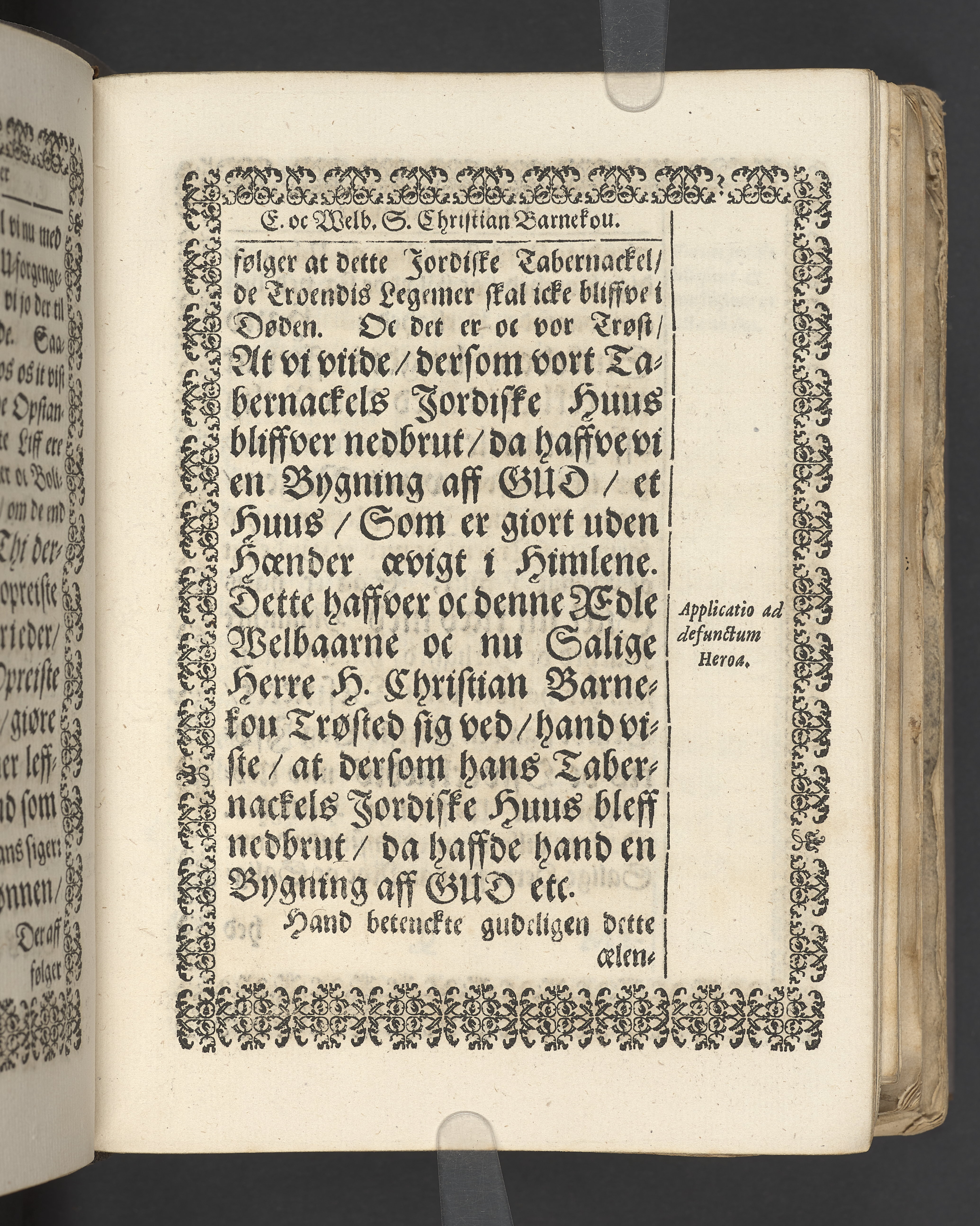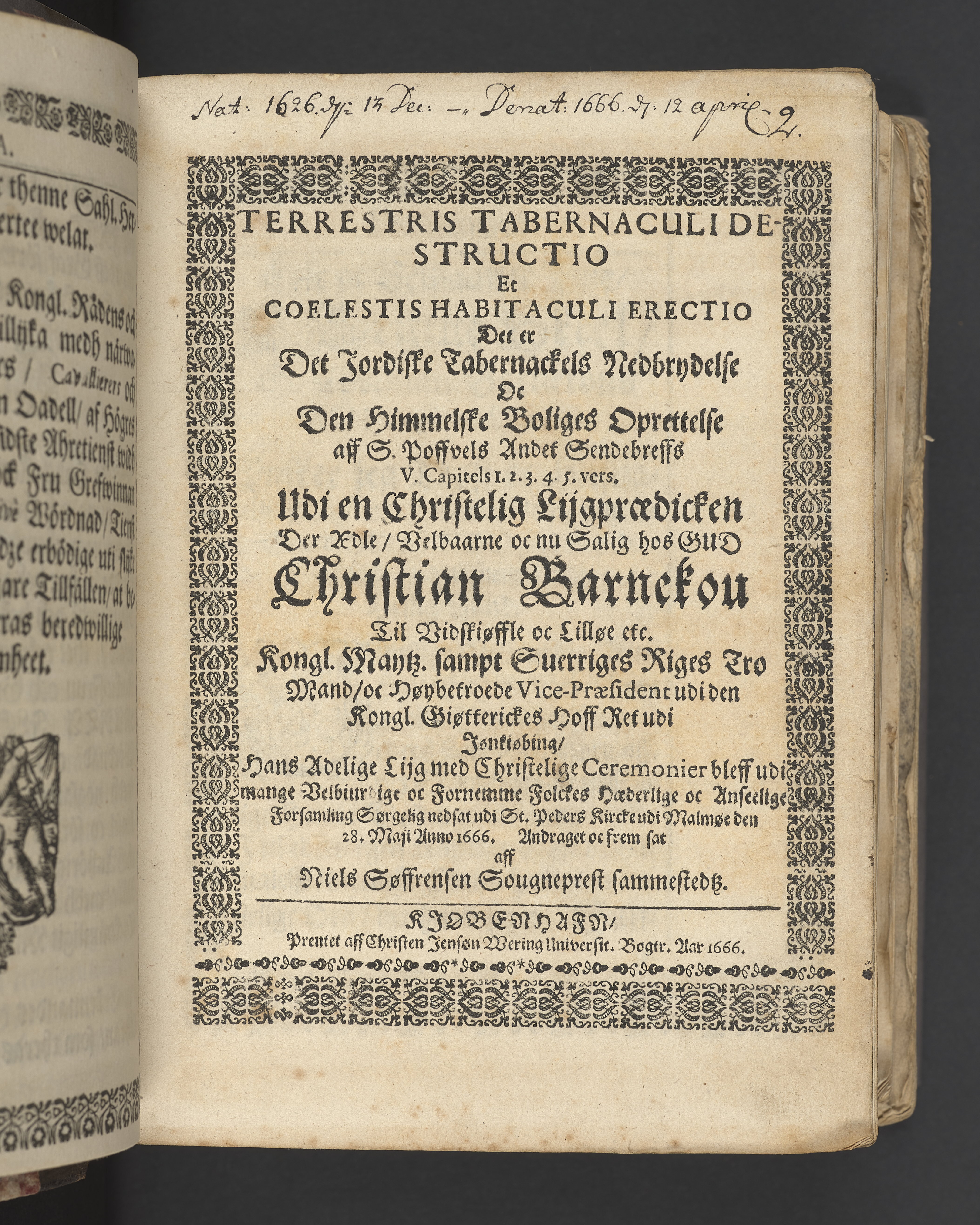 Terrestris tabernaculi destructio et coelestis habitaculi erectio Det er Det Jordiske tabernackels Nedbrydelse Oc Den Himmelske Boliges Oprettelse aff S. Poffvels Andet Sendebreffs V. Capitels 1.2.3.4.5. vers. Udi en Christelig Lijgpredicken Der Aedle/ Velbaarne oc nu Salig hos Gud Christian Barnekou Til Vidskiøffle oc Lilløe etc. Kongl. Maytz. sampt Suerriges Riges Tro mand/ och Høybetroede Vice-Praesident udi den Kongl. Giøtterickes Hof ret udi Jønkiøbing/ Hans Adelige Lijg med Christelige Ceremonier bleff udi mange Velbiurdige oc Fornemme Folckes Haederlige oc Anseelige Forsamling Sørgelig nedsat udi St. Peders Kircke udi Malmøe den 28 Maji Anno 1666. Andraget oc frem sat aff Niels Søffrensen Sougneprest sammestedtz. Kiøbenhafn/ Prentet aff Christen Jensøn Wering Universit. Bogtr. Aar 1666.