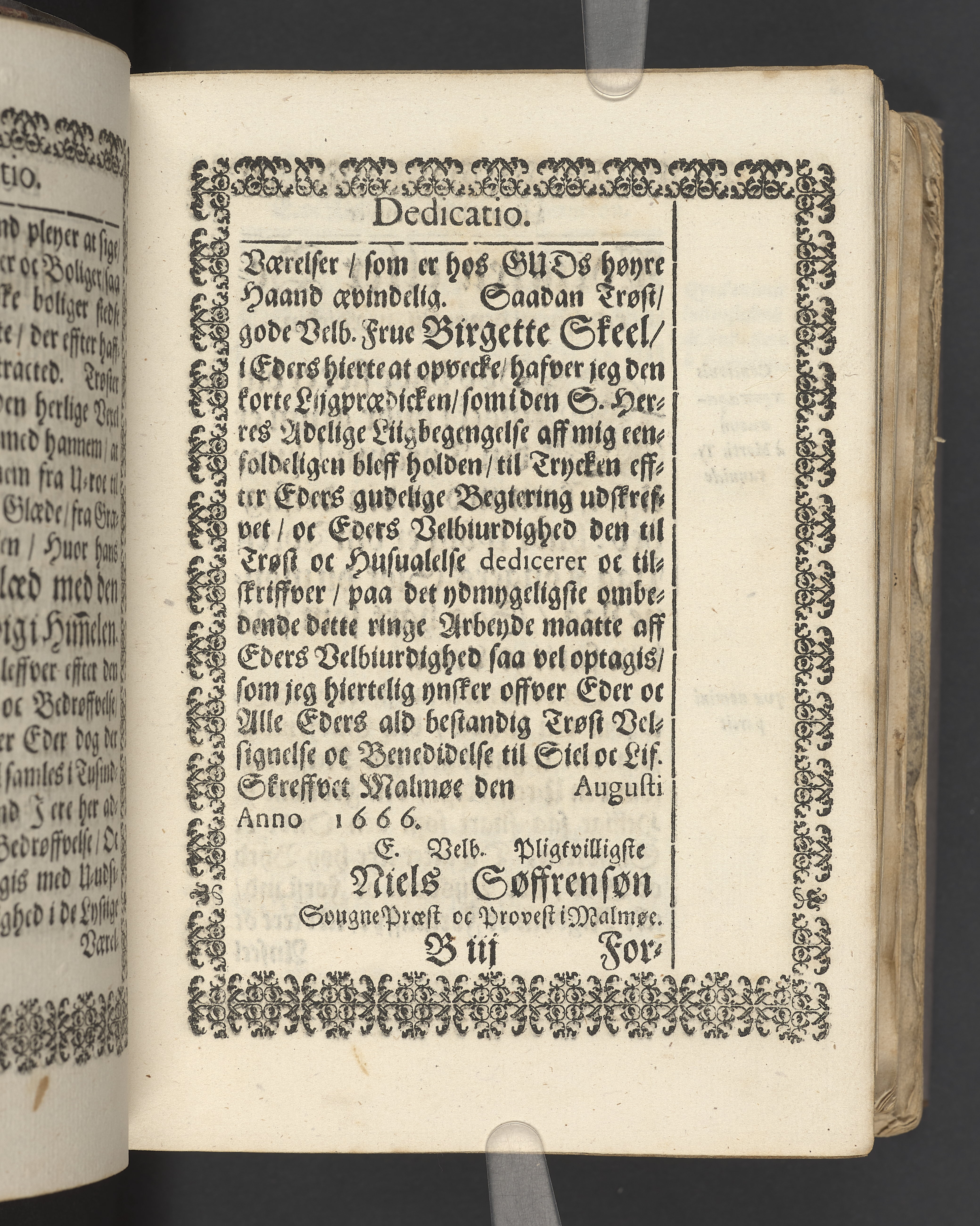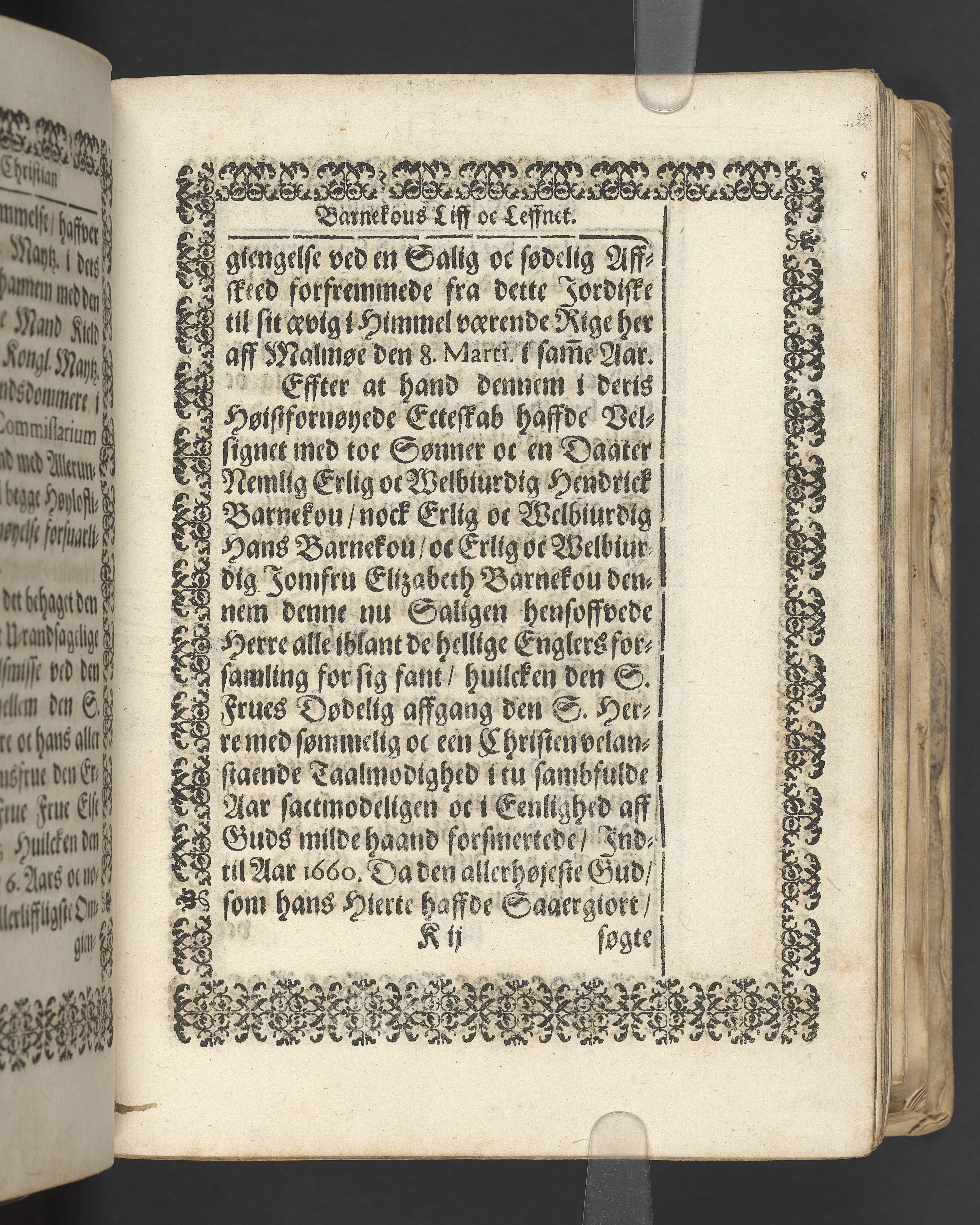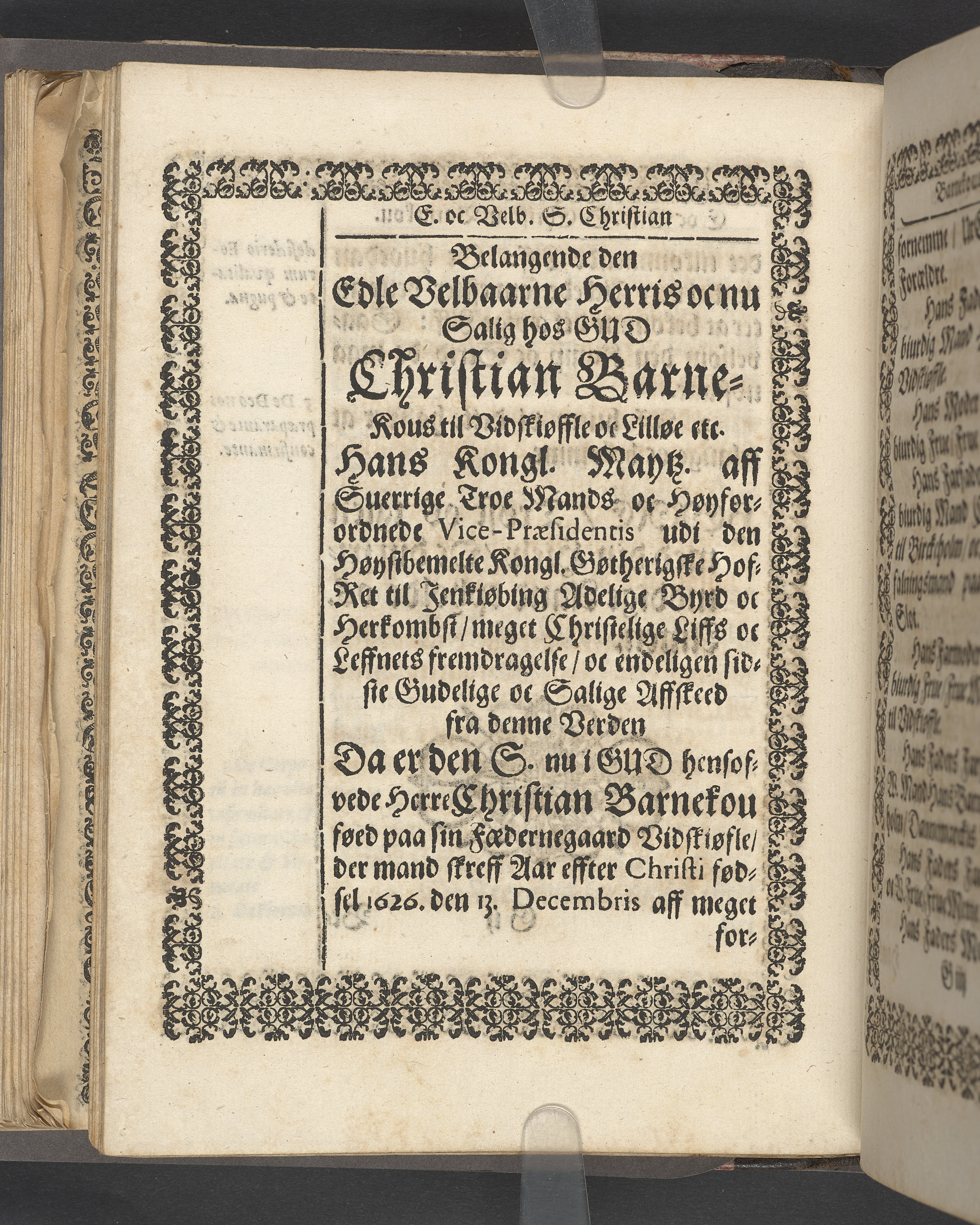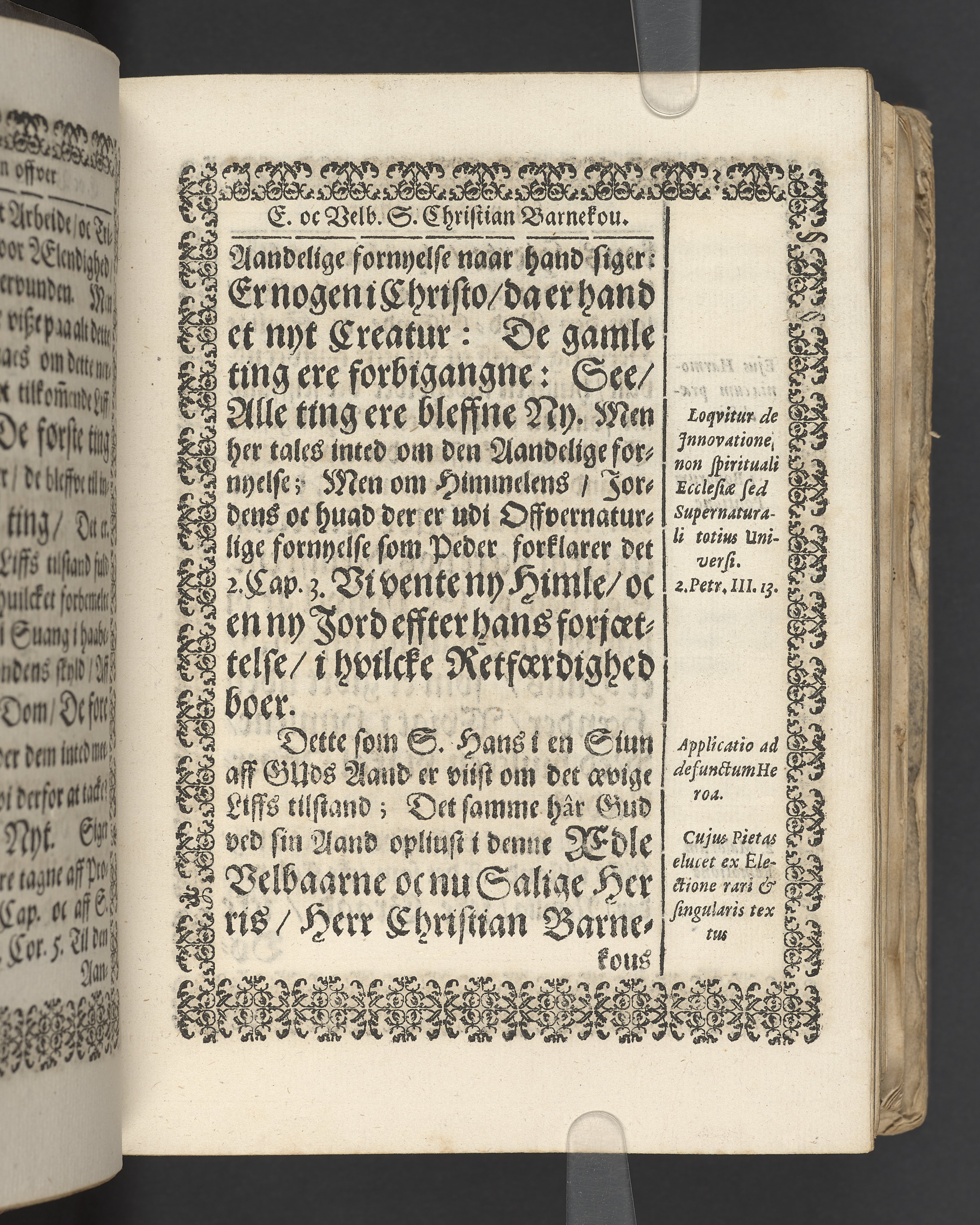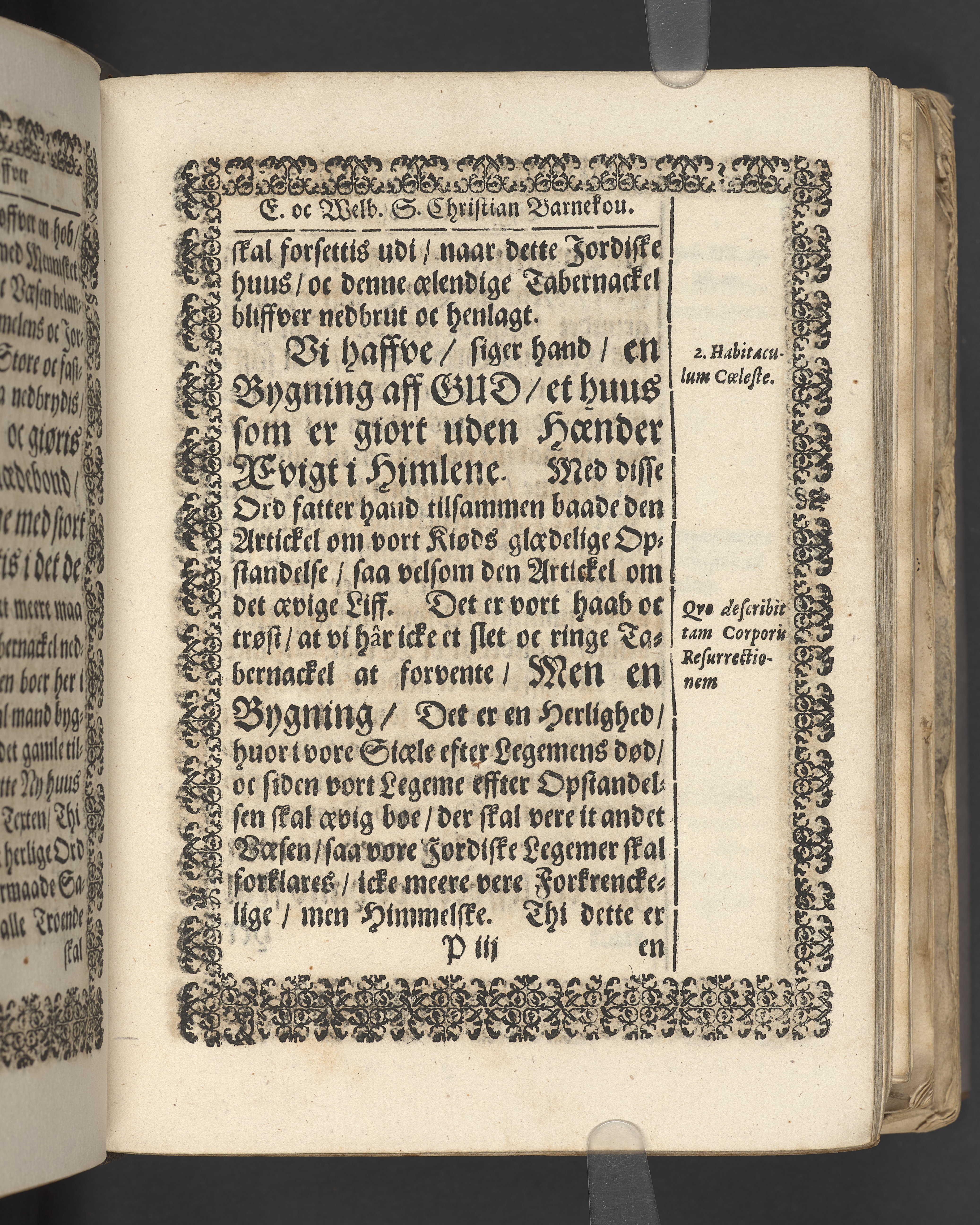 Terrestris tabernaculi destructio et coelestis habitaculi erectio Det er Det Jordiske tabernackels Nedbrydelse Oc Den Himmelske Boliges Oprettelse aff S. Poffvels Andet Sendebreffs V. Capitels 1.2.3.4.5. vers. Udi en Christelig Lijgpredicken Der Aedle/ Velbaarne oc nu Salig hos Gud Christian Barnekou Til Vidskiøffle oc Lilløe etc. Kongl. Maytz. sampt Suerriges Riges Tro mand/ och Høybetroede Vice-Praesident udi den Kongl. Giøtterickes Hof ret udi Jønkiøbing/ Hans Adelige Lijg med Christelige Ceremonier bleff udi mange Velbiurdige oc Fornemme Folckes Haederlige oc Anseelige Forsamling Sørgelig nedsat udi St. Peders Kircke udi Malmøe den 28 Maji Anno 1666. Andraget oc frem sat aff Niels Søffrensen Sougneprest sammestedtz. Kiøbenhafn/ Prentet aff Christen Jensøn Wering Universit. Bogtr. Aar 1666.