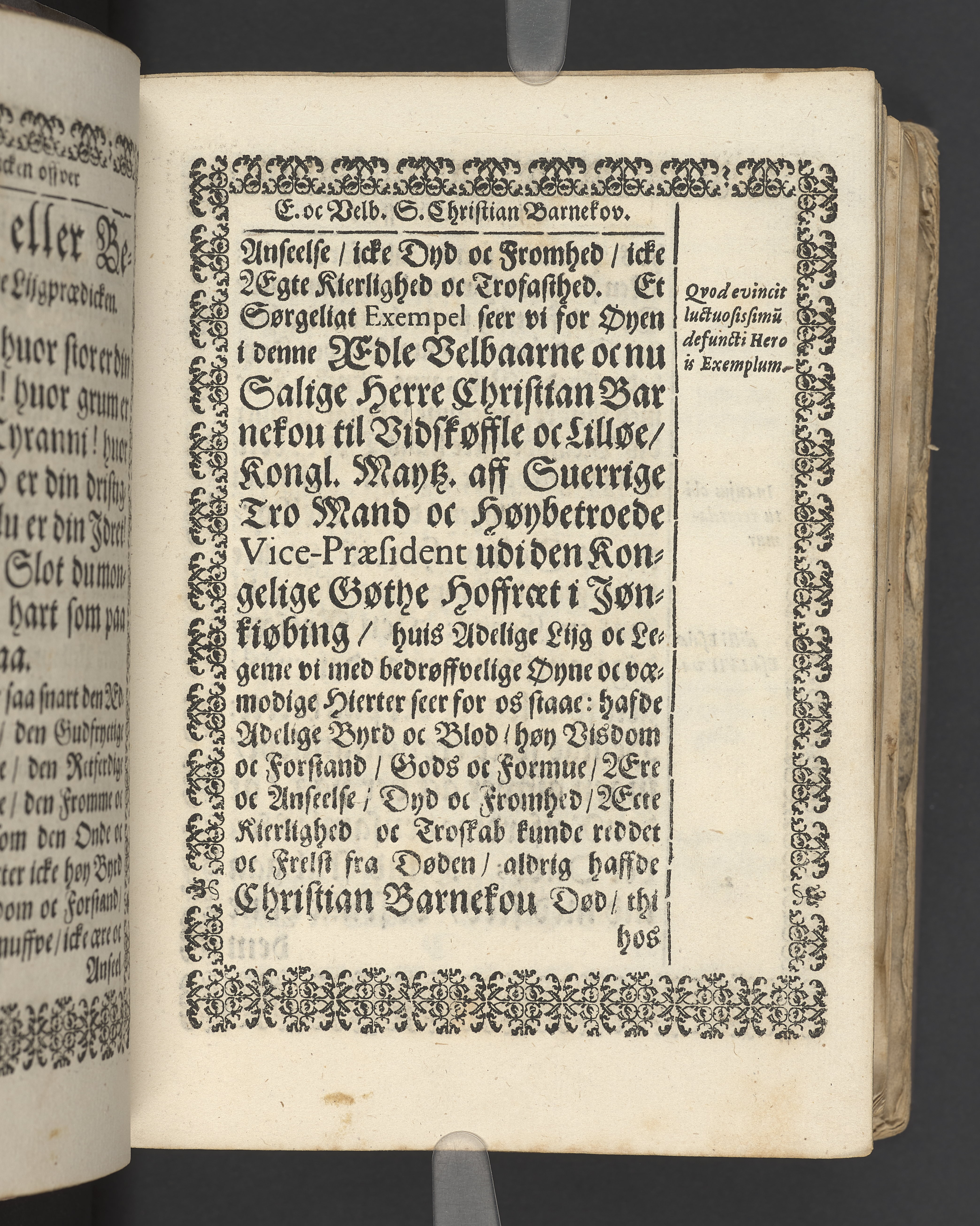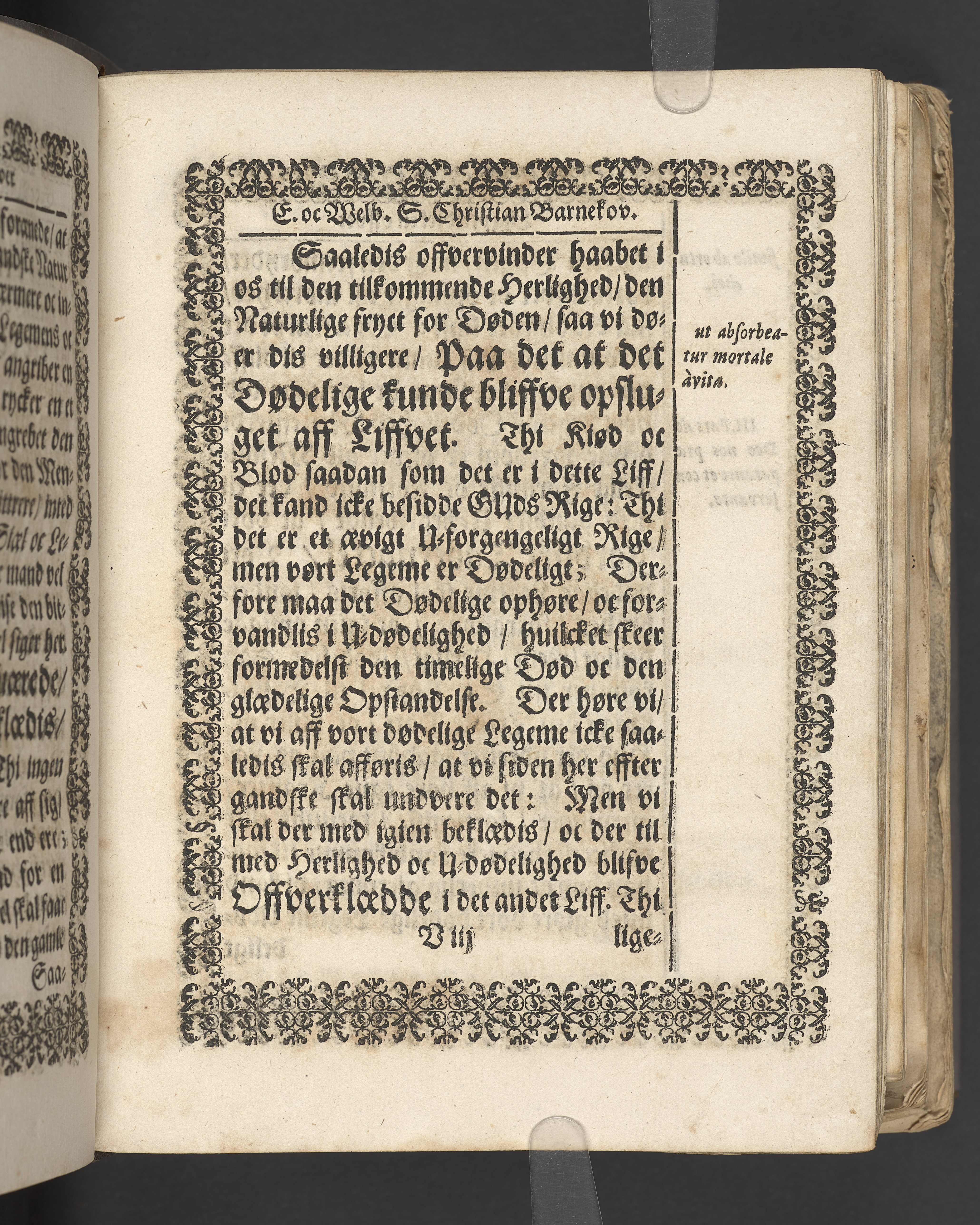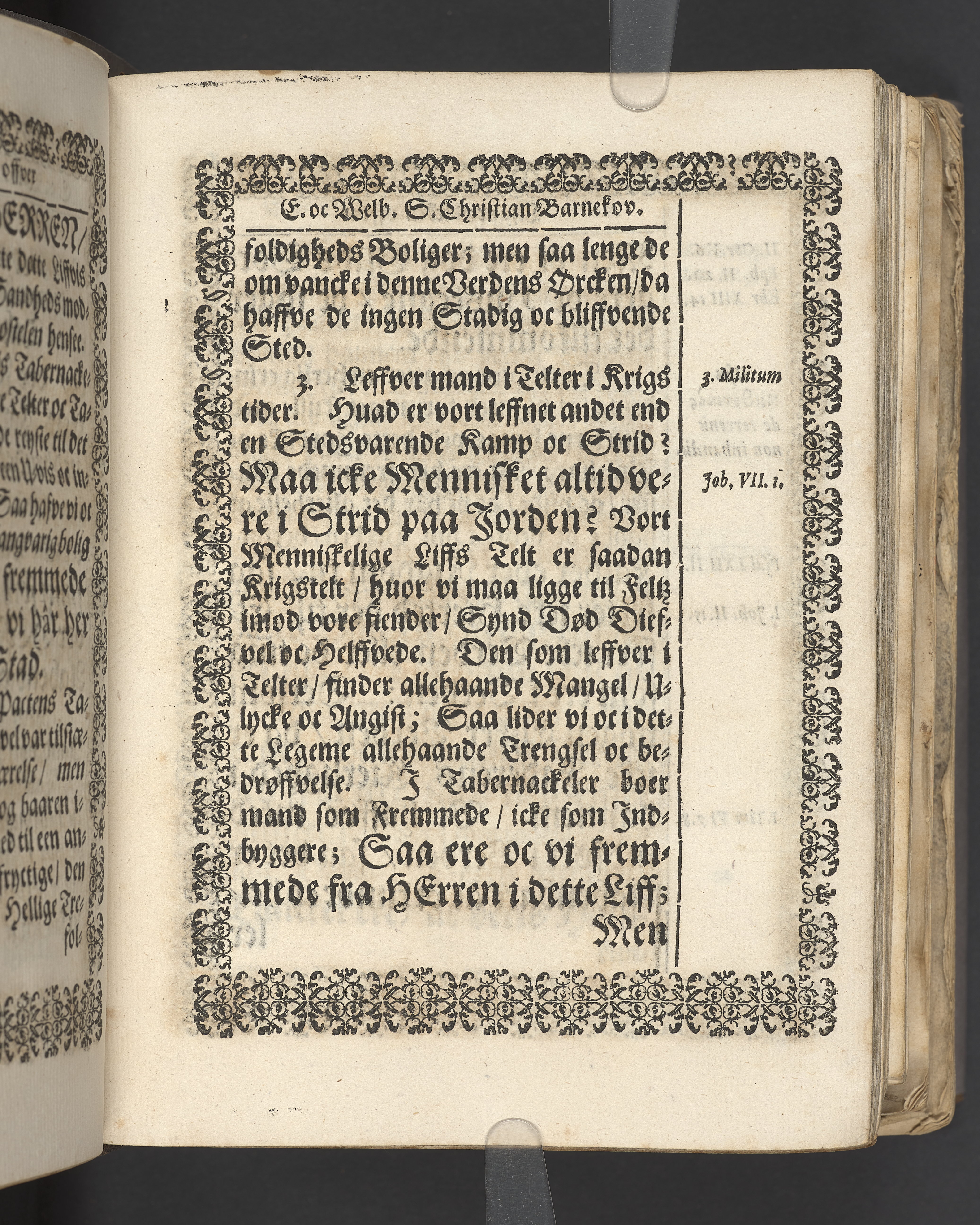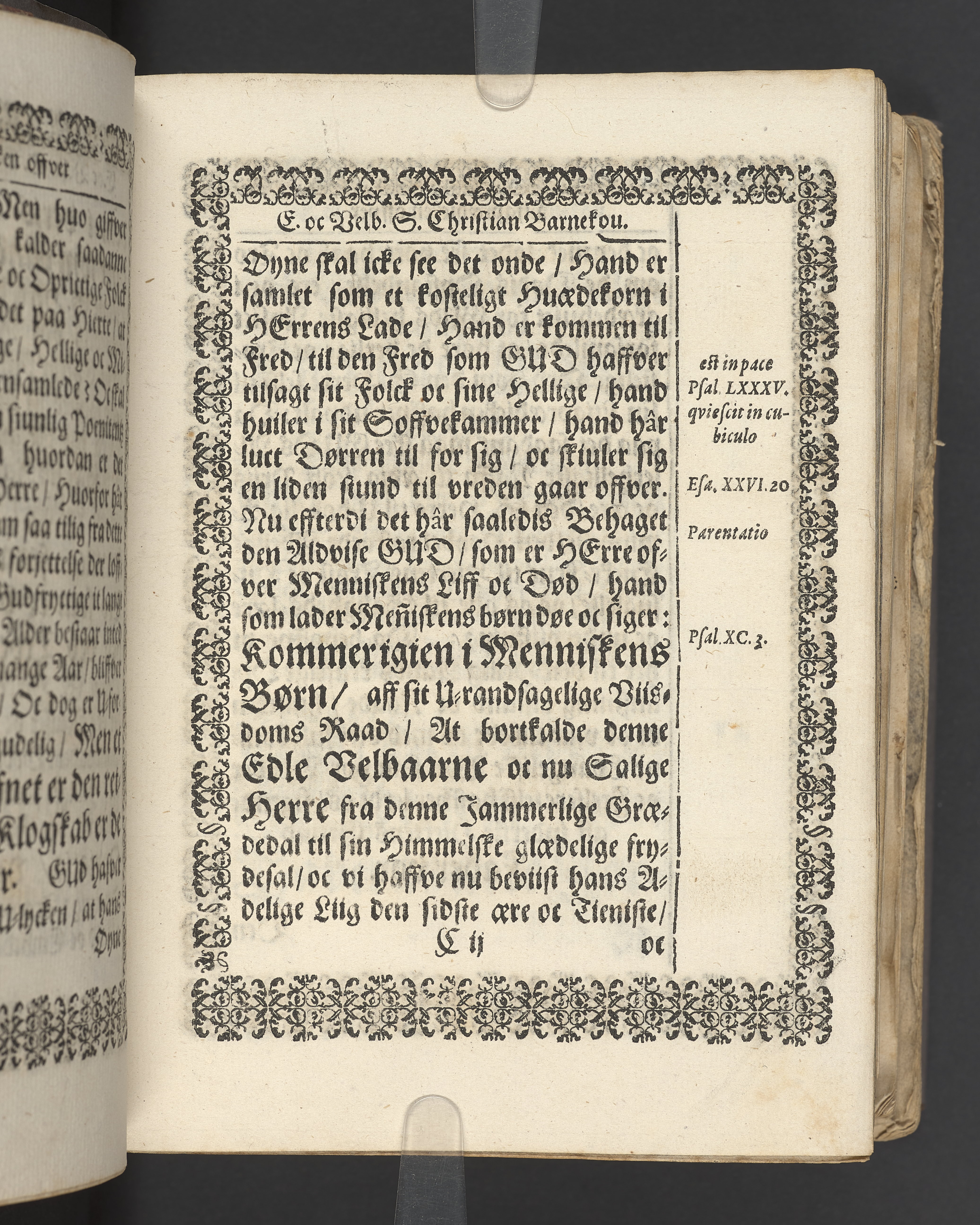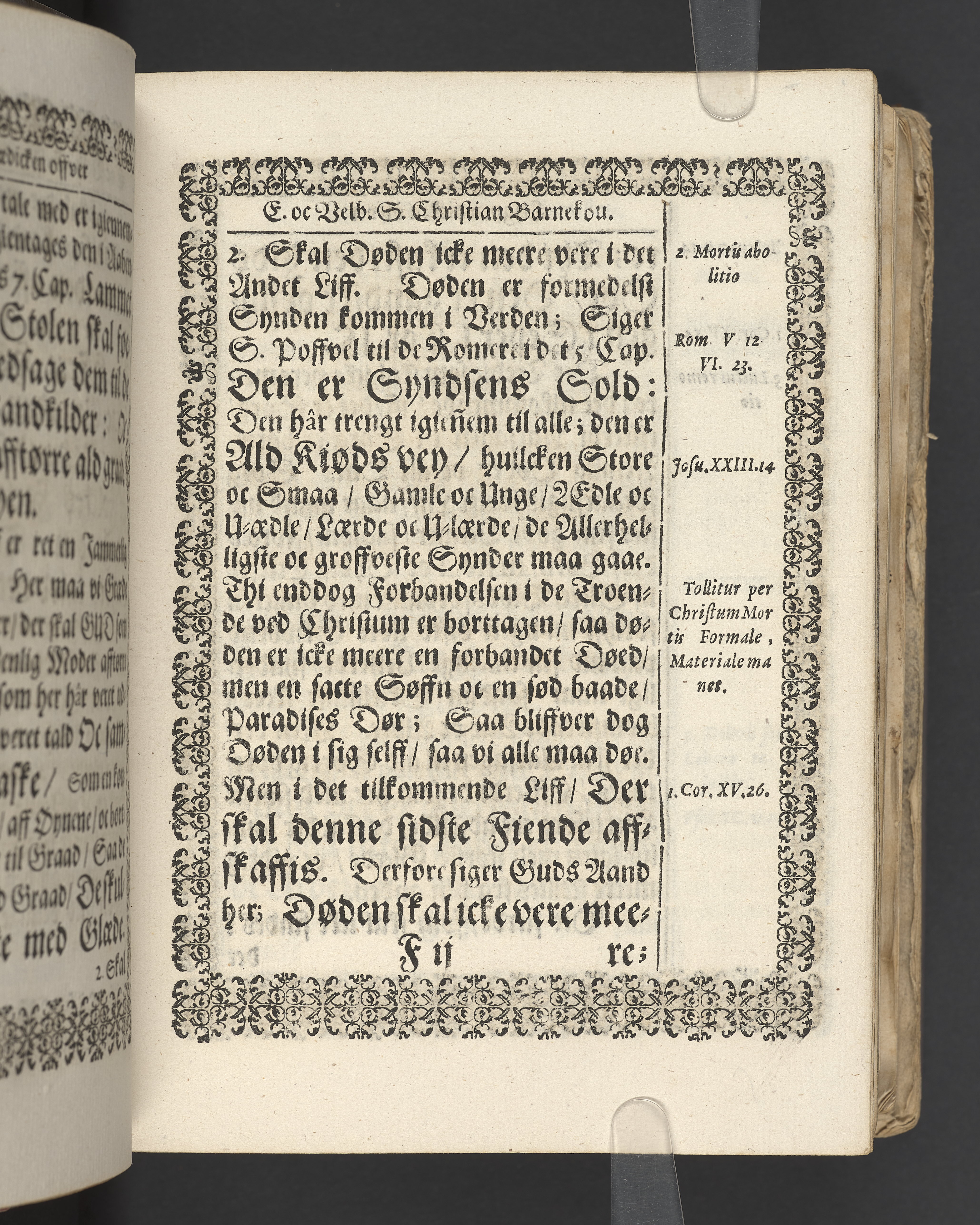 Terrestris tabernaculi destructio et coelestis habitaculi erectio Det er Det Jordiske tabernackels Nedbrydelse Oc Den Himmelske Boliges Oprettelse aff S. Poffvels Andet Sendebreffs V. Capitels 1.2.3.4.5. vers. Udi en Christelig Lijgpredicken Der Aedle/ Velbaarne oc nu Salig hos Gud Christian Barnekou Til Vidskiøffle oc Lilløe etc. Kongl. Maytz. sampt Suerriges Riges Tro mand/ och Høybetroede Vice-Praesident udi den Kongl. Giøtterickes Hof ret udi Jønkiøbing/ Hans Adelige Lijg med Christelige Ceremonier bleff udi mange Velbiurdige oc Fornemme Folckes Haederlige oc Anseelige Forsamling Sørgelig nedsat udi St. Peders Kircke udi Malmøe den 28 Maji Anno 1666. Andraget oc frem sat aff Niels Søffrensen Sougneprest sammestedtz. Kiøbenhafn/ Prentet aff Christen Jensøn Wering Universit. Bogtr. Aar 1666.