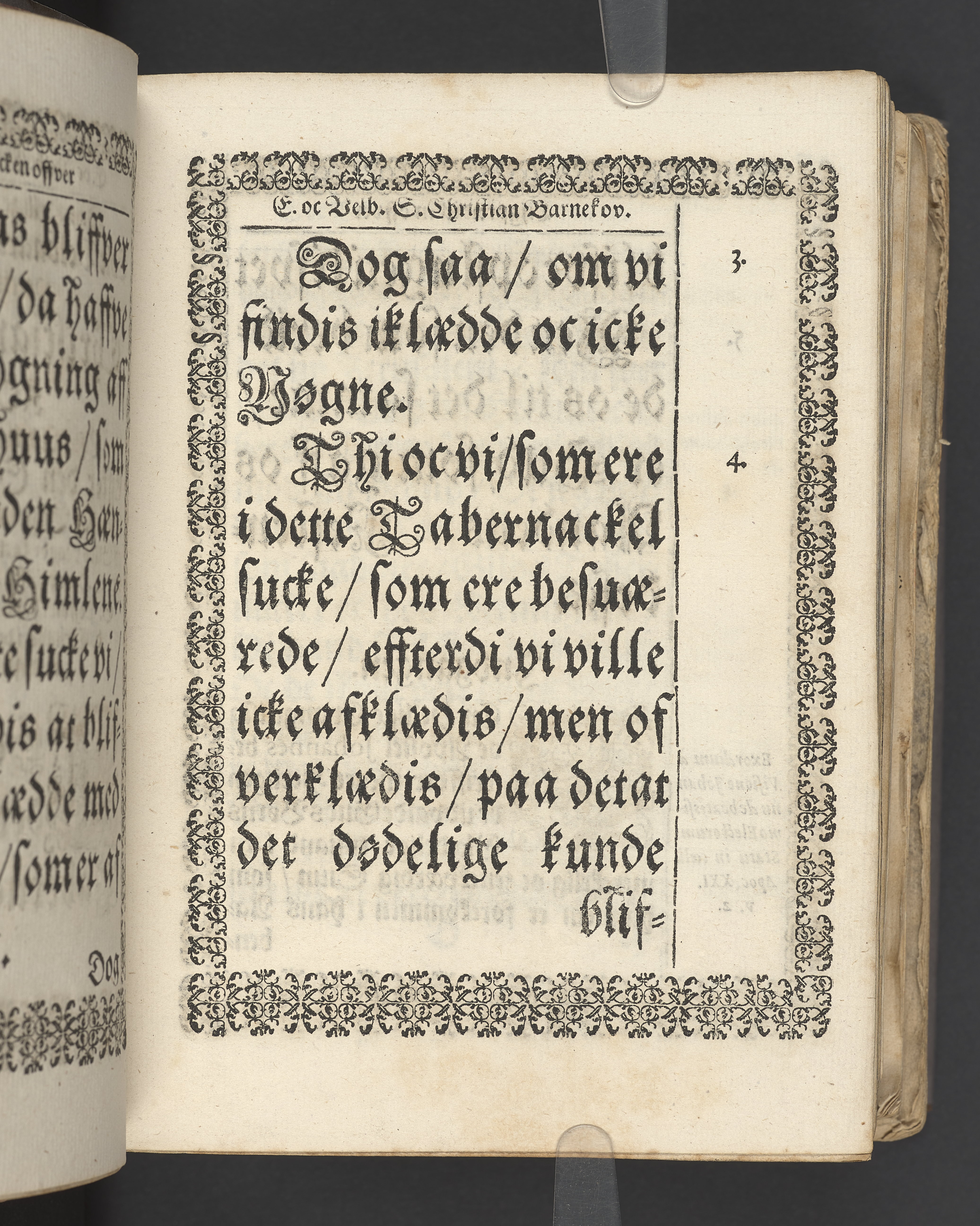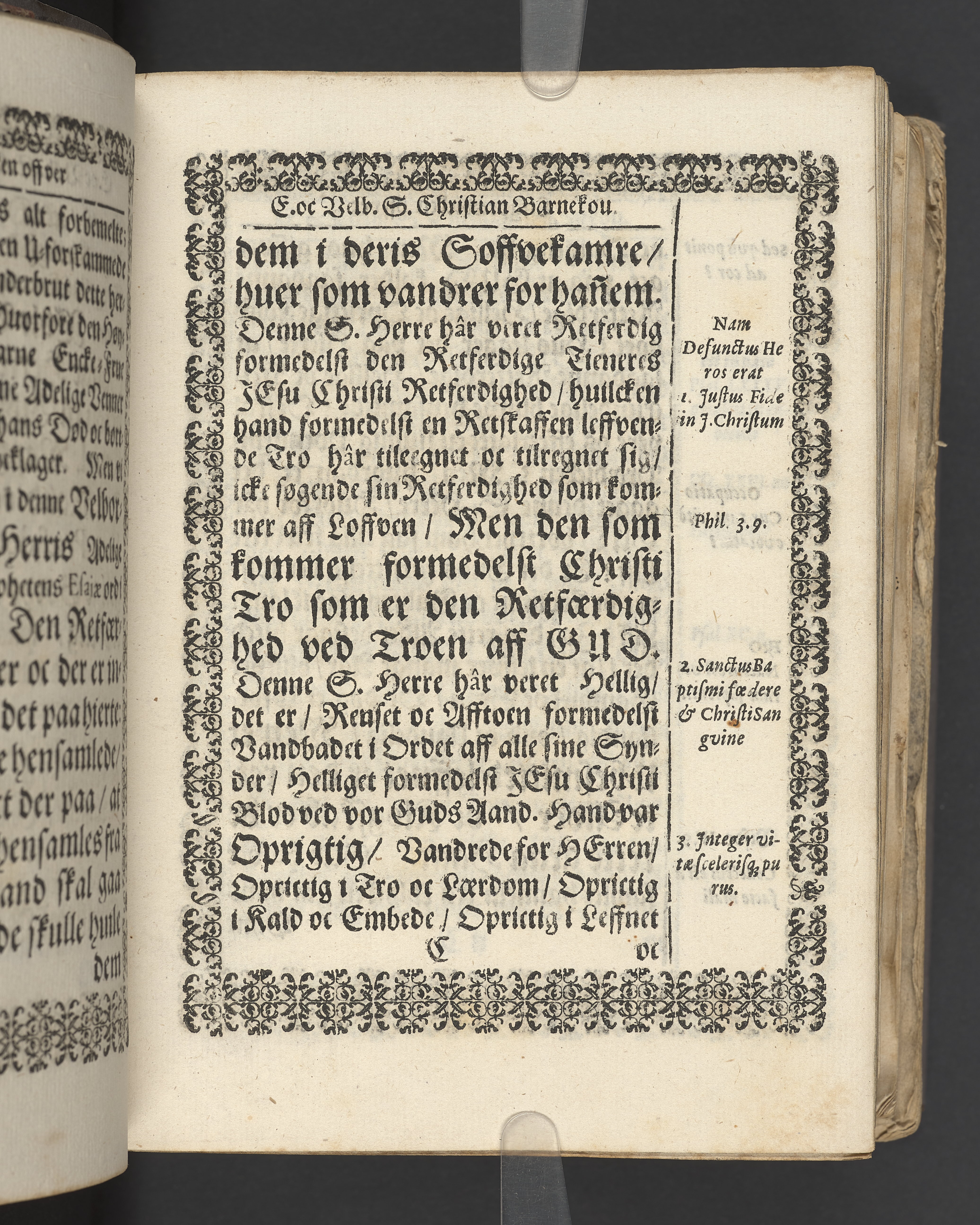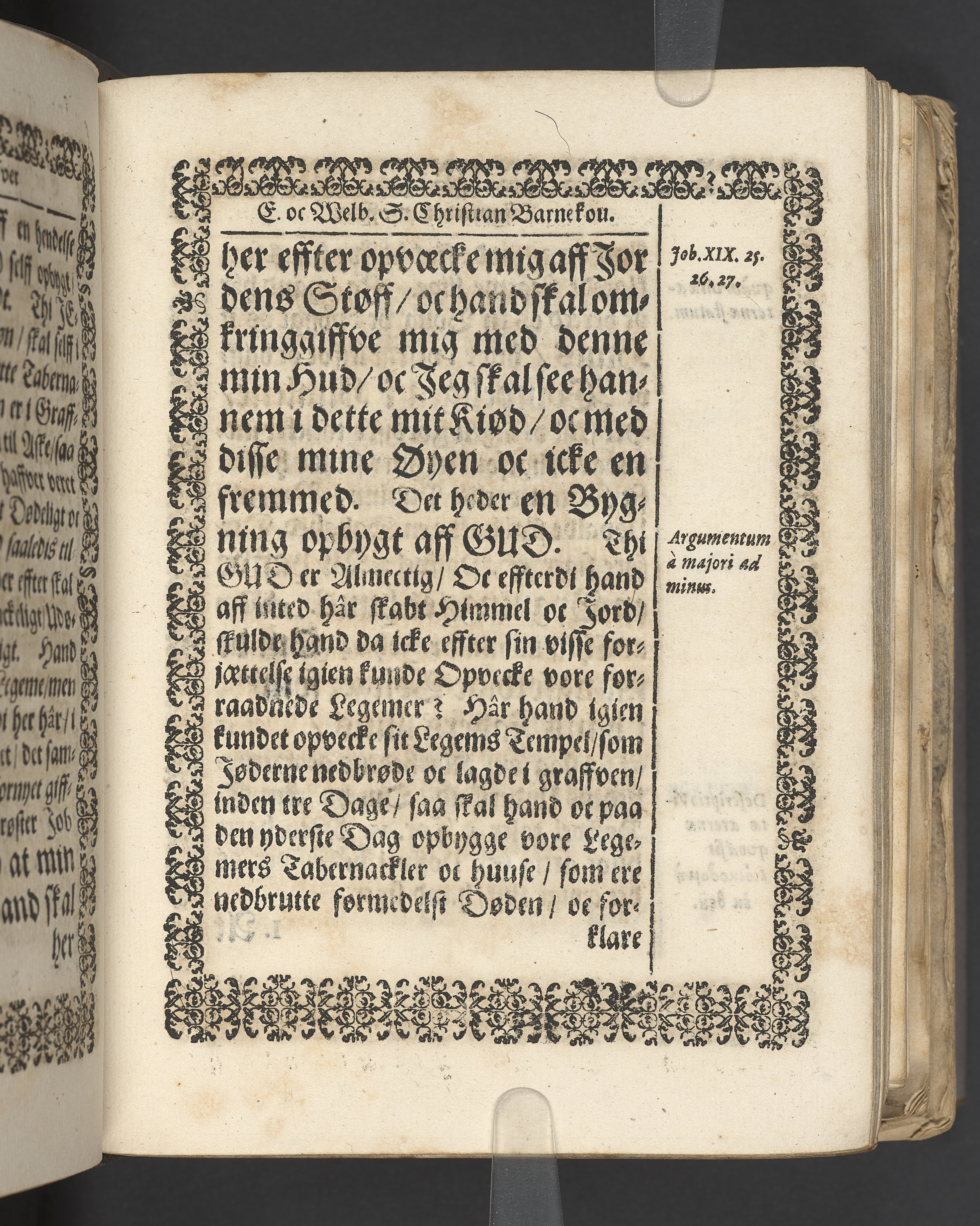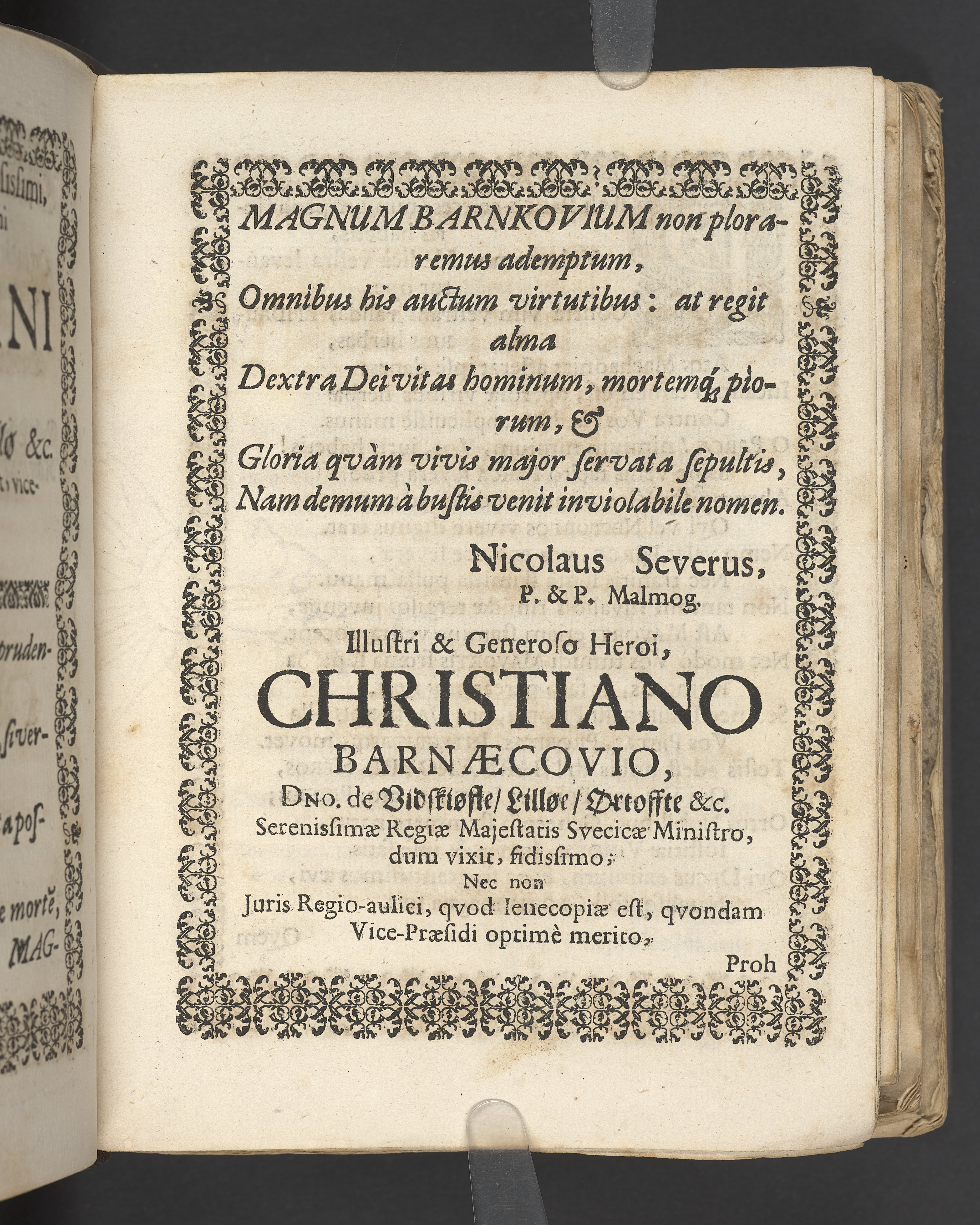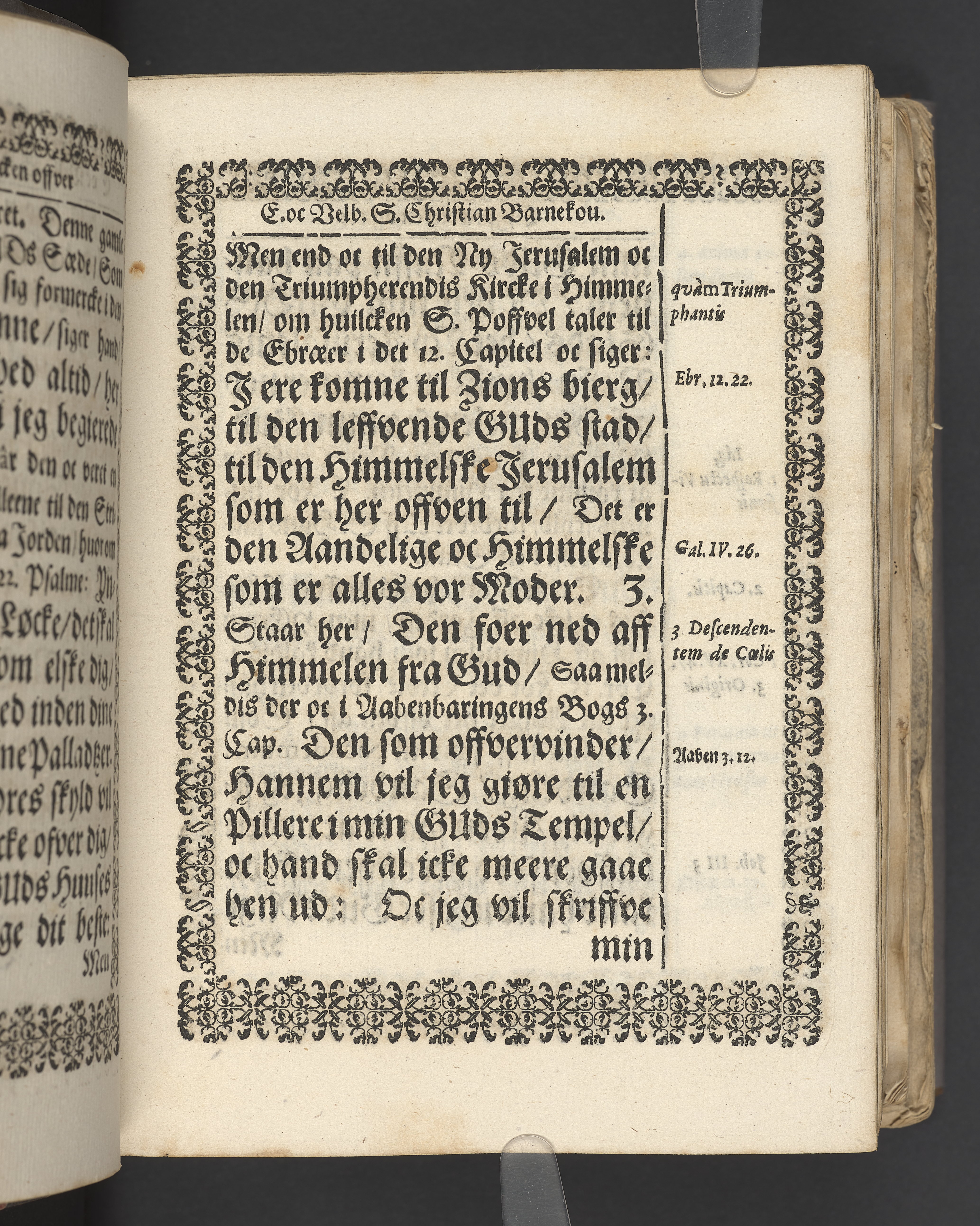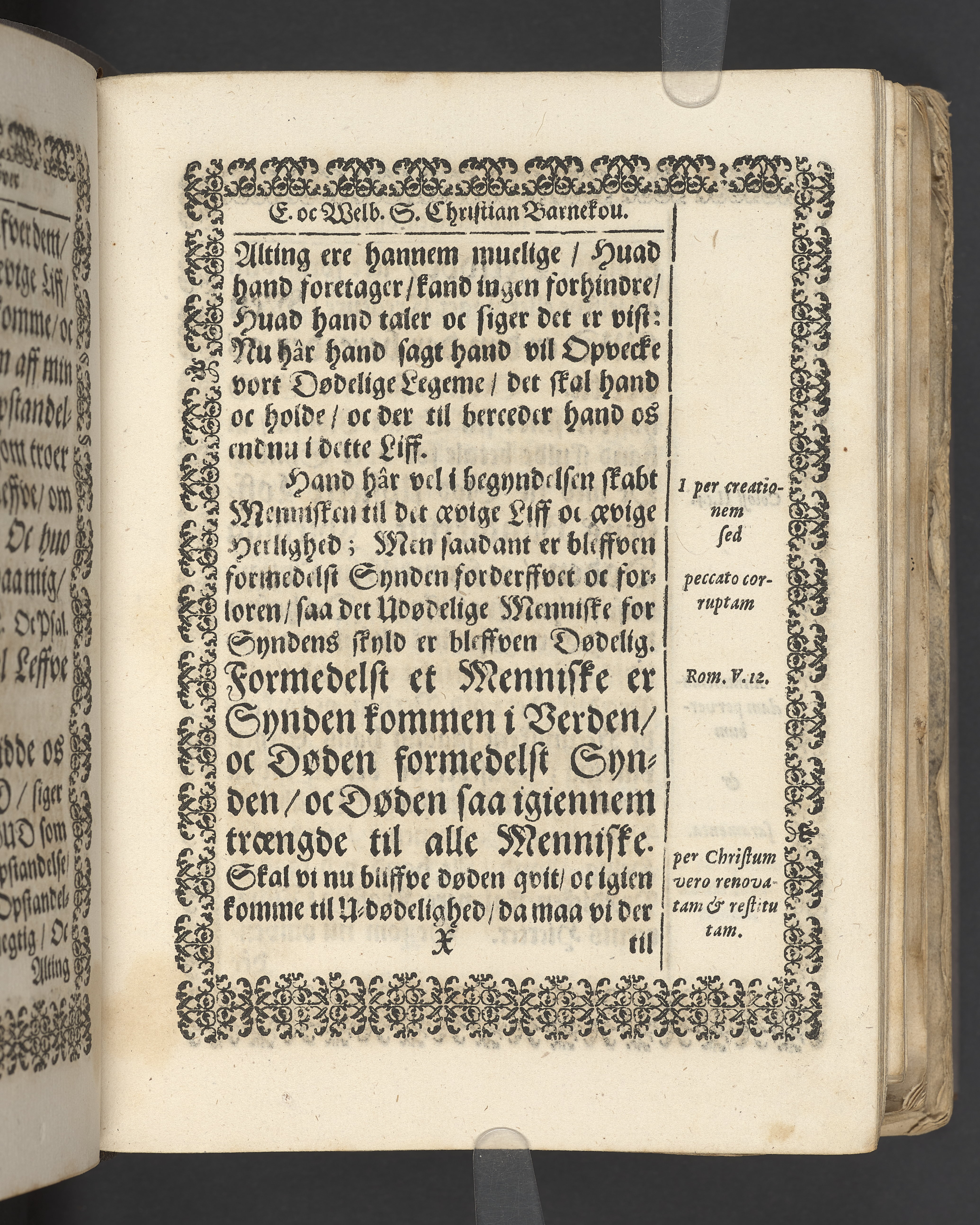 Terrestris tabernaculi destructio et coelestis habitaculi erectio Det er Det Jordiske tabernackels Nedbrydelse Oc Den Himmelske Boliges Oprettelse aff S. Poffvels Andet Sendebreffs V. Capitels 1.2.3.4.5. vers. Udi en Christelig Lijgpredicken Der Aedle/ Velbaarne oc nu Salig hos Gud Christian Barnekou Til Vidskiøffle oc Lilløe etc. Kongl. Maytz. sampt Suerriges Riges Tro mand/ och Høybetroede Vice-Praesident udi den Kongl. Giøtterickes Hof ret udi Jønkiøbing/ Hans Adelige Lijg med Christelige Ceremonier bleff udi mange Velbiurdige oc Fornemme Folckes Haederlige oc Anseelige Forsamling Sørgelig nedsat udi St. Peders Kircke udi Malmøe den 28 Maji Anno 1666. Andraget oc frem sat aff Niels Søffrensen Sougneprest sammestedtz. Kiøbenhafn/ Prentet aff Christen Jensøn Wering Universit. Bogtr. Aar 1666.