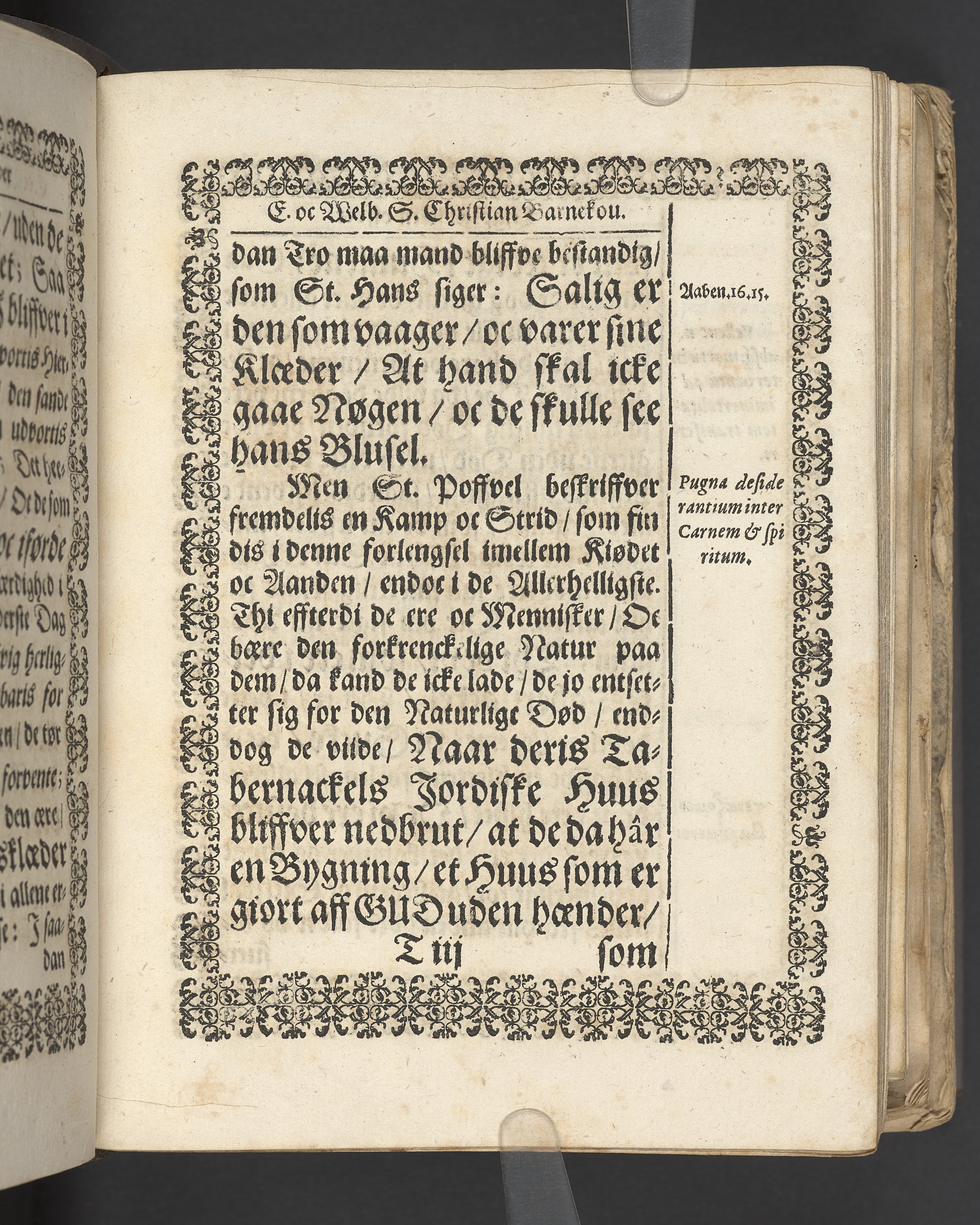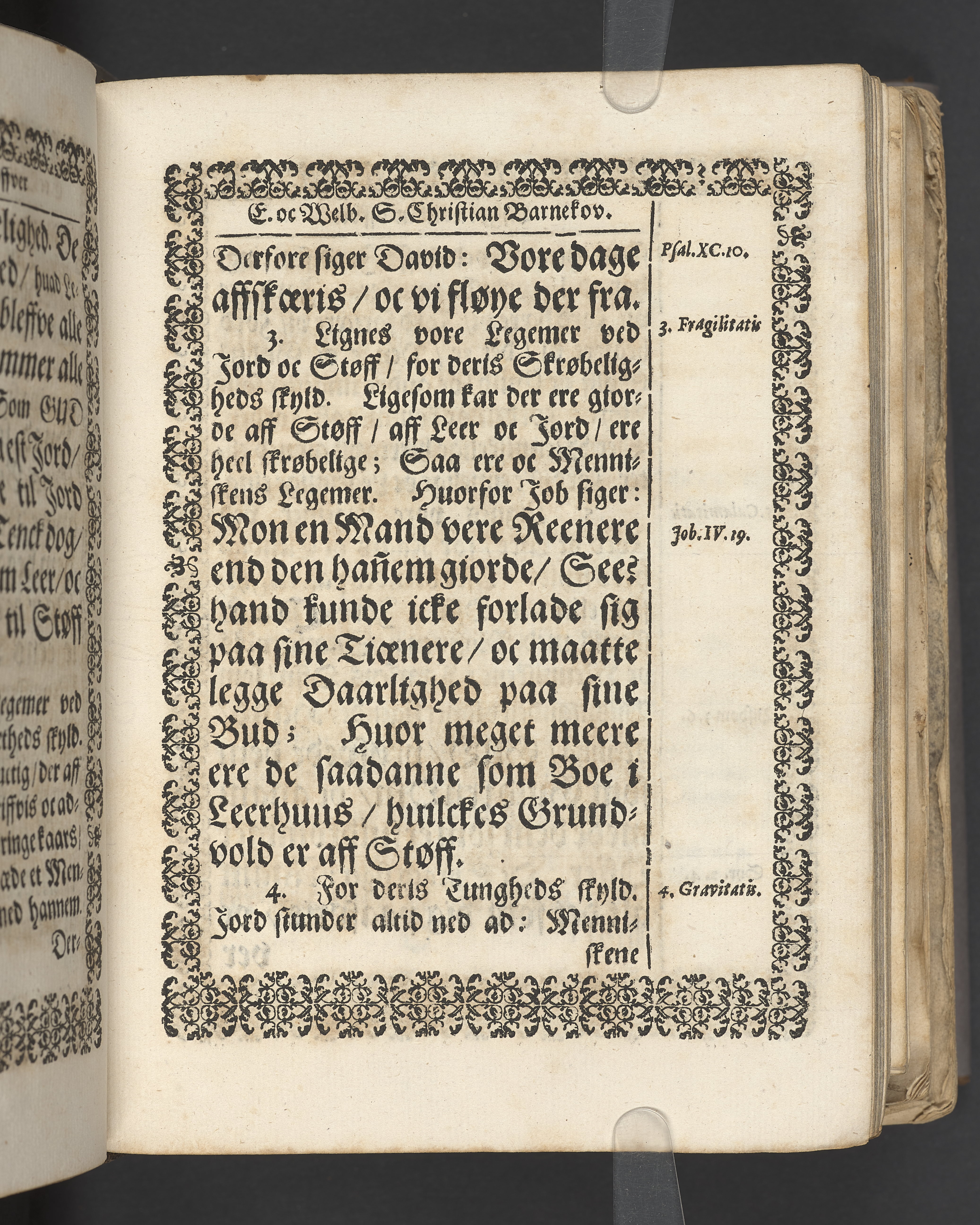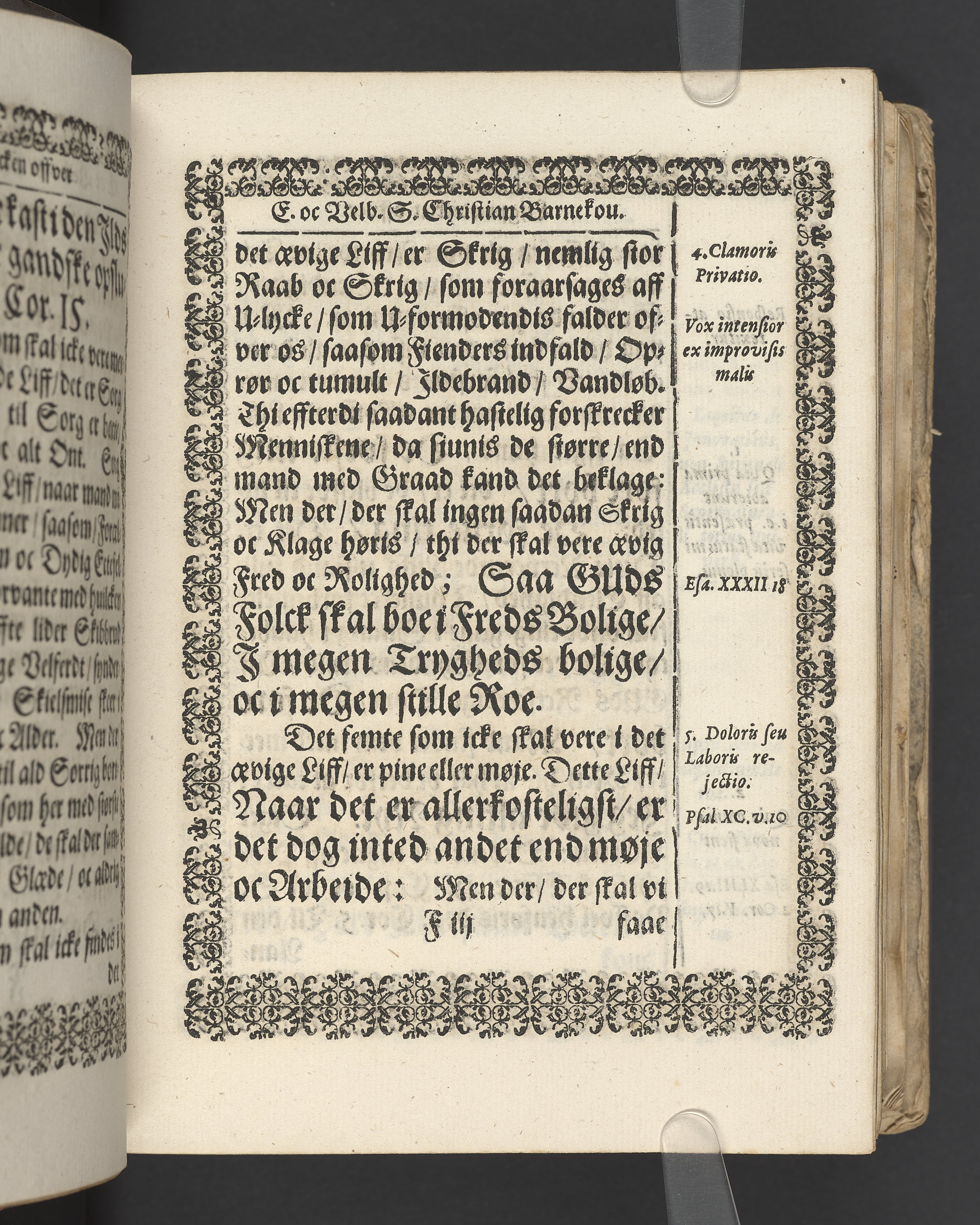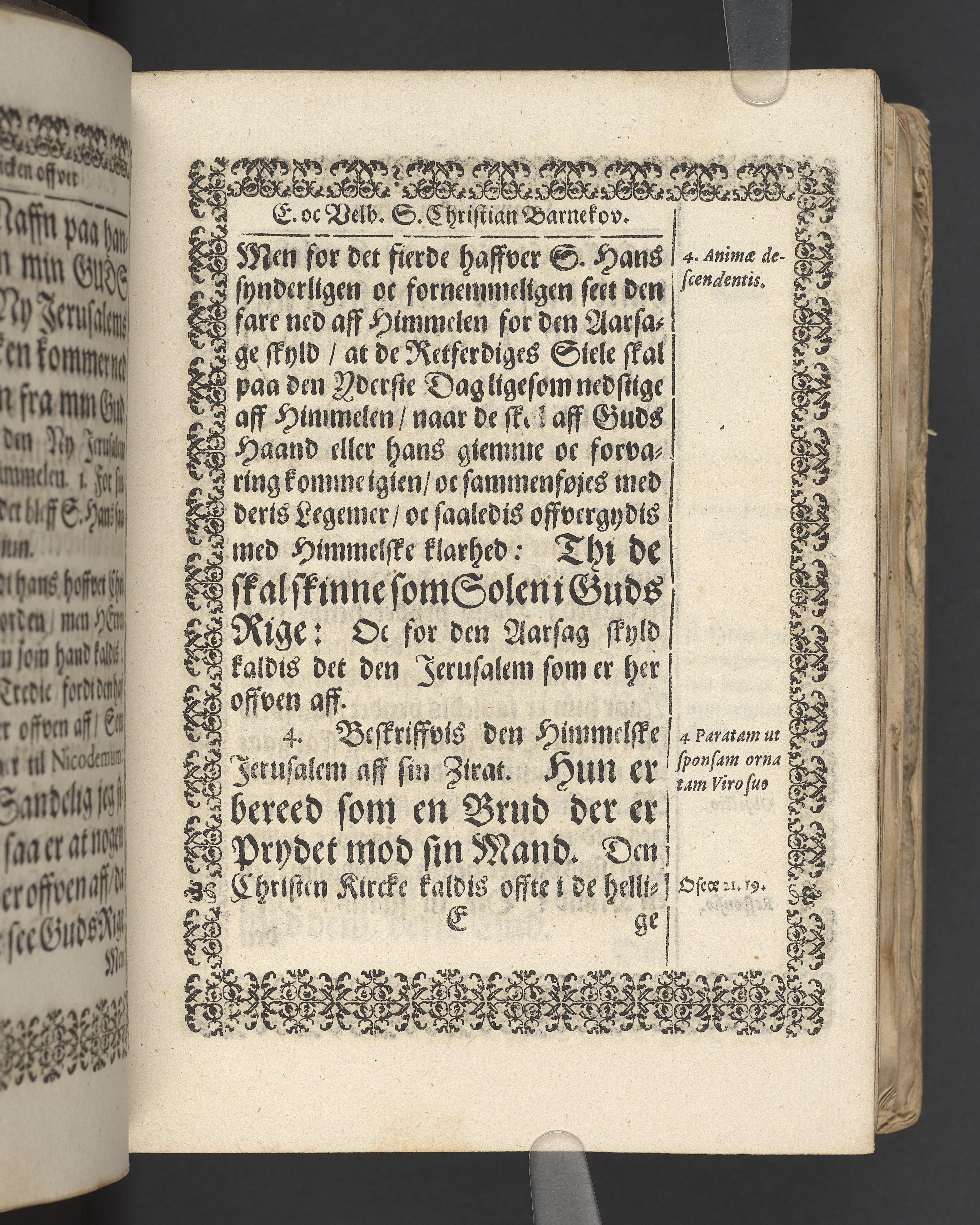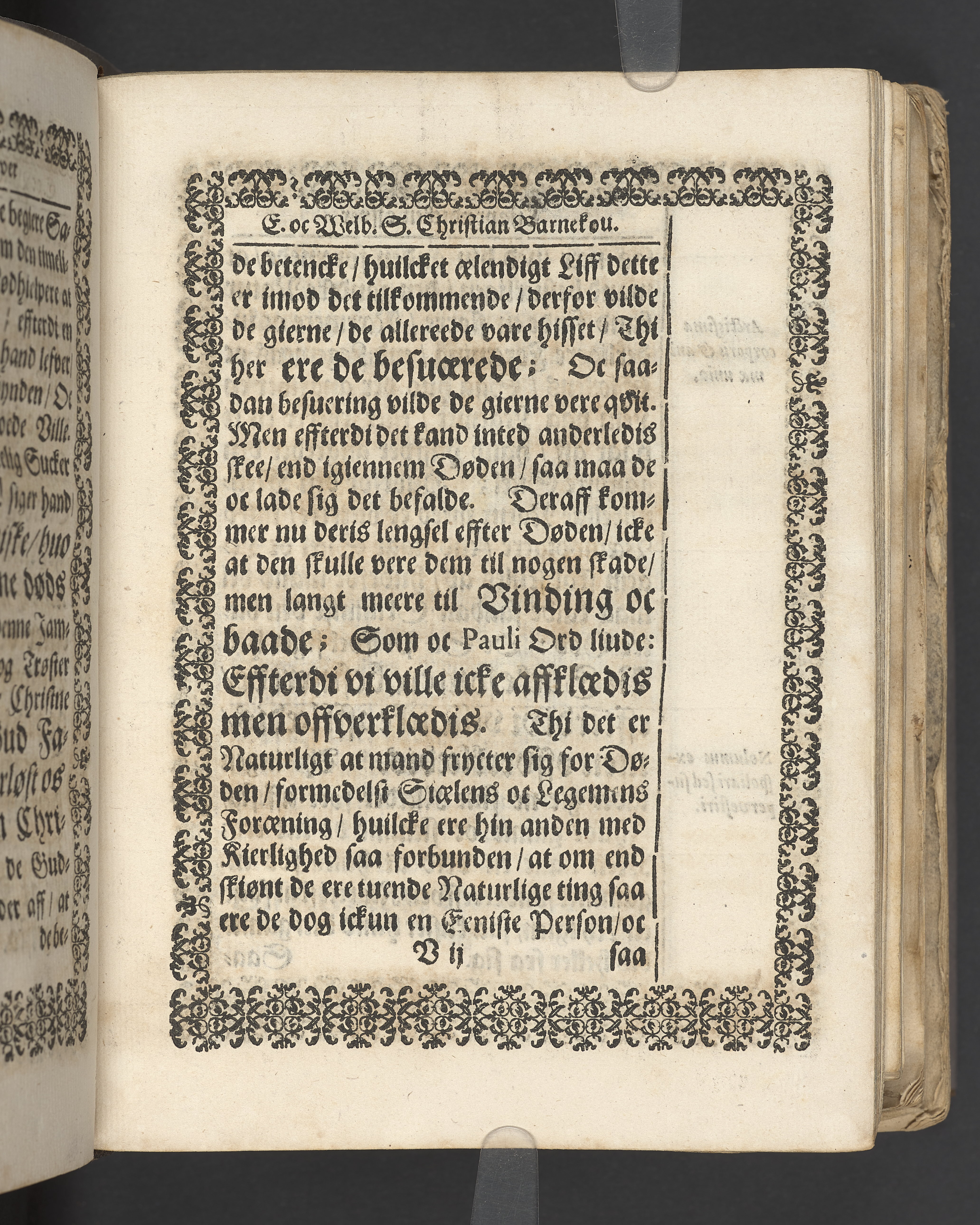 Terrestris tabernaculi destructio et coelestis habitaculi erectio Det er Det Jordiske tabernackels Nedbrydelse Oc Den Himmelske Boliges Oprettelse aff S. Poffvels Andet Sendebreffs V. Capitels 1.2.3.4.5. vers. Udi en Christelig Lijgpredicken Der Aedle/ Velbaarne oc nu Salig hos Gud Christian Barnekou Til Vidskiøffle oc Lilløe etc. Kongl. Maytz. sampt Suerriges Riges Tro mand/ och Høybetroede Vice-Praesident udi den Kongl. Giøtterickes Hof ret udi Jønkiøbing/ Hans Adelige Lijg med Christelige Ceremonier bleff udi mange Velbiurdige oc Fornemme Folckes Haederlige oc Anseelige Forsamling Sørgelig nedsat udi St. Peders Kircke udi Malmøe den 28 Maji Anno 1666. Andraget oc frem sat aff Niels Søffrensen Sougneprest sammestedtz. Kiøbenhafn/ Prentet aff Christen Jensøn Wering Universit. Bogtr. Aar 1666.