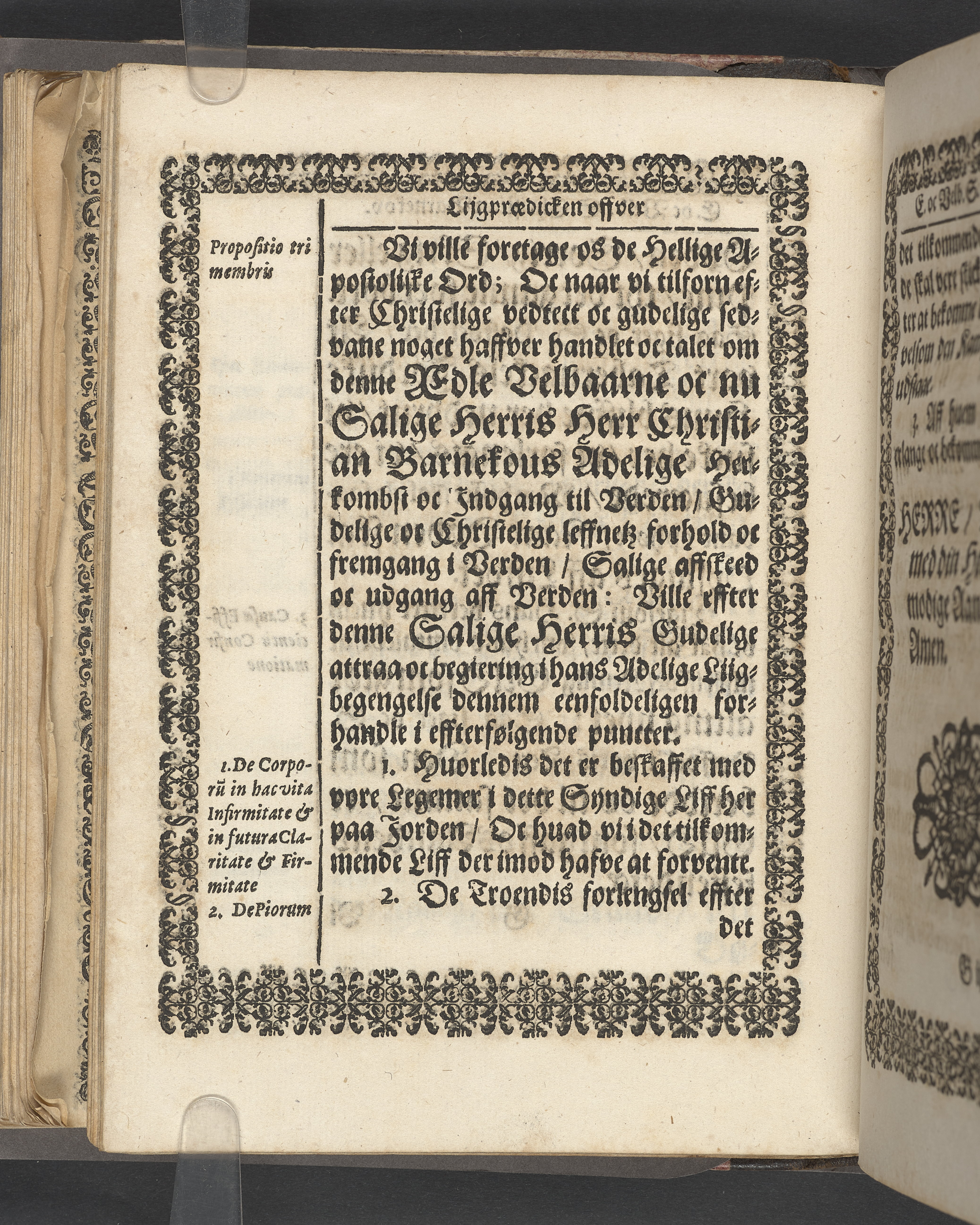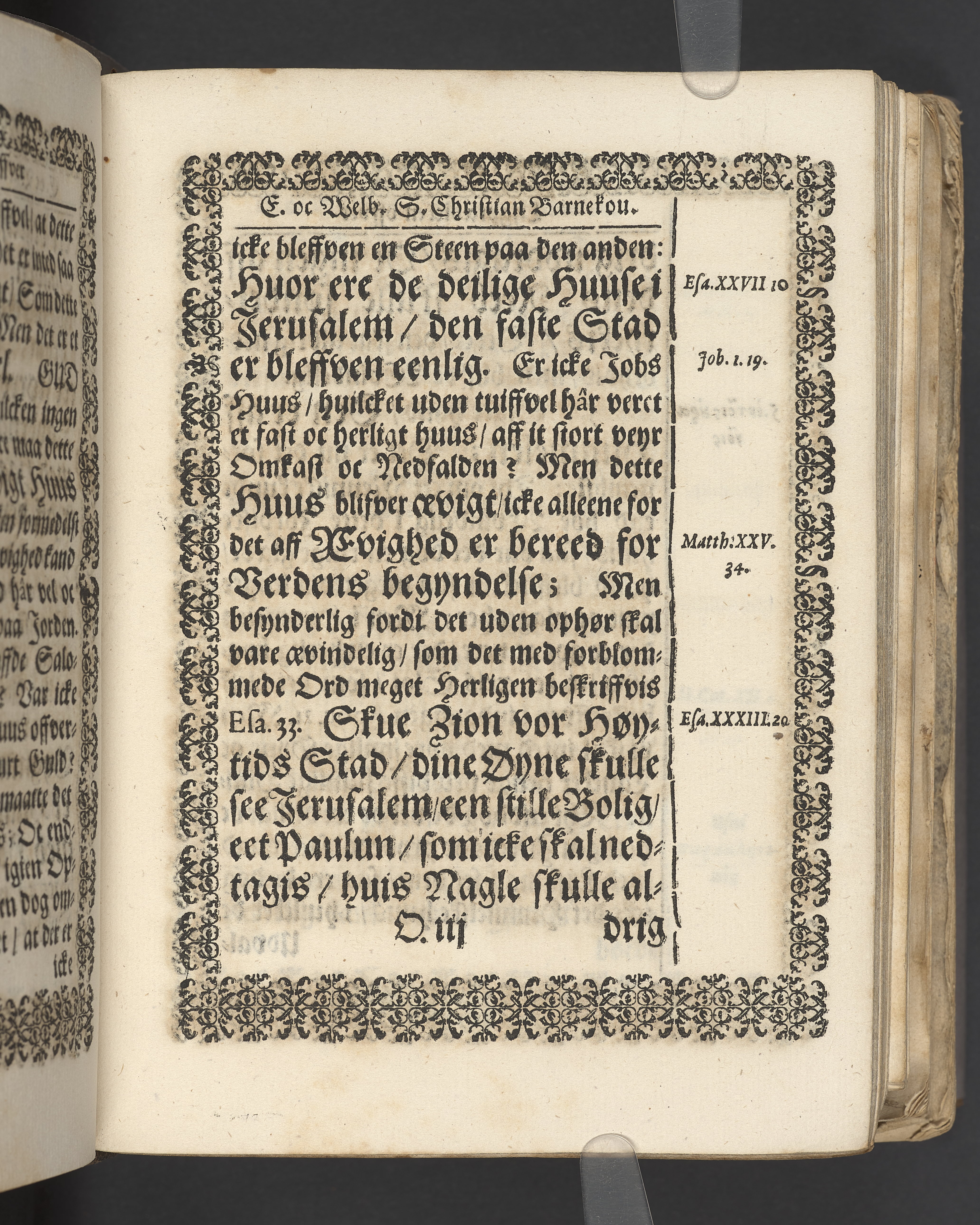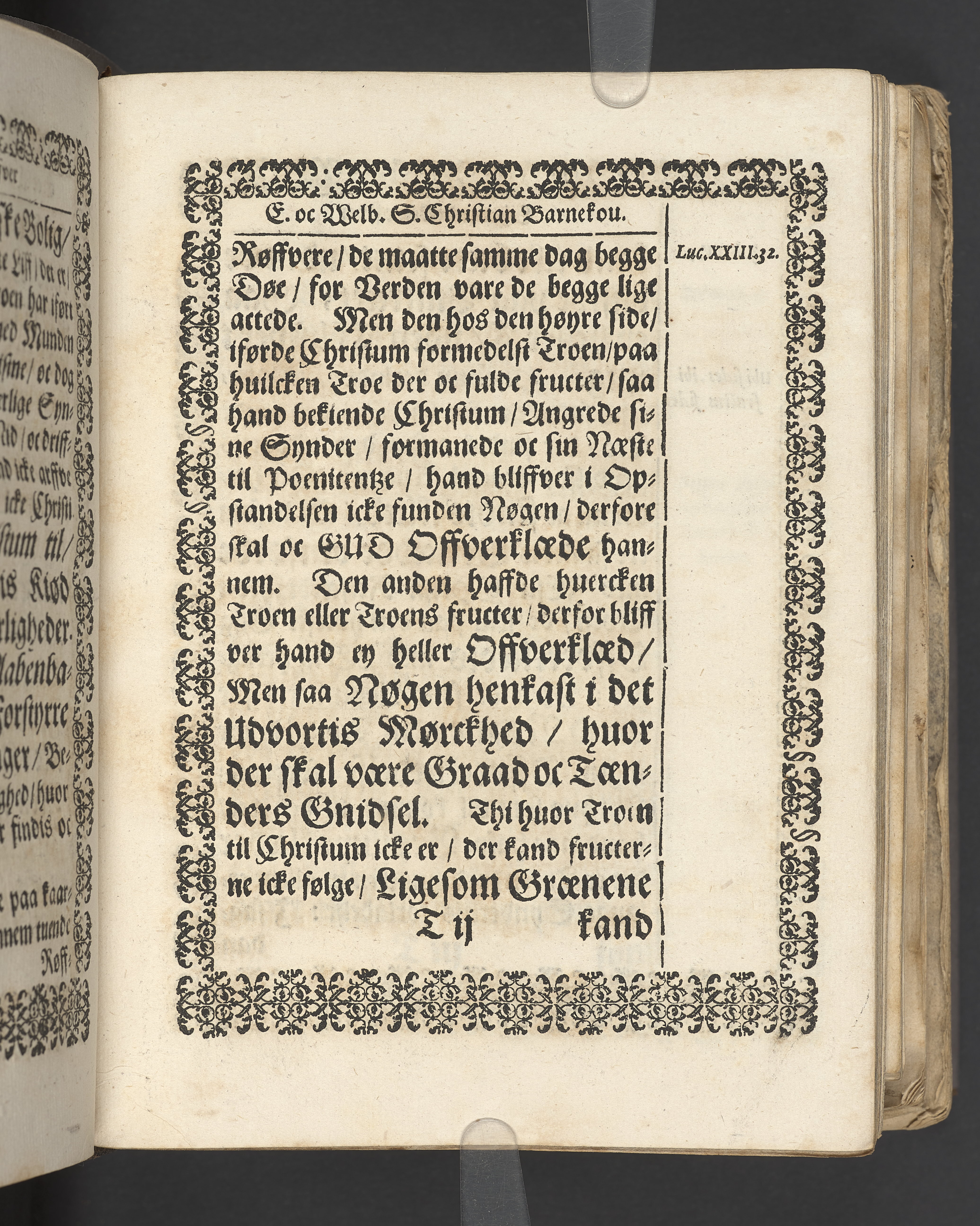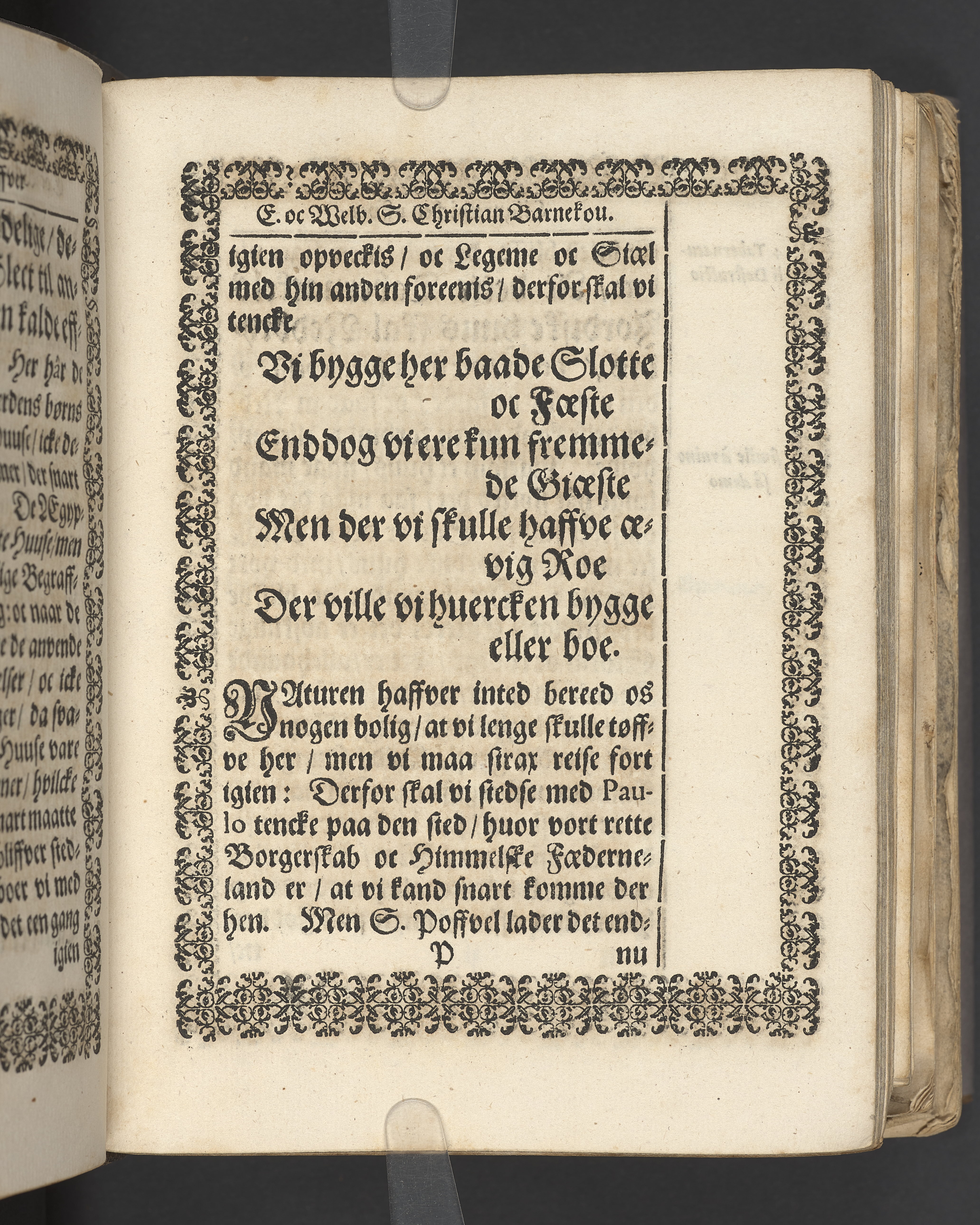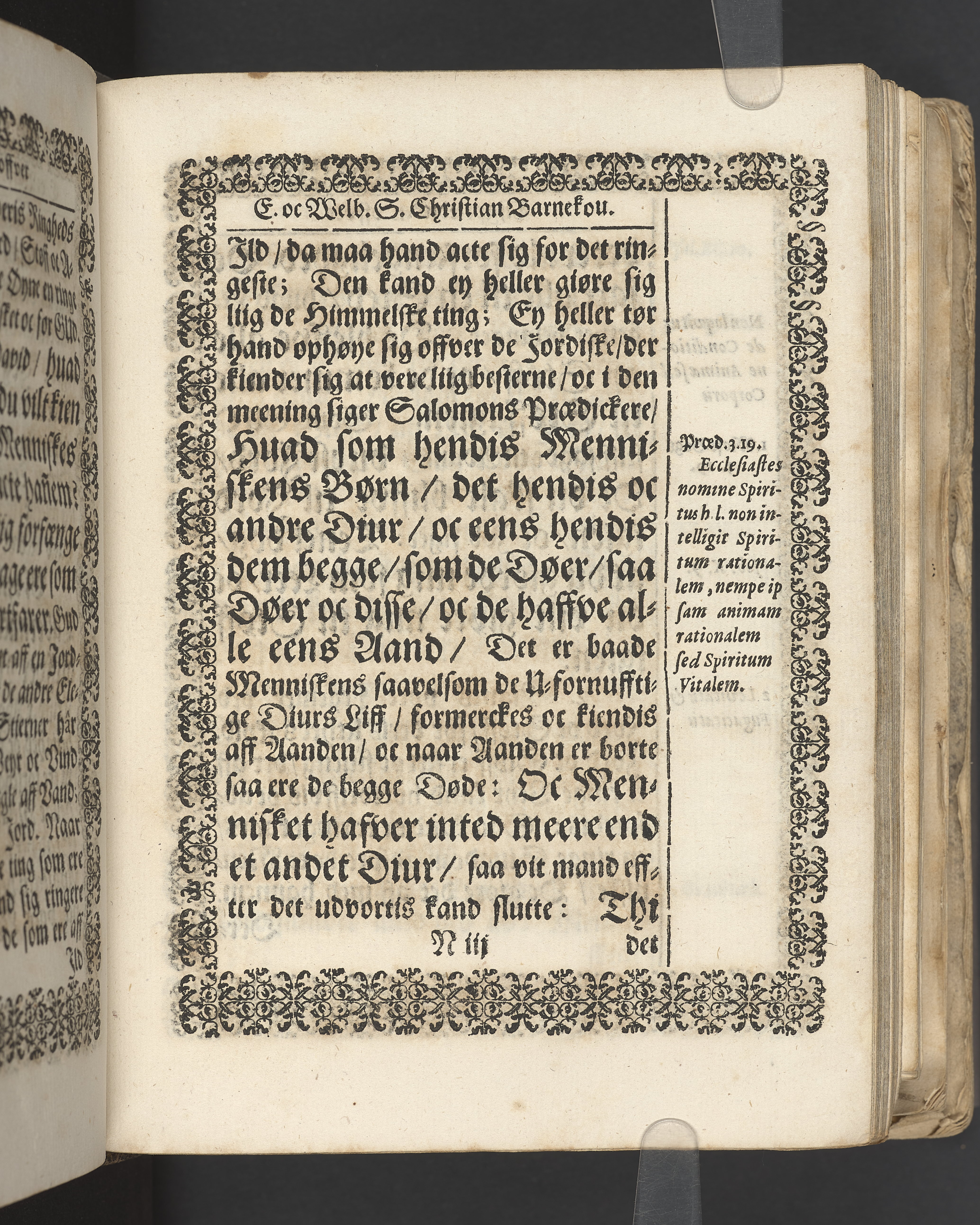 Terrestris tabernaculi destructio et coelestis habitaculi erectio Det er Det Jordiske tabernackels Nedbrydelse Oc Den Himmelske Boliges Oprettelse aff S. Poffvels Andet Sendebreffs V. Capitels 1.2.3.4.5. vers. Udi en Christelig Lijgpredicken Der Aedle/ Velbaarne oc nu Salig hos Gud Christian Barnekou Til Vidskiøffle oc Lilløe etc. Kongl. Maytz. sampt Suerriges Riges Tro mand/ och Høybetroede Vice-Praesident udi den Kongl. Giøtterickes Hof ret udi Jønkiøbing/ Hans Adelige Lijg med Christelige Ceremonier bleff udi mange Velbiurdige oc Fornemme Folckes Haederlige oc Anseelige Forsamling Sørgelig nedsat udi St. Peders Kircke udi Malmøe den 28 Maji Anno 1666. Andraget oc frem sat aff Niels Søffrensen Sougneprest sammestedtz. Kiøbenhafn/ Prentet aff Christen Jensøn Wering Universit. Bogtr. Aar 1666.