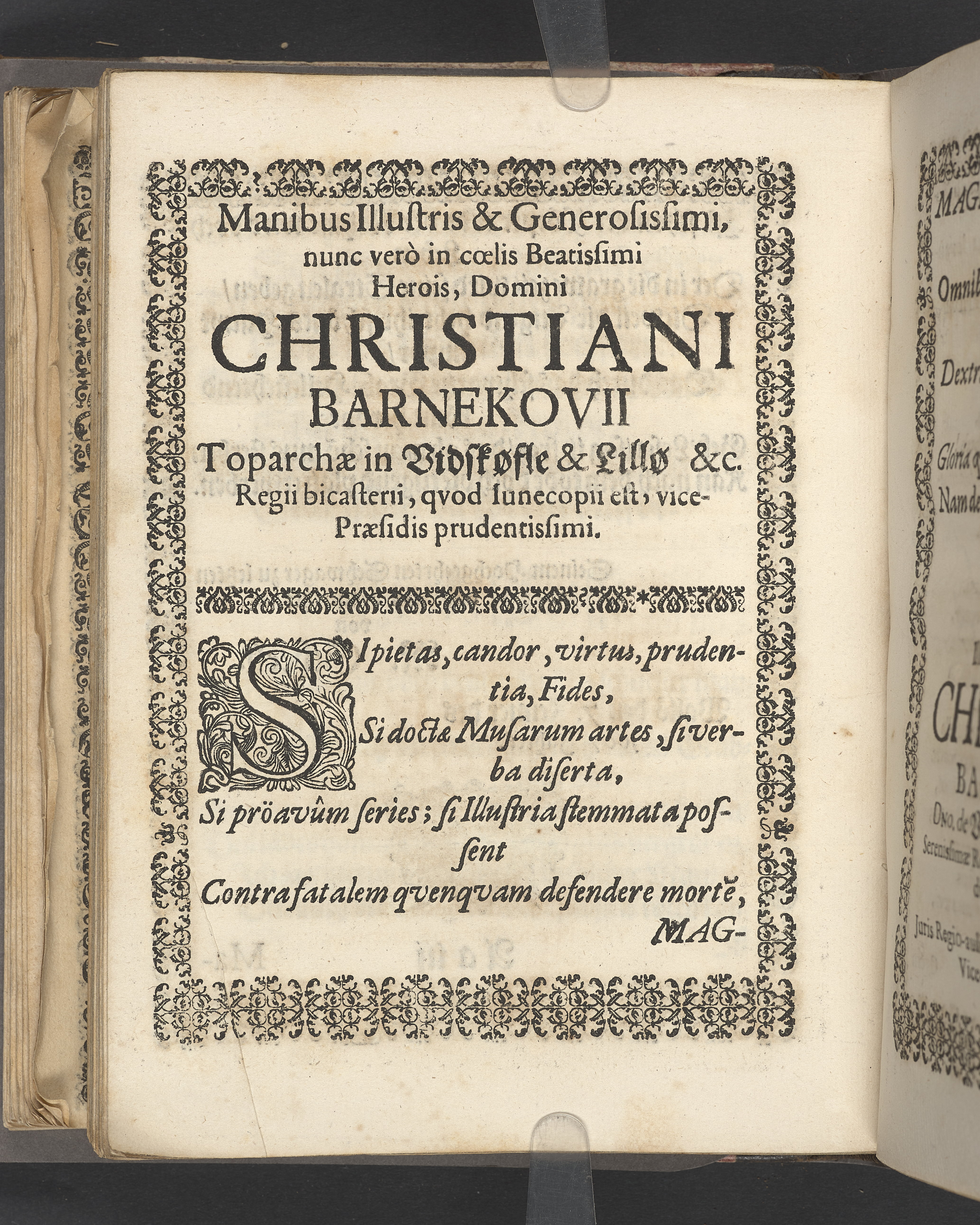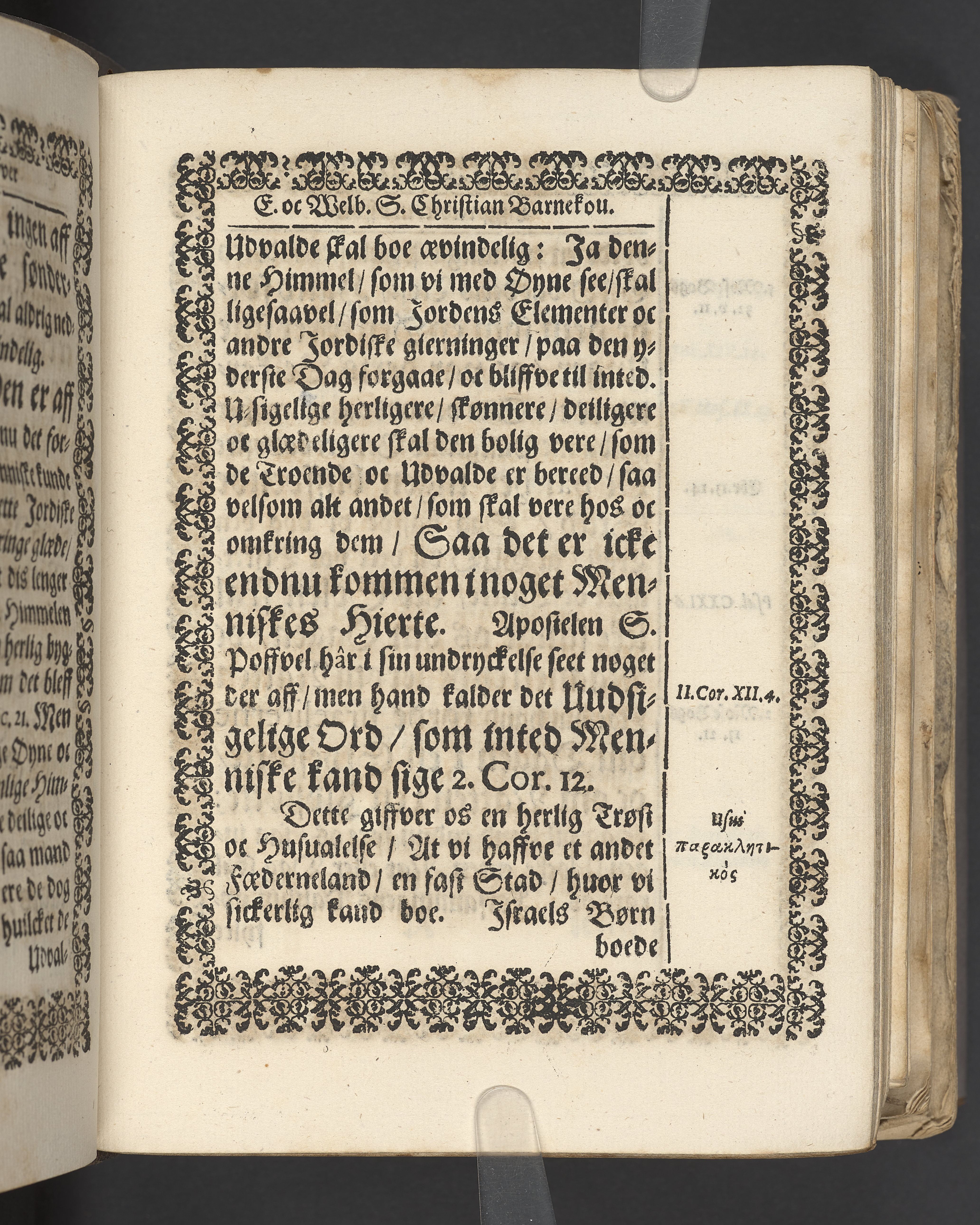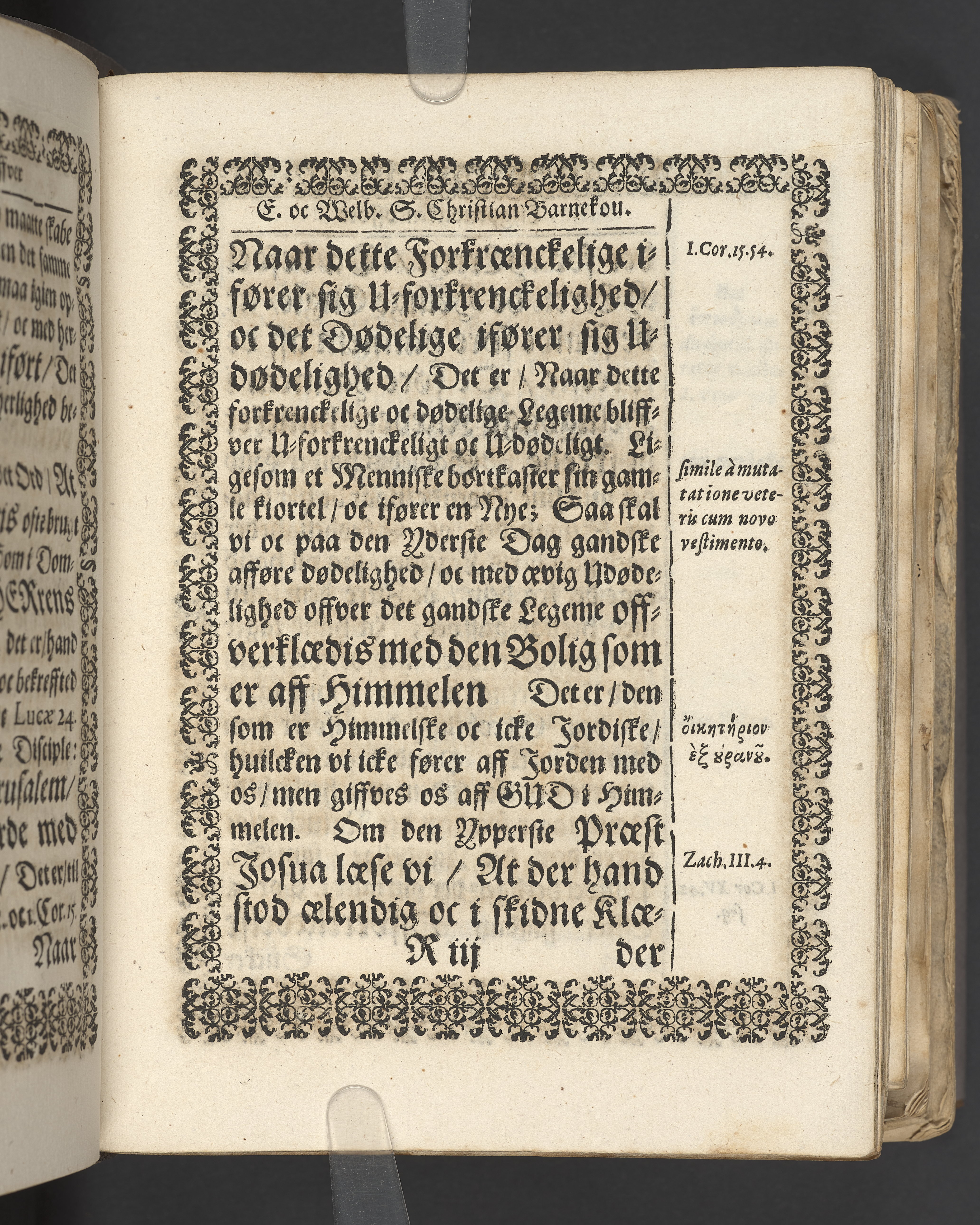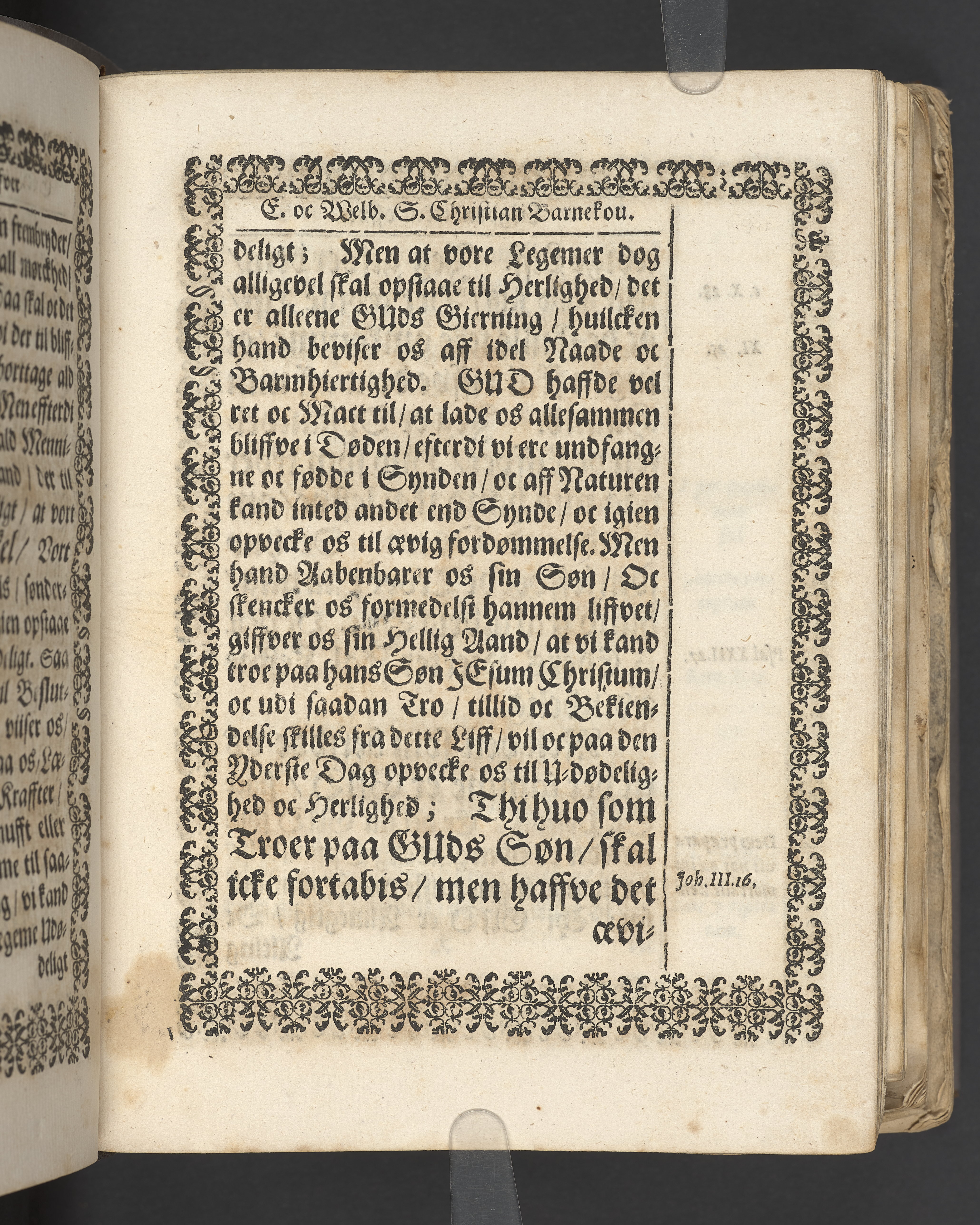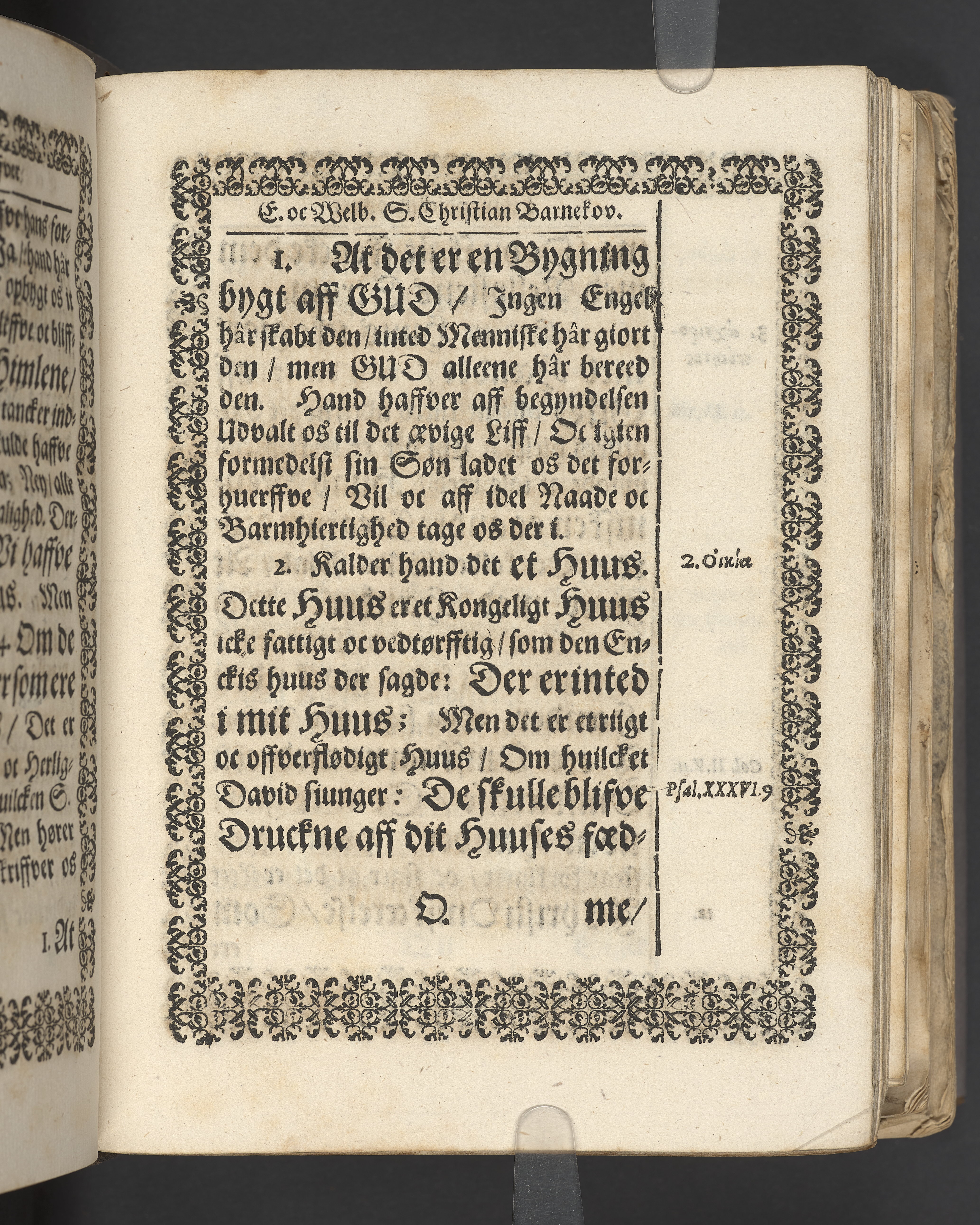 Terrestris tabernaculi destructio et coelestis habitaculi erectio Det er Det Jordiske tabernackels Nedbrydelse Oc Den Himmelske Boliges Oprettelse aff S. Poffvels Andet Sendebreffs V. Capitels 1.2.3.4.5. vers. Udi en Christelig Lijgpredicken Der Aedle/ Velbaarne oc nu Salig hos Gud Christian Barnekou Til Vidskiøffle oc Lilløe etc. Kongl. Maytz. sampt Suerriges Riges Tro mand/ och Høybetroede Vice-Praesident udi den Kongl. Giøtterickes Hof ret udi Jønkiøbing/ Hans Adelige Lijg med Christelige Ceremonier bleff udi mange Velbiurdige oc Fornemme Folckes Haederlige oc Anseelige Forsamling Sørgelig nedsat udi St. Peders Kircke udi Malmøe den 28 Maji Anno 1666. Andraget oc frem sat aff Niels Søffrensen Sougneprest sammestedtz. Kiøbenhafn/ Prentet aff Christen Jensøn Wering Universit. Bogtr. Aar 1666.