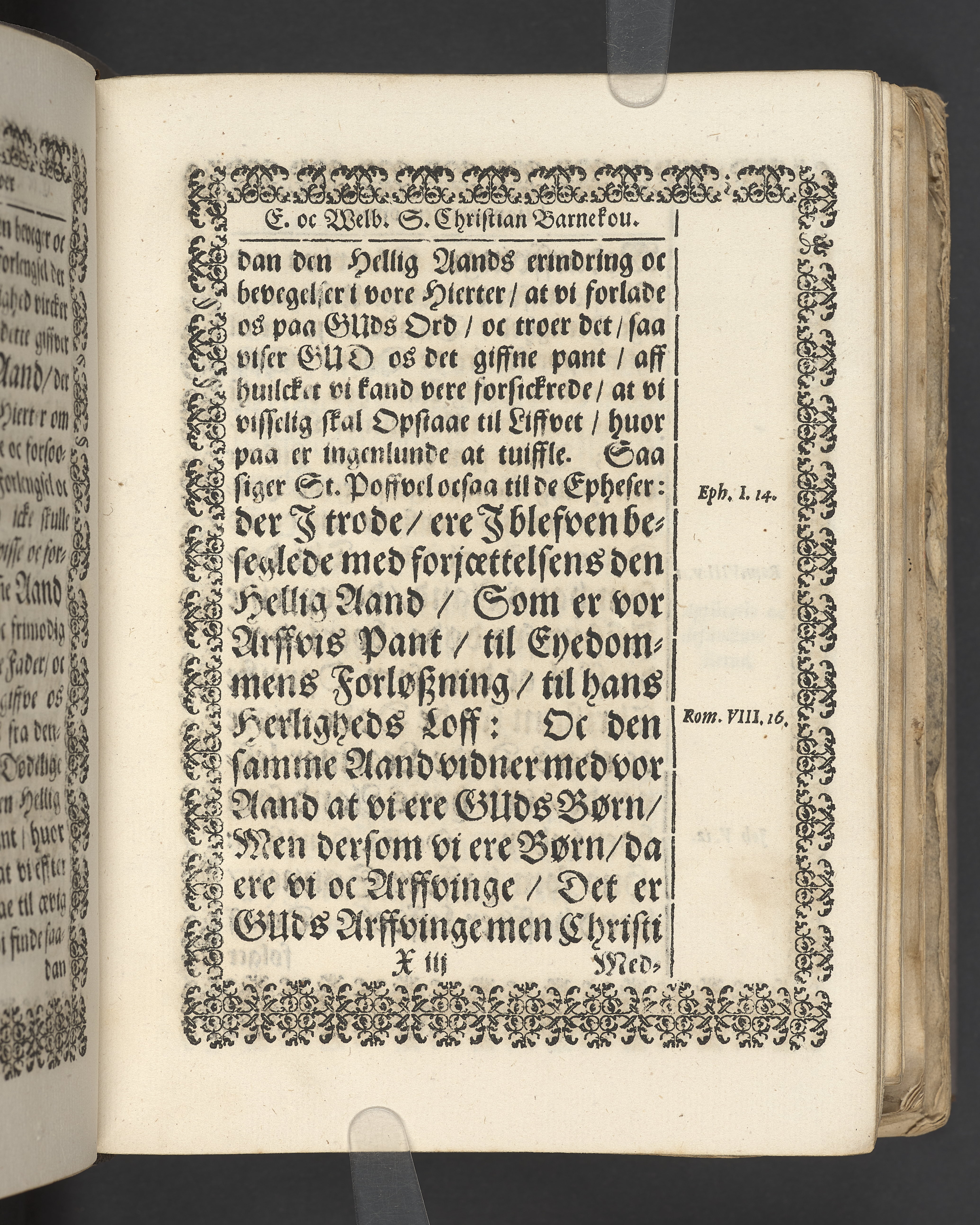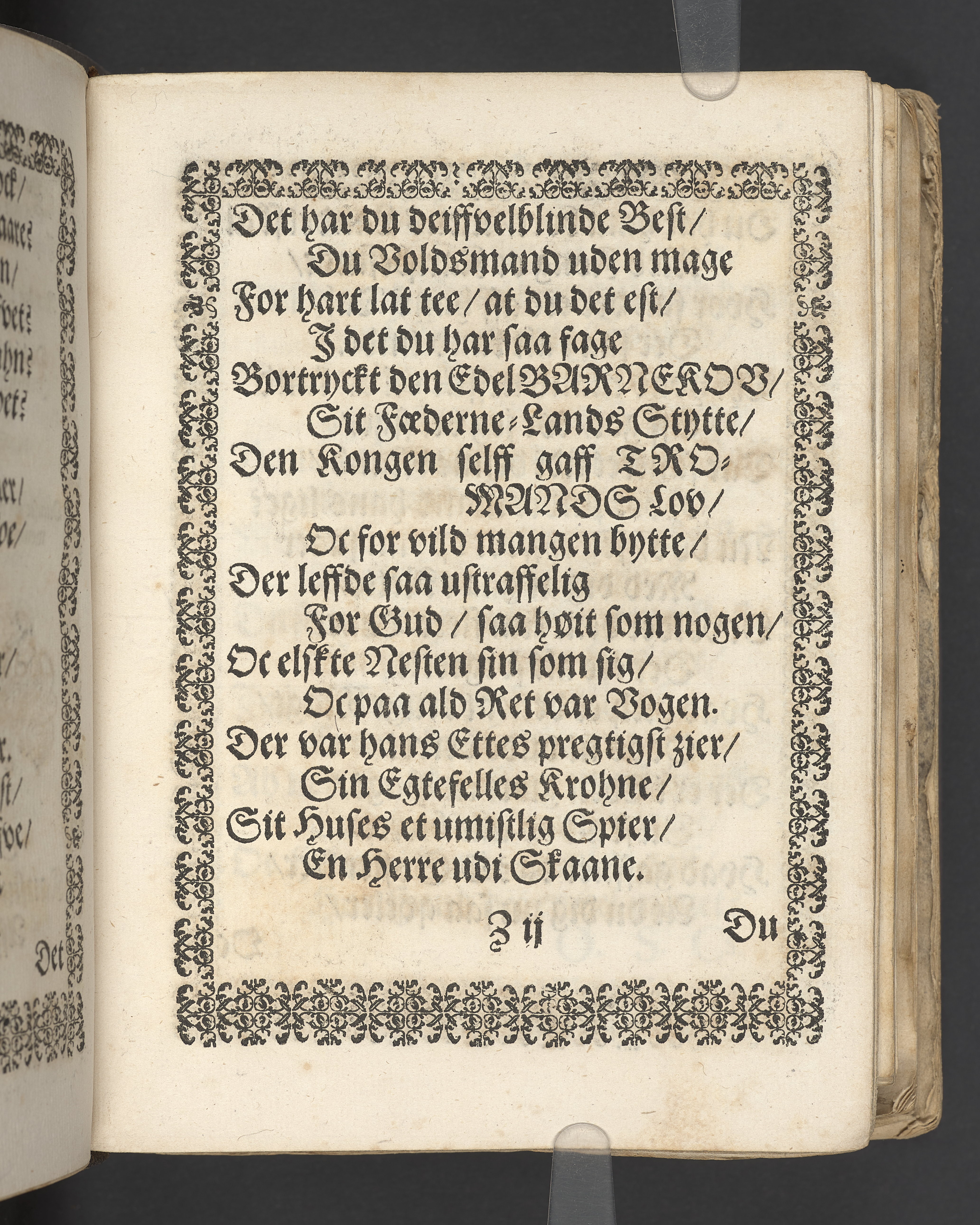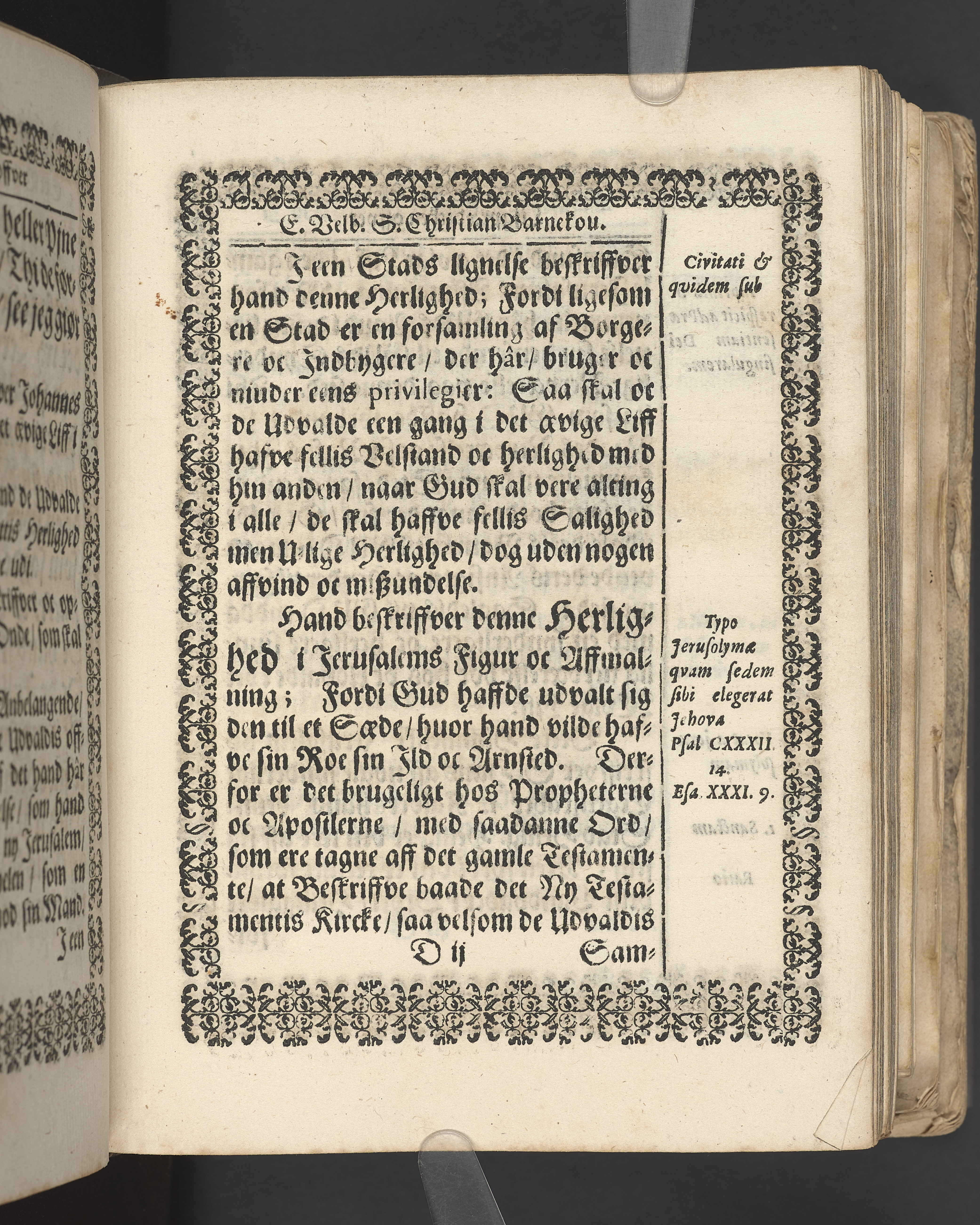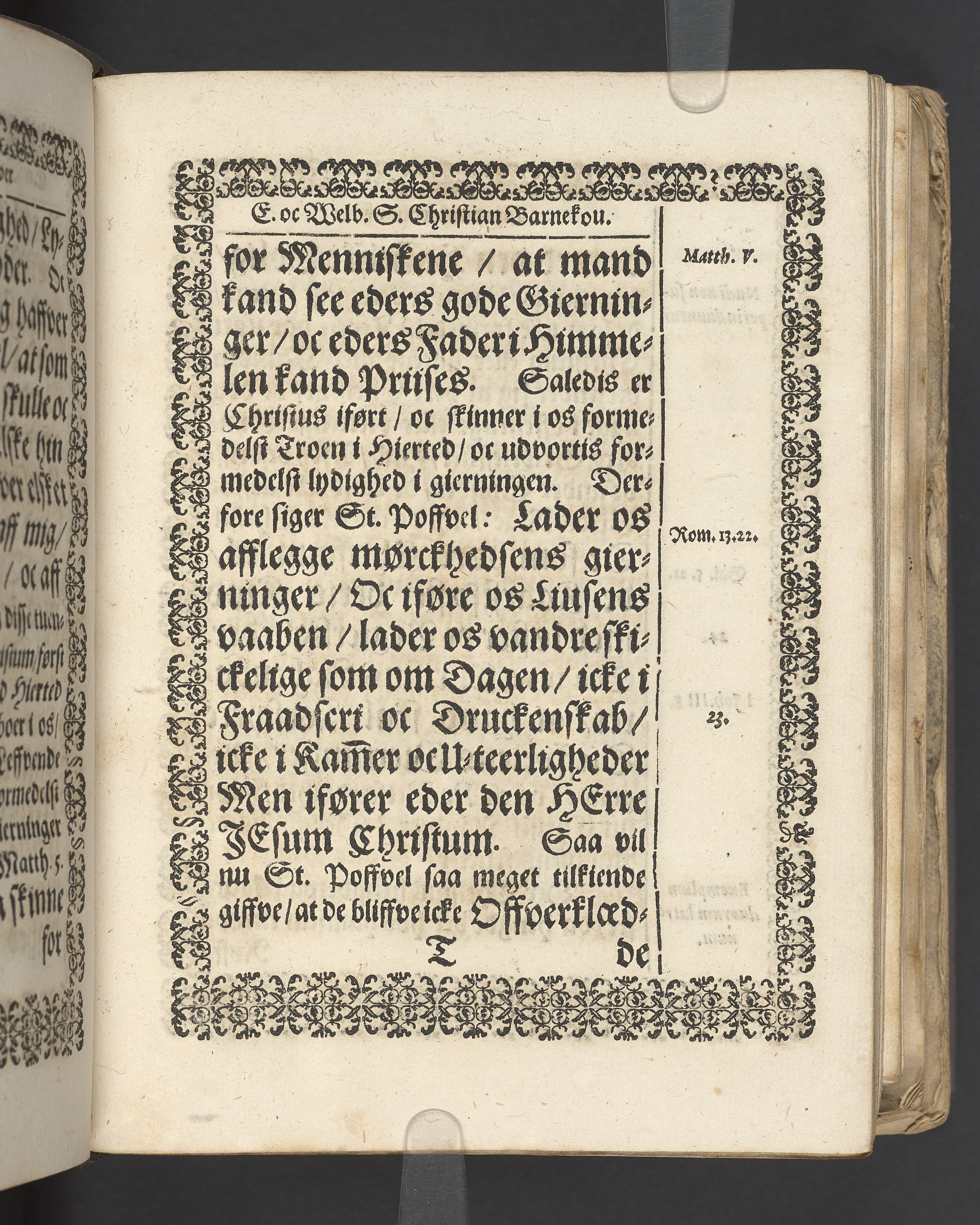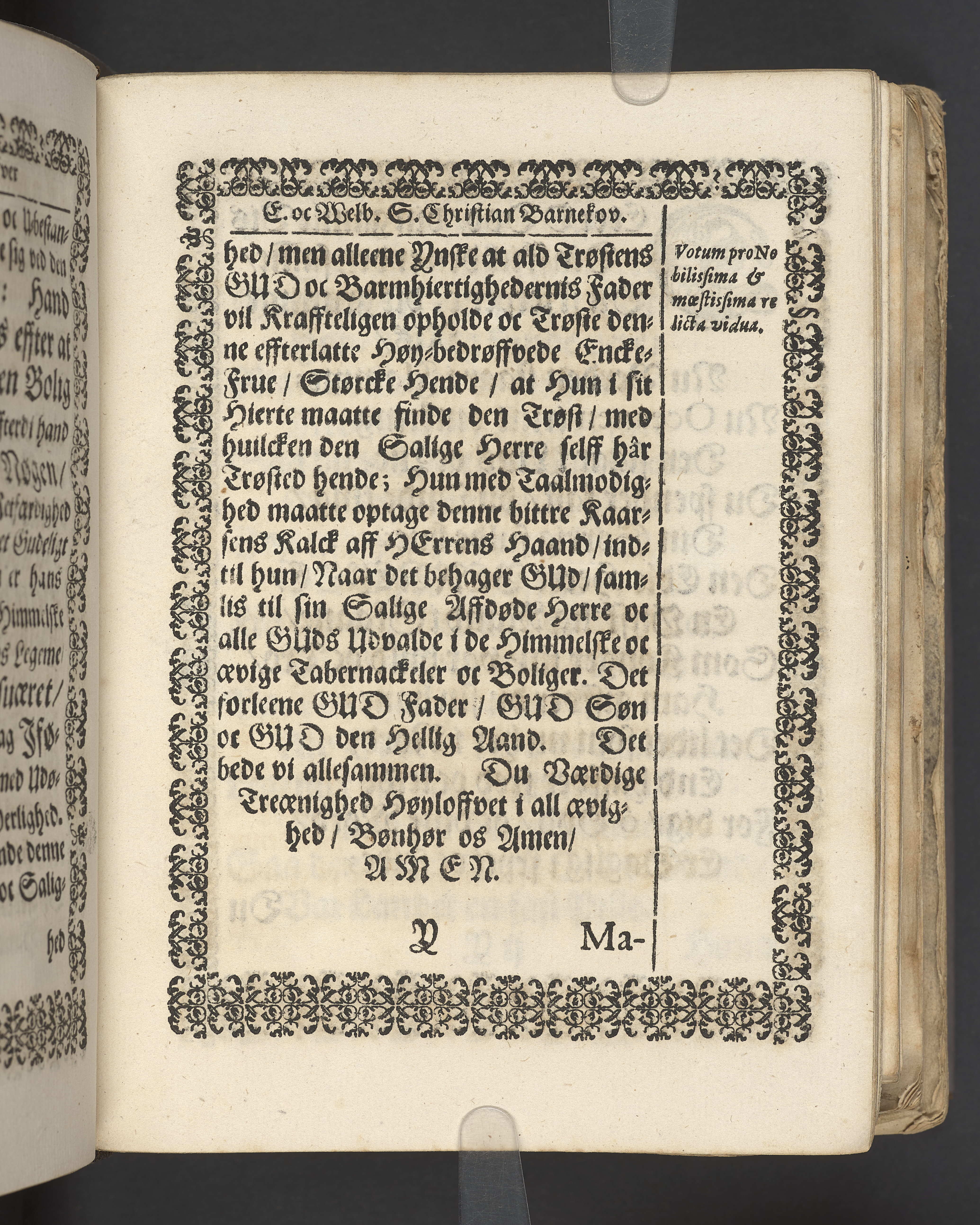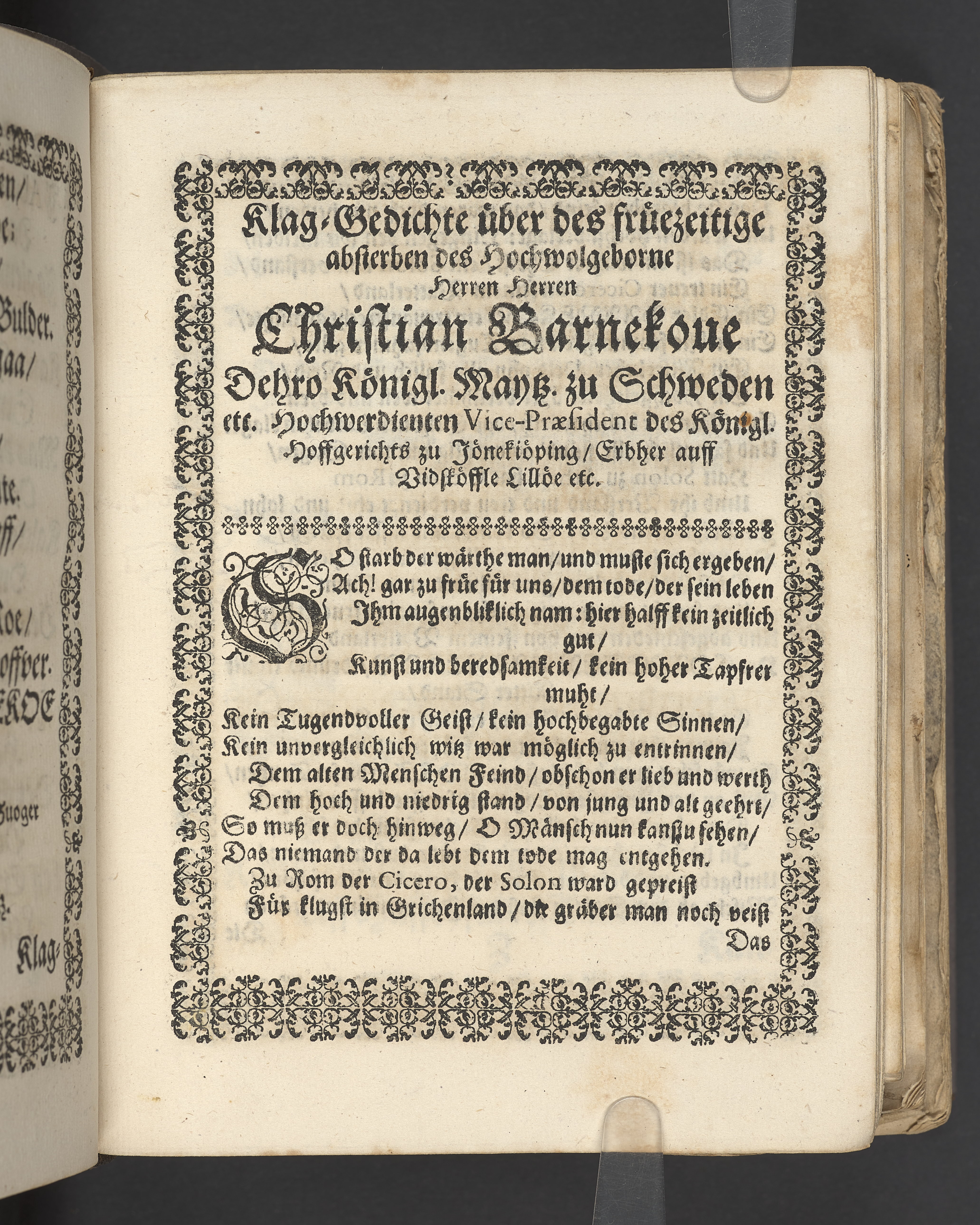 Terrestris tabernaculi destructio et coelestis habitaculi erectio Det er Det Jordiske tabernackels Nedbrydelse Oc Den Himmelske Boliges Oprettelse aff S. Poffvels Andet Sendebreffs V. Capitels 1.2.3.4.5. vers. Udi en Christelig Lijgpredicken Der Aedle/ Velbaarne oc nu Salig hos Gud Christian Barnekou Til Vidskiøffle oc Lilløe etc. Kongl. Maytz. sampt Suerriges Riges Tro mand/ och Høybetroede Vice-Praesident udi den Kongl. Giøtterickes Hof ret udi Jønkiøbing/ Hans Adelige Lijg med Christelige Ceremonier bleff udi mange Velbiurdige oc Fornemme Folckes Haederlige oc Anseelige Forsamling Sørgelig nedsat udi St. Peders Kircke udi Malmøe den 28 Maji Anno 1666. Andraget oc frem sat aff Niels Søffrensen Sougneprest sammestedtz. Kiøbenhafn/ Prentet aff Christen Jensøn Wering Universit. Bogtr. Aar 1666.