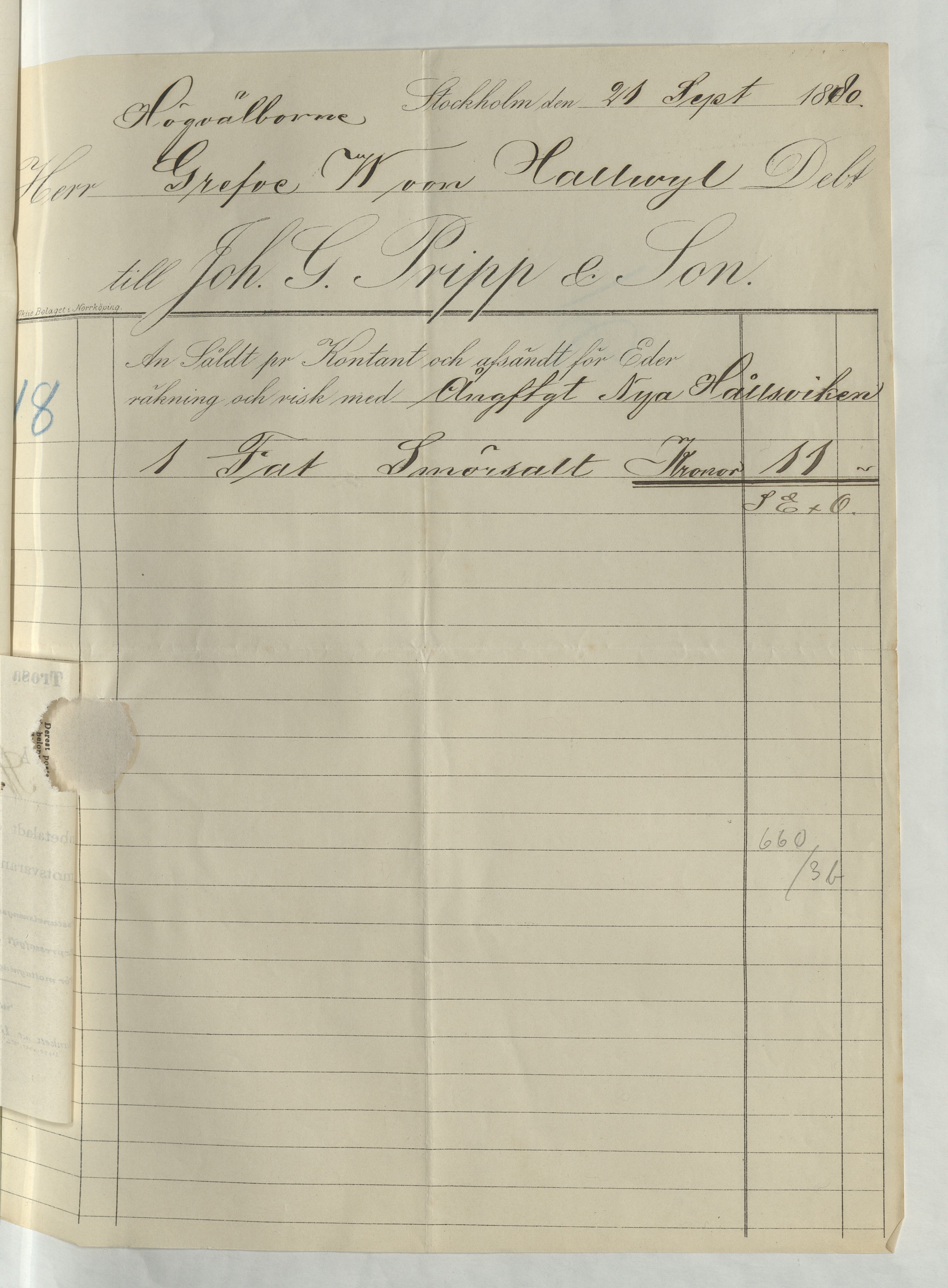 Kvitto på inbetald postanvisning à 11Kr till John. G. Pripp & Son. Trosa 1880.