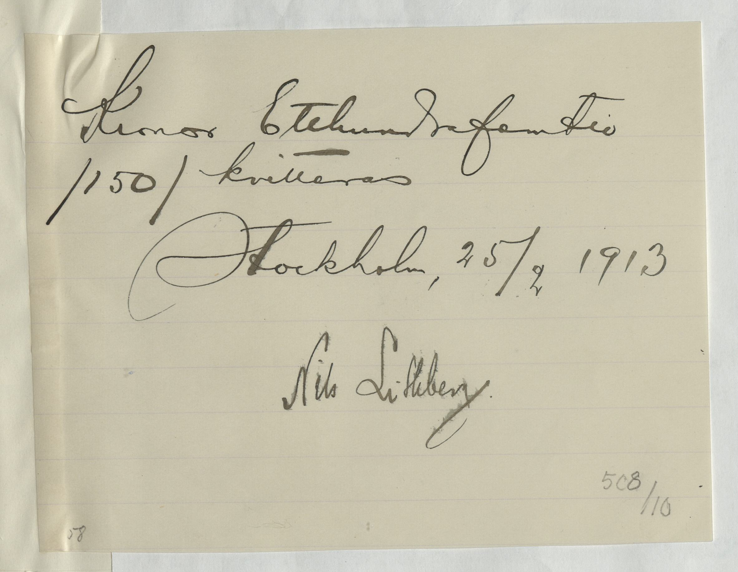 Kvitto gällande pengatransaktion. Undertecknat av Nils Lithberg, 1913.