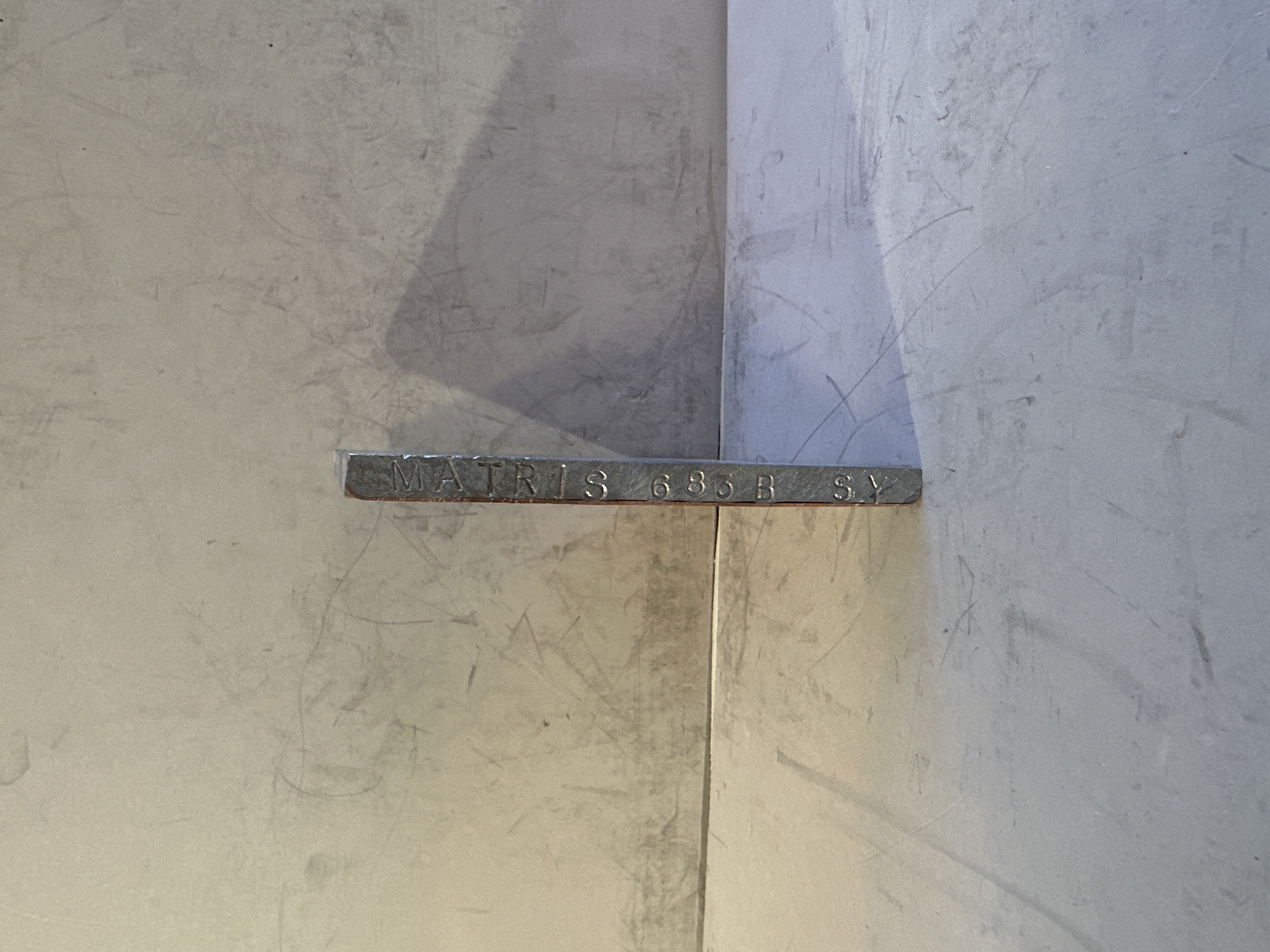 Pressplatta för vattenmärkestillverkning. Plattan tillverkad i koppar och bly, med motiv föreställande hästhuvud. Plattans framsida med påskrift i tusch: "MATRIS". Framsidan även numrerad "683 B" samt signerad "LW 87".