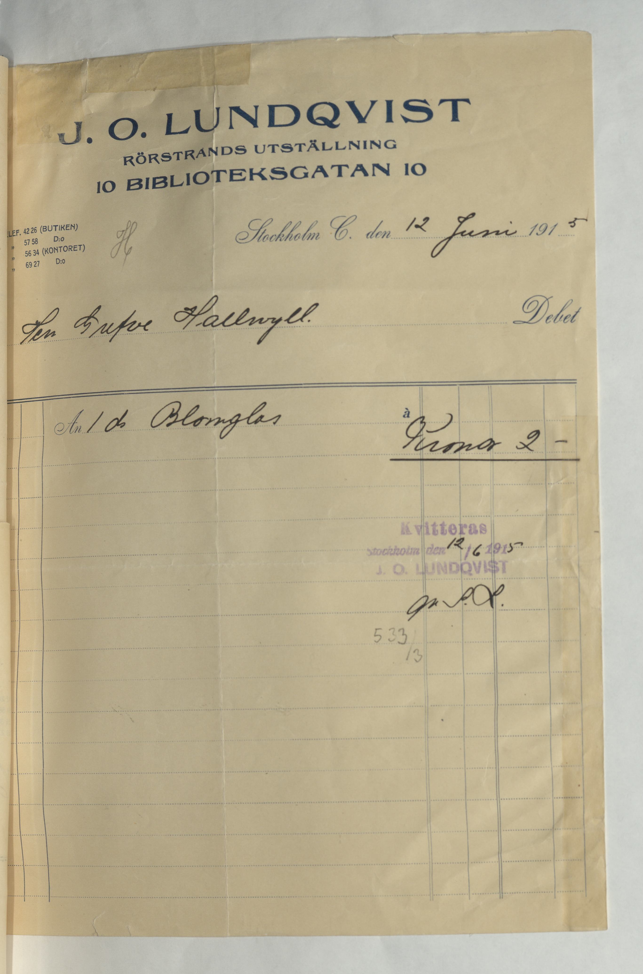 Kvitto till Herr Greve Hallwyl för inköp av 1 st Blomglas, hos J. O. Lundqvist, Rörstrands Porslins-Magasin, för en summa av 2Kr. Stockholm 12 juni 1915.