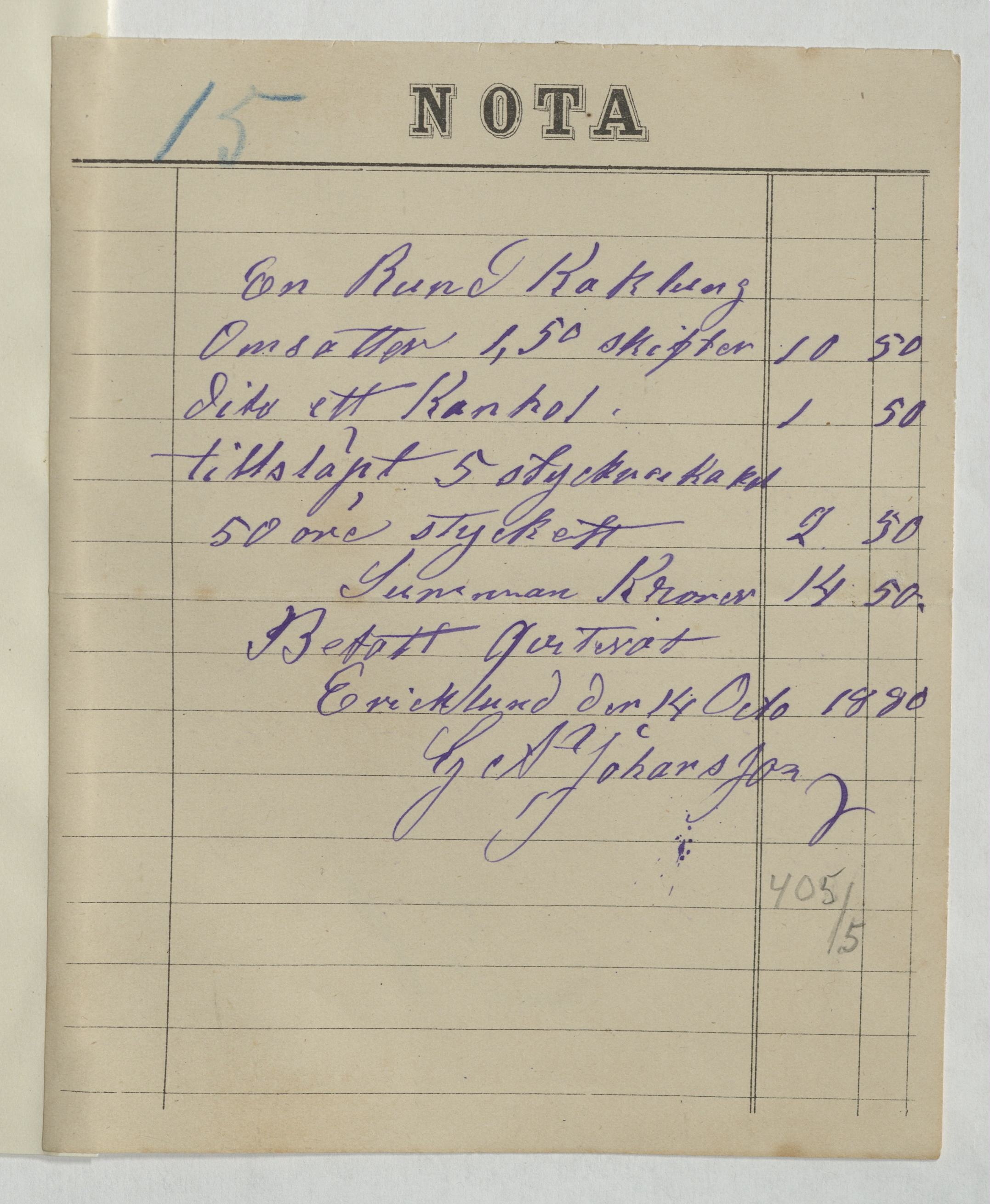 Kvitto från G. A. Johansjon, kakelugnsmakare
