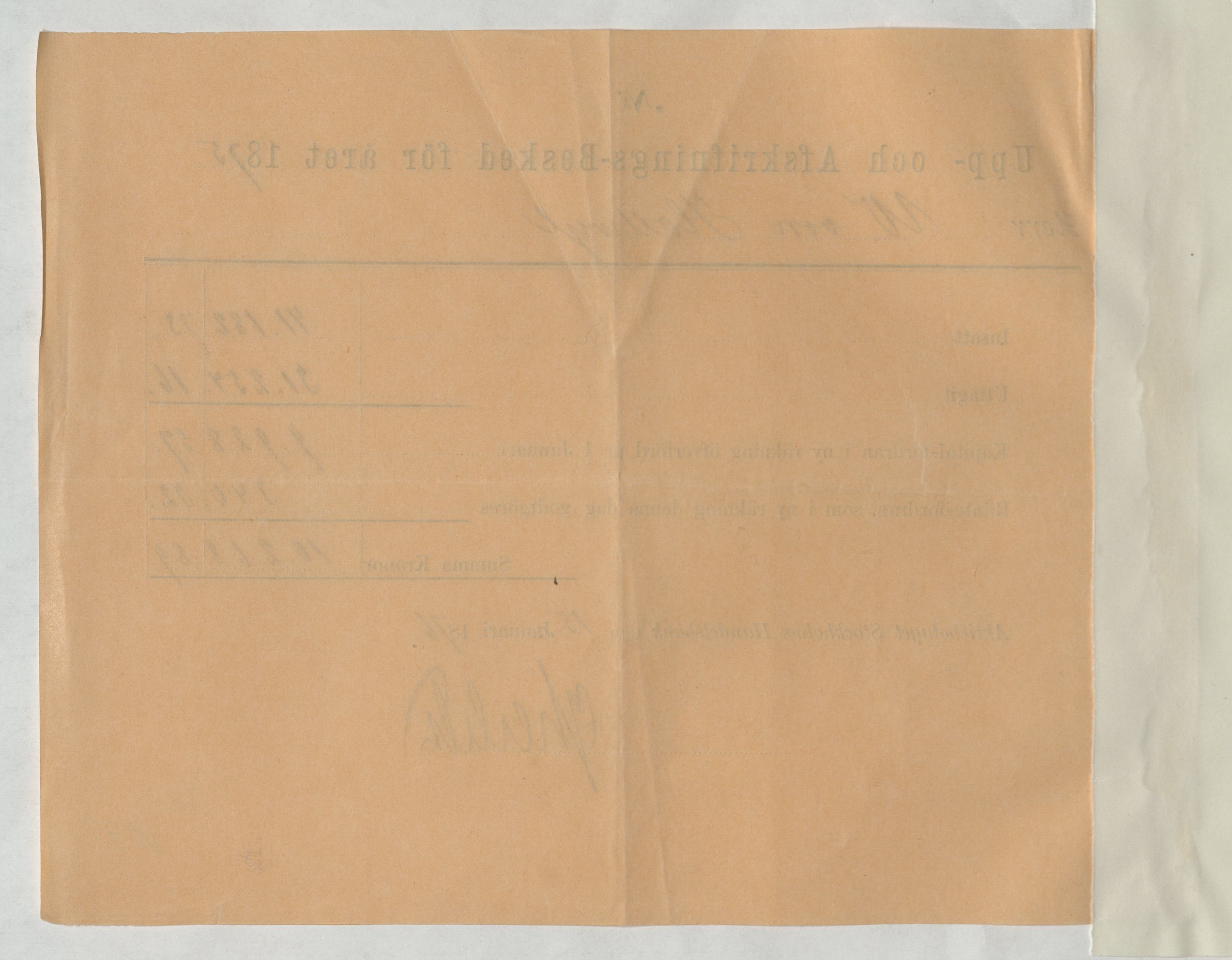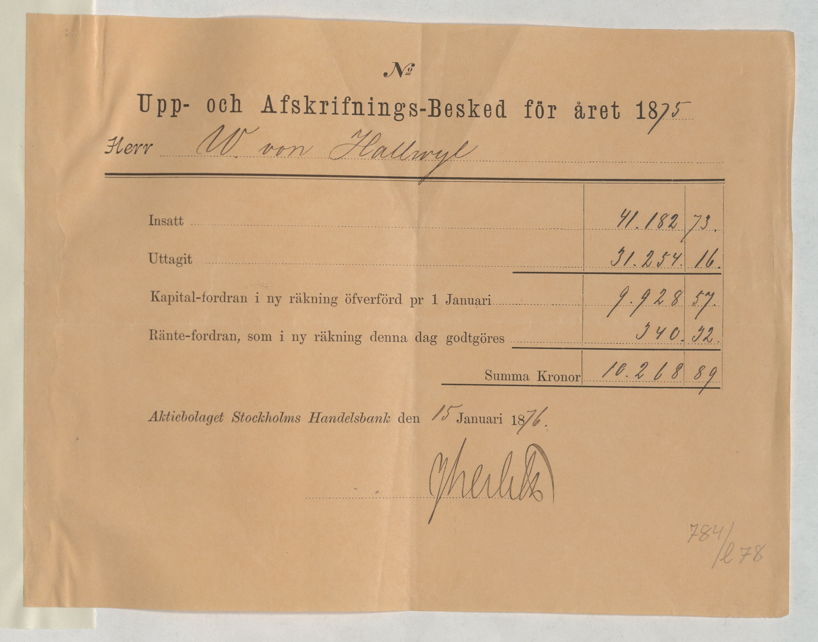 Kvitto från Aktiebolaget Stockholms Handelsbank rörande Upp- och Afskrifnings-Besked