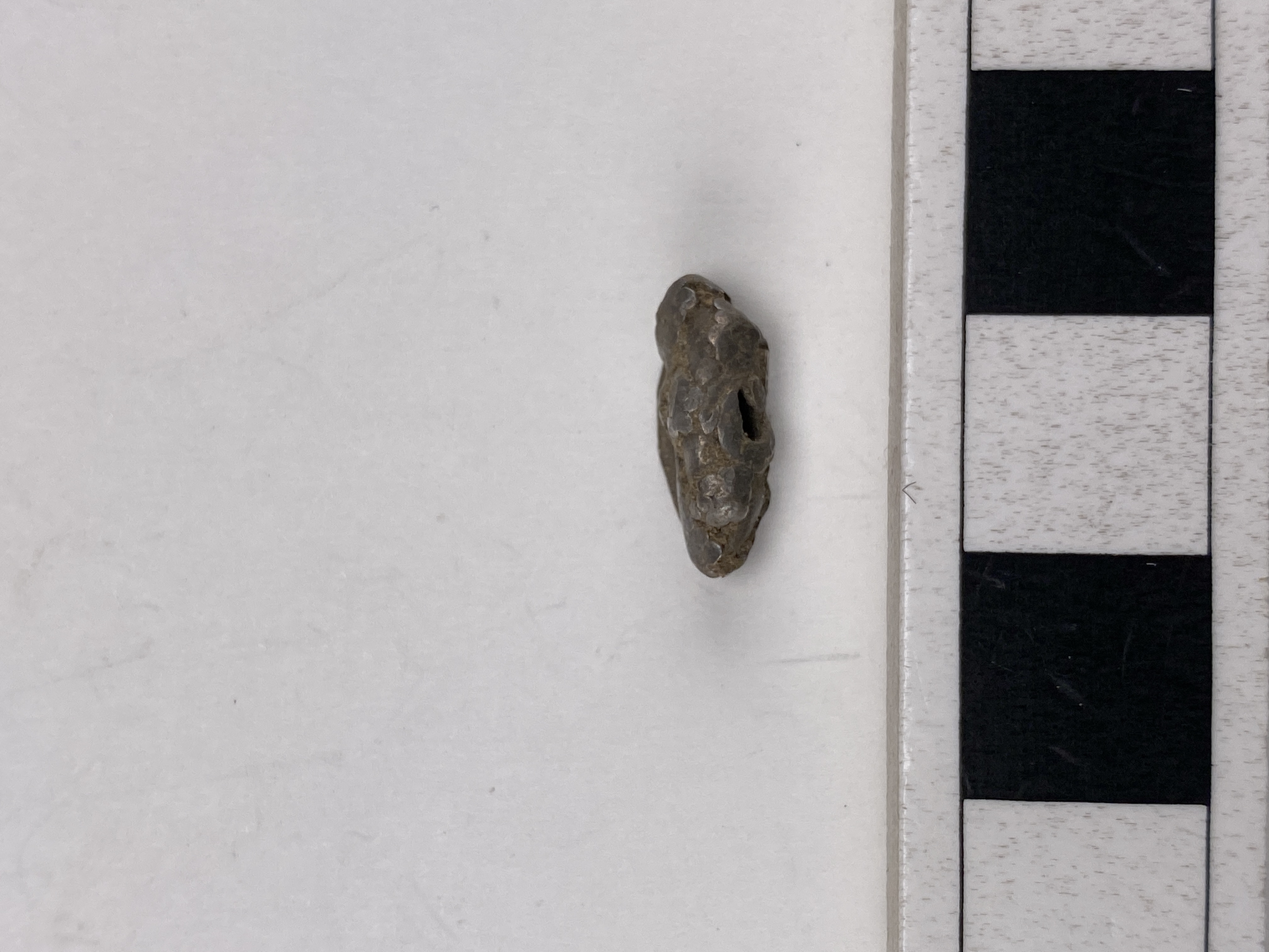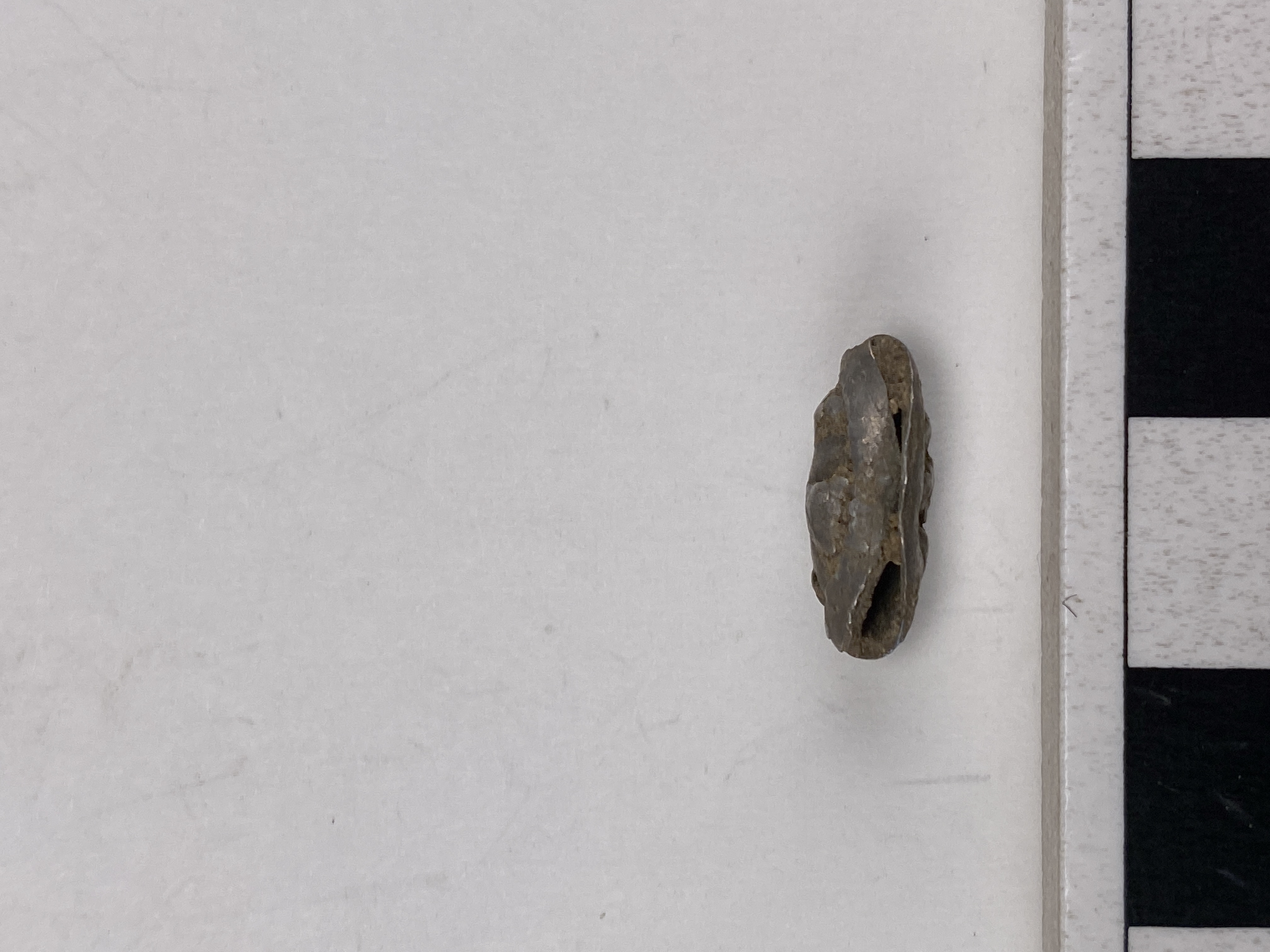 Del av pärla, med mittbård, granulerade fält och hål. Tillplattad och avknipsad strax under storsfärens bård.
