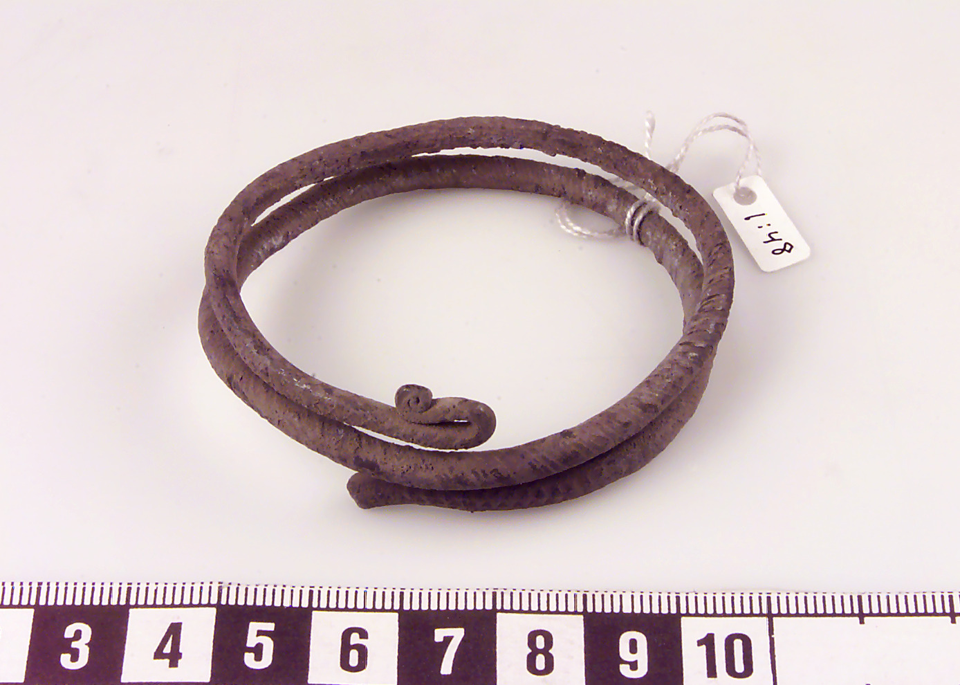 Spirallagd , rund ten i två varv. Ena änden bakåtböjd och upprullad, den andra avbruten. Omväxlande spiralräfflad samt ornerad med motställda trianglar. Skadat ytskikt.