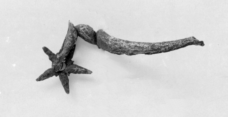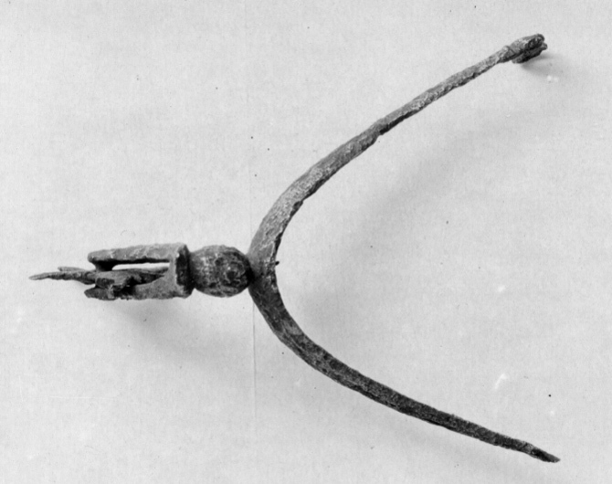 Sporre av stål med u-formade skänklar. Hals vinkelformigt nedåtböj, delen närmast skänklarna spolformig. Klinga femuddig.