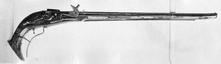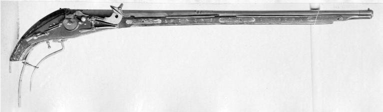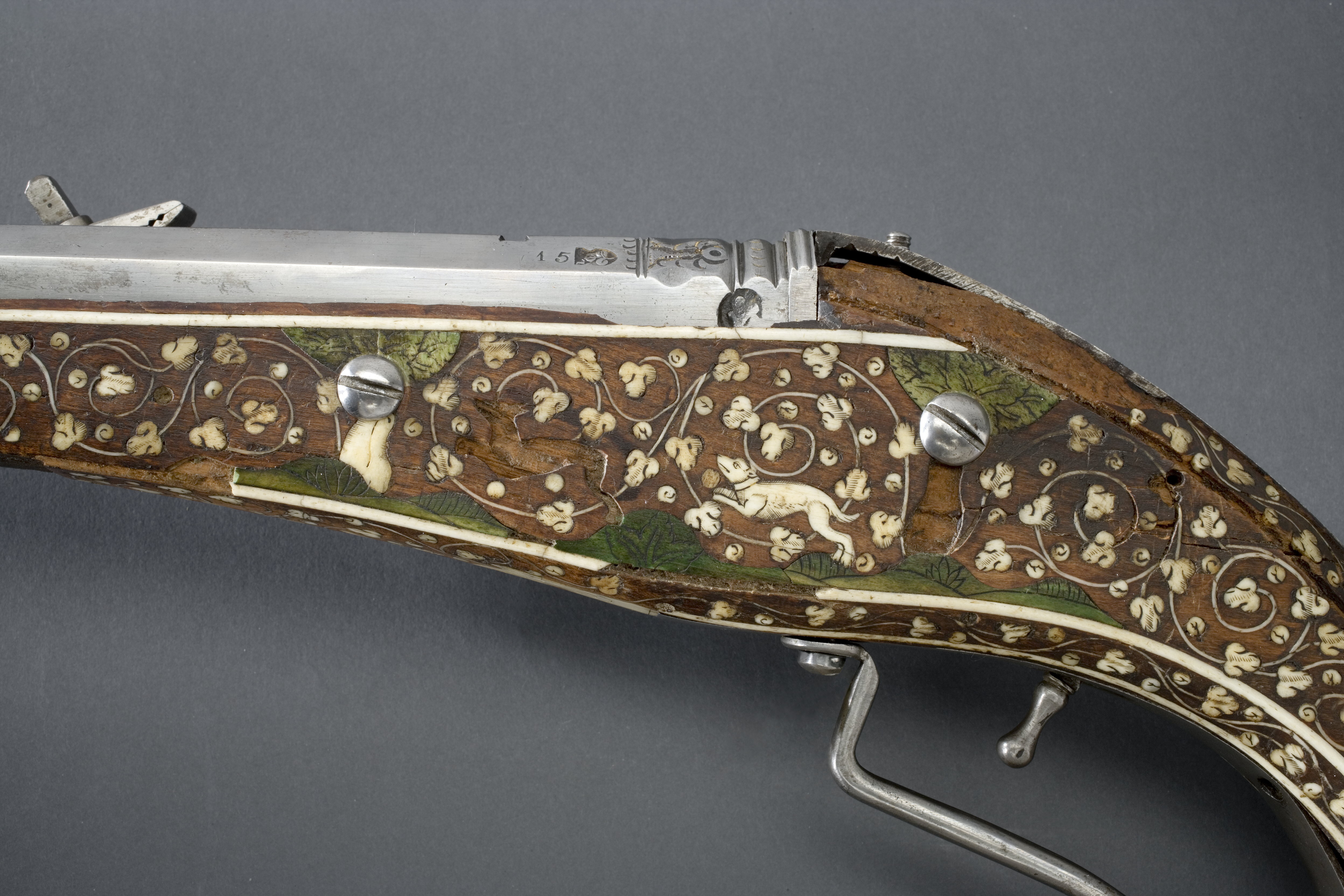 Rund, slätborrad pipa av stål med åttsidig kammare, fasad kant vid mynningen, l 5 mm, på undersidan vid fänghålet ett stycke borthugget för hjulstudeln. Långt svansskruvblad, inskruvat i svansskruvens platta, avbrutet vid bakre skruvhålet, urspr. till kolvänden, tre skruvhål. Svansskruven har baktill en åttsidig platta av pipans bredd, på ovansidan en profilerad vulst, på undersidan en fyrsidig tapp. Punsad dekor vid pipbas, övergång rund-kantig del samt vid mynningen, rankor, samt ornamentsstämplar i form av fyrblad sammansatta av fyra pilar (vid den kantiga delens framände). Kraftigt profilerat och punsat parti vid pipbasen, l: 30 mm. På sidofaserna därframför två stämplar: sköld med L M och planta med tre runda blad, (LRK vägl.1921:207), på vänstra fasen dessutom stämplat: 15. På mittfasen något längre fram en stämpel i form av sköld med en något otydlig örn (Stöckelnr 8780, LRK vägl.1921:177), därframför laxning för siktet. På v. sida en stor, oval, otydlig stämpel. På pipans undersida liksom på svansskruvbladets undersida inslaget en prick. Riktmedel: Siktet saknas. Knoppkorn av mässing. Fästning: Tre häften. Pipan fäst med krysskruv underifrån genom kolven från avtryckarbleck till svansskruvblad, tre pipstift av trä (nya). Hjullås med blånerat låsbleck, något sliten. Svagt nedåtsvängd bakre del, bakänden med omvänt c-formig fasning. Utvändigt, blankt hjul med blånerad hjulring, skruvar kl. 3 och 9, blanka huvuden,uppskjutande voluter på vardera sidan om fängpannan. Rektangulär fängpanna med rak nederkant,konturerad överkant, blankt lock med streckdekor, rörlig arm, tryckknapp med välvt, blankt huvud.Blank hane med åsad, rak kropp, plan hals med runt hål, dekor i form av ett rakt streck mellan håloch underkäke. Lös överkäke med uppåtsvängt, avbrutet grepp. Blankt käkskruvhuvud medkvadratiskt tvärsnitt och svagt välvd ovansida. Hanfjäder med rundat fasade kanter, bakåt breddatoch tillplattat fjäderlöv med mittstreck, välvd ändkula. Balusterformig hanstudel. Låset invändigtblånerat förutom hjulstudel och rörliga delar, fängpannelockets drivfjäder blånerad. Ovanför avtryckarstångens fästbygel punsat en punkt.Säkring: Bakom hjulet virvelsäkring med kulformigt grepp, på bygeln ett bakåt breddat, välvt löv, baktill avskuret parallellt med låsbleckets kant. Fästning och avtryckare: Två låsskruvar. Balusterformmig avtryckare. Helstock av valnöt med nedåtsvängd, avbruten kolv. Nästan yttäckande dekor av ben, kantlister samt bladrankor. Rektangulärt avtryckarbleck av stål till kolvänden. Fri, rundad varbygel nedåtsvängd efter kolven, fäst med krysskruven samt trädd genom ring på den bakre stolpen,inskruvad i avtryckarblecket. Övriga beslag av graverat ben. Vid pipbasen urspr. två plattor, båda saknas. På kolvens undersida framför avtryckarbecket en platta med ett drakhuvud. På anslagssidan en jaktscen, grönfärgad mark och två träd med grönfärgat lövverk, stammen på det bakre saknas. Mellan träden en framåt springande hund med halsband, jagande en nu bortfallen hjort. Spetsrörkeplattan saknas. Sex pipstiftbrickor med rundade ändar och volutdekor i båda ändar, på snedden gående band däremellan. Topprörkan saknas, näsband med enkel streckdekor.