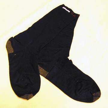 Maskinstickad ankelsocka av svart tunt ylle med söm mitt bak samt på var sida om fotbladet. Förstärkt melerat häl- och tåparti med inslag av ljusgrått garn. Upptill 110 mm brett resårstickat parti. På detta vid kanten broderat med röd tråd i korsstygn:"G.A."