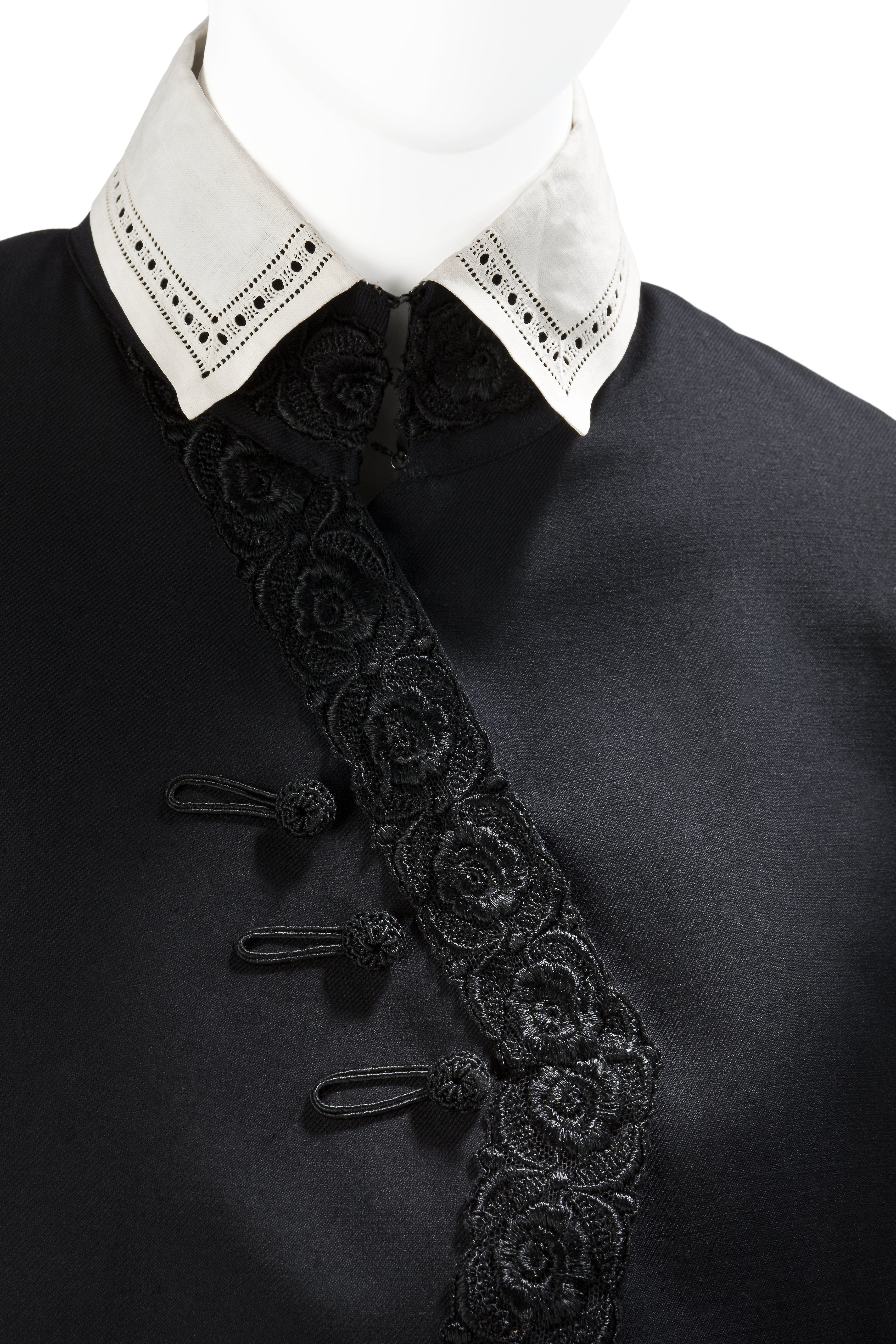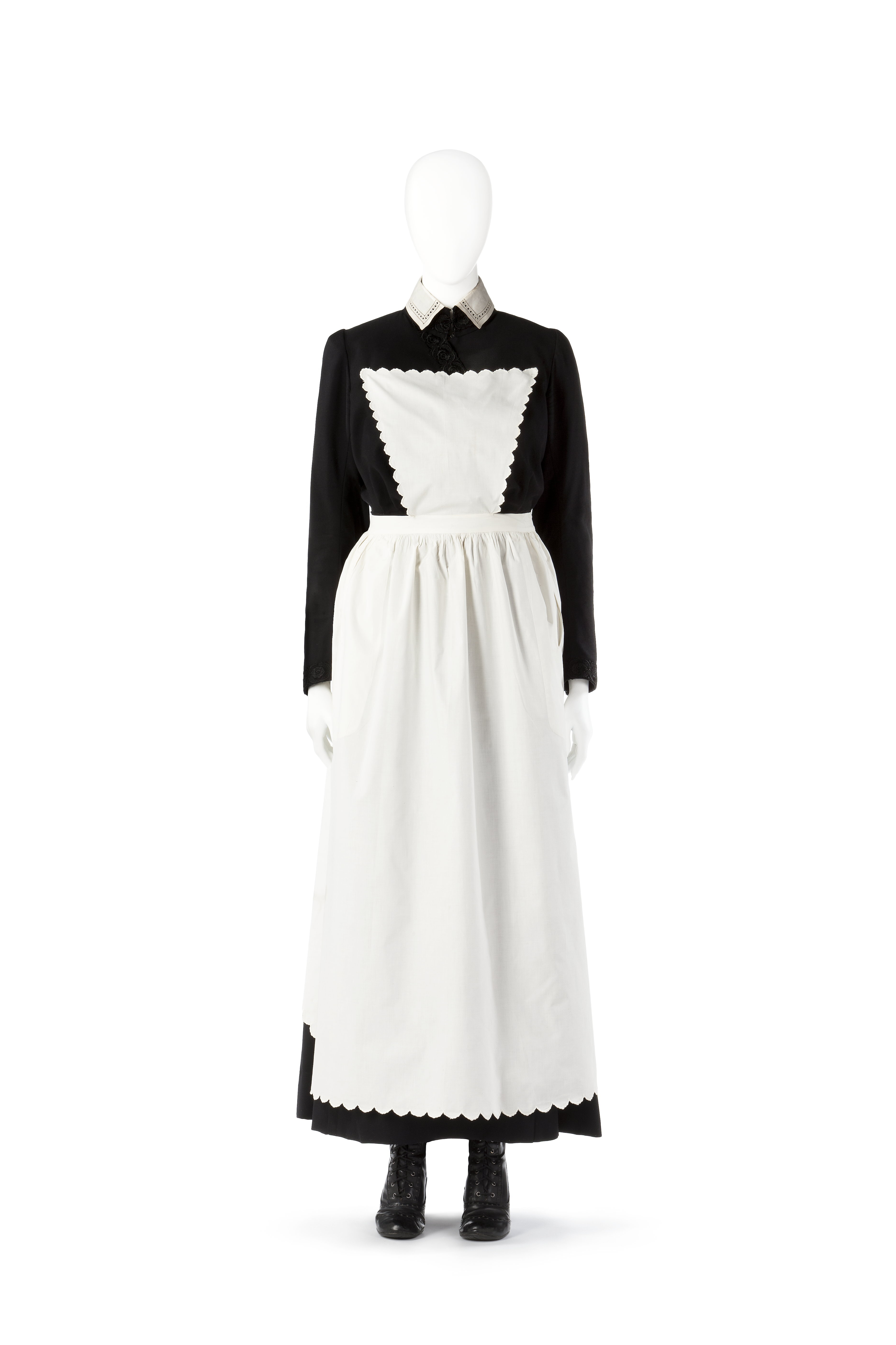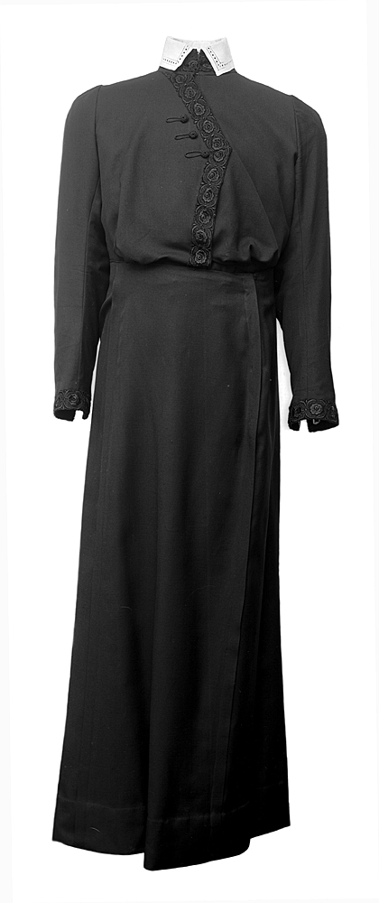 - Blus och kjol. Af svart cheviot med garnering af maskinbroderade svarta silkesbårder. Hand- och maskinsydd. Blus: Bestående af två framstycken och ett ryggstycke. Å hvartdera framstycket nedtill tre efterveck, nedsydda med maskinsöm. Nedre kanten nästan rak och kantad samtidigt med fodret under en sneddad kant af svart bomullssatin, påsydd med maskinsöm. Ofvanför kanten nedtill i midten å ryggstycket en svartlackerad hake, isydd med kaststygn. Kanten å högra framstycket upptill trubbigt vinkelskuren, omviken och påsydd med maskinsöm under en skoning af svart tvåskaftadt bomullsband. Kanten å vänstra framstycket rak och fållad. Knäppning med sex svartlackerade tryckknäppen, isydda med kaststygn. Nedtill å högra framstycket en svartlackerad hake, isydd med kaststygn, å det vänstra en langett-hyska. Halsringning rund. Krage rak, uppstående, med foder af svart sidentaft, påsydt med fållsöm. Knäppning med tre svartlackerade hakar och tre hyskor, isydda med kaststygn. Garneringsbårderna med mönster af bredvid hvarandra tätt sittande rosliknande blommor, hvarje omgifven af fyra halfverade blad, mellan rosorna tre punkter. Bårderna påsydda med förstygn längs högra framstyckets kant, omkring halskragen och rundt ärmarnas nedre kanter. Å framstycket ofvanför midten innanför bården en imiterad knäppning med tre runda kupiga knappar af svart silkessnörmakeri, vid hvarje en ögla af svart silkessnodd. Knapparna isydda med kaststygn, öglorna påsydda med förstygnssöm. Prydnadskrage af hvitt tvåskaftadt linne med smala kantfållar, nedsydda med handsydd hålsöm med mönster af ovala hål, omväxlande med breda X-formiga stolpar mellan två enkla hålränder. Kragen påsydd med långa förstygn. Foder af beigefärgadt tvåskaftadt bomullstyg, bestående af två framstycken, två sidostycken och ett ryggstycke, alla svagt sneddade. Sömmarna och kanterna maskinsydda. Axelsömmarna svagt sneddade. Å hvartdera framstycket två bröstsömmar. Knäppning framtill. I vänstra framstyckets kant fyra hakar och fem svartlackerade hyskor, i det högra fem hakar och fyra hyskor, alla isydda under sneddade kantslåar af fodret, dessa påsydda dels med maskinsöm, dels med fållsöm. Hängare af svarta tvåskaftade bomullsband, isydda med kaststygn en i hvartdera ärmhålet. Ärmar med foder som blusen samt sneddade, sömmarna maskinsydda, med kastade kanter. Nedtill ett sprund, detta och ärmen nedtill kantade med öfverstyckets omvikna del. Knäppning med två svartlackerade hakar och två langetthyskor. Ärmarna isydda med kastade maskinsydda sömmar. Kjol: Bestående af fem sneddade våder, hopsydda med maskinsöm, kanterna med kastsöm. Framvådens kanter bildande ett längdgående bredt efterveck å hvardera sidan, bakvåderna upptill rynkade. Kjolens öfre kant omviken samt fastsydd med maskinsöm vid ena stadkanten af ett bredt bomullsripsband (spensband). Å bandets afvigsida åtta stöd af hvalfisk-ben, infällda under svarta tvåskaftade bomullsband, påsydda med maskinsöm. Knäppning med två svartlackerade hakar, isydda med kaststygn. Nedtill å stödet vid kjolens baksöm en hyska som de öfriga. Sprund i vänstra sidan, den öfverliggande kanten bredt omviken och kantad med bred skoning af svart bomullssatin, påsydd dels med fållsöm, dels med maskinsöm, sprundets underliggande kant skodd med svart bomullssatin. Sprun-det knäppt med sju svartlackerade hakar, isydda å den öfverliggande kanten under satin-skoningen, samt sju langetthyskor å den underliggande kanten. Hängare, två stycken, som de å blusen och isydda med korssöm vid spensbandets nedre kant. Ficka af svart domestik, rektangulär med öfre kortsidan snedskuren samt fastsydd med förstygnssöm vid sprundets underliggande kant. Fickans fria kant omviken och fastsydd med maskinsöm vid en svart domestikremsa. Utanpå bakvådens öfre kant en slejf af kläd-ningens tyg, bandliknande, med nedre kanten något utåtsvängd och ändarna vinkelskurna, kanterna omvikna och fastsydda med maskinsöm under ett foder af svart bomullssatin. I hvardera ändan en knapp med ögla som å blusen. Kjolens nedre kant med bred omvikning, fastsydd med fållsöm. Maskinsömmar sydda med svart silke eller svart och beigefärgad bomullstråd; kast- och fållsömmar med svart silke samt svart eller beigefärgad bomullstråd; förstygnssöm med hvit eller svart bomullstråd; langettsöm med svart bomullstråd. Blus, längd: omkring 48 cm.; bröstvidd: omkring 66 cm.; halsvidd: omkring 44 cm. Halskrage, höjd: omkring 6 cm. Midjevidd: omkring 80 cm. Ärmar, längd: omkring 64 cm. Garneringsbårder, bredd: omkring 35 cm. Prydnadskrage, längd: omkring 37.5 cm.; bredd: omkring 8.5 cm. Kjol, längd fram: 1.05 m., bak: 1.07 m.; vidd: 2.2 m. Linning, längd: omkring 83 cm.; bredd: omkring 6 cm. Anm. Ena bröstsömmen å vänstra framstycket uppsprättad. Sex af stöden i spensbandet sönder. Klädningen förfärdigad efter beställning af Wilhelmina von Hallwyl, f. Kempe, Augusti 1914 hos sömmerskan fröken Malmström, Landskrona. Betald Augusti 1914. Pris: Kr. 32: 50, se Hushållsbok. Tyget inköpt af Wilhelmina von Hallwyl, f. Kempe, Maj 1914 hos lärftskramhandelsfirman C. A. Kahl & Co. (innehafvare P. Tidblad), Sturegatan 3, Stockholm. Betaldt Maj 1914. Pris: Kr. 22: 50, se Hushållsbok. Prydnadskragen inköpt af Wilhelmina von Hallwyl, f. Kempe, hos Bikupan, försäljningsmagasin för svenska fruntimmersarbeten, Klarabergsgatan 21, Stockholm.