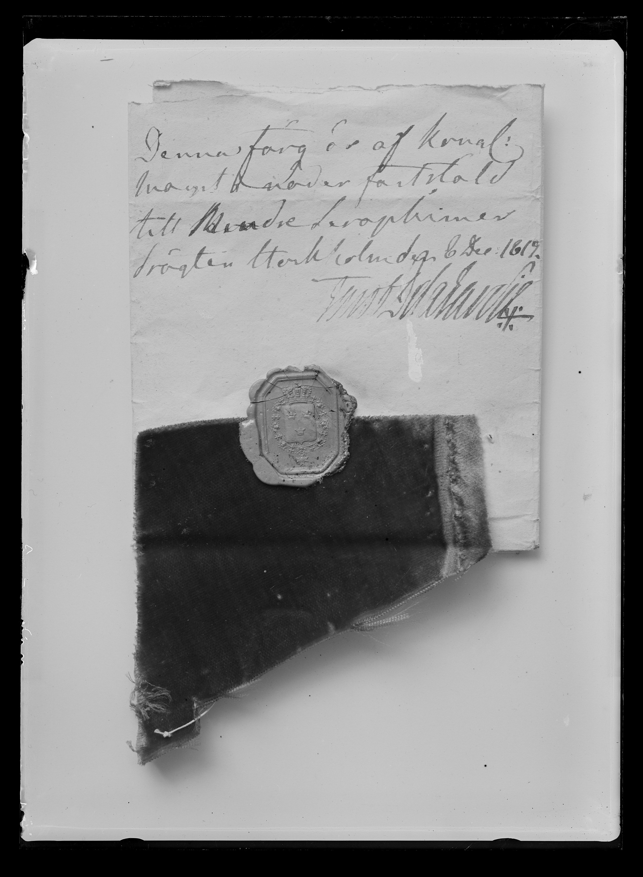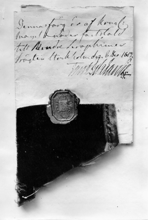 Trekantigt stycke karminröd sammet, fäst vid papper med rött lacksigill med lilla riksvapnet. Påskrift: "Denna färg är af Kongl. // Maij:t i nåder fastställd // till Mindre Seraphimer // drägten Stockholm d.8 Dec.1817 // Gust.De la Gardie".