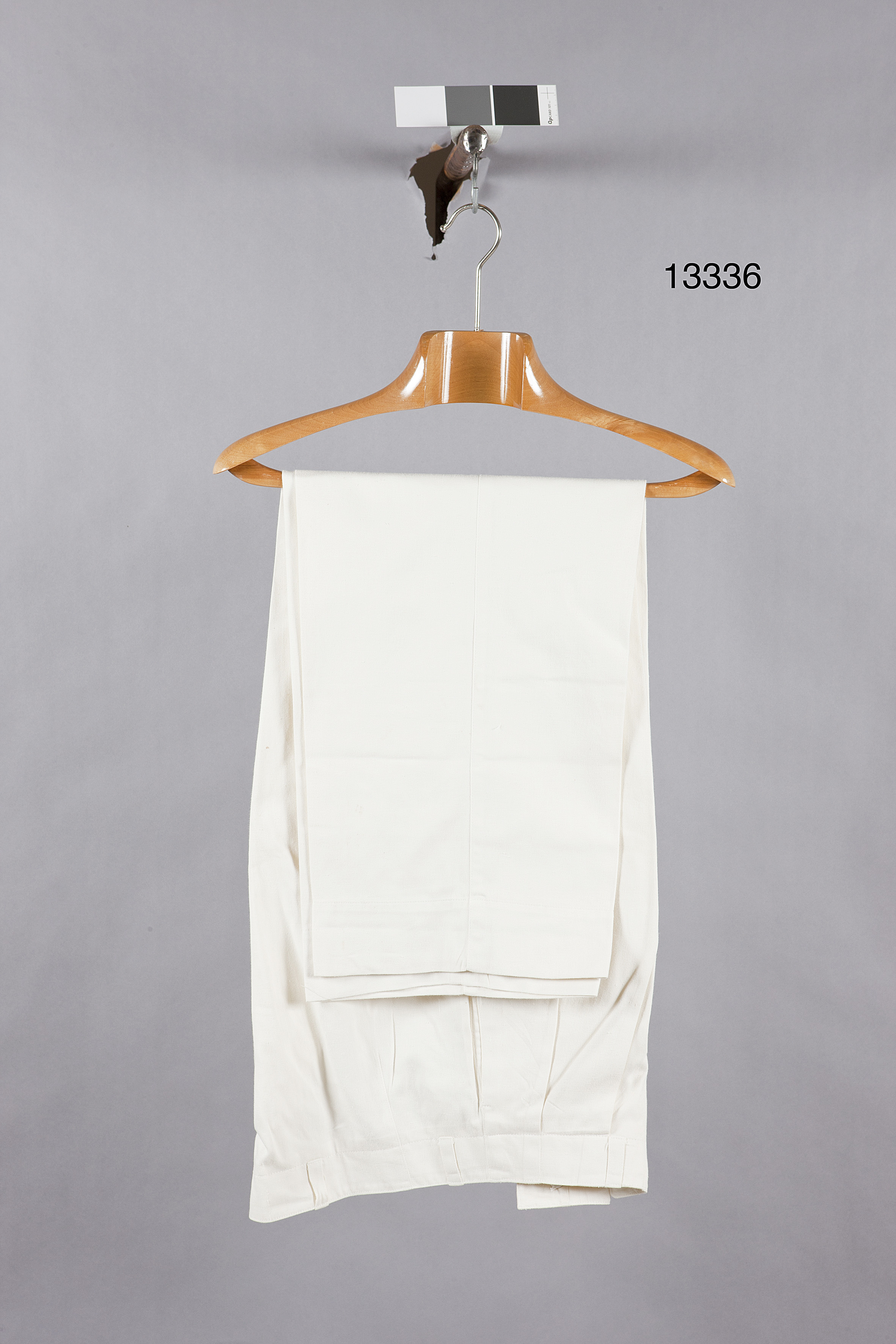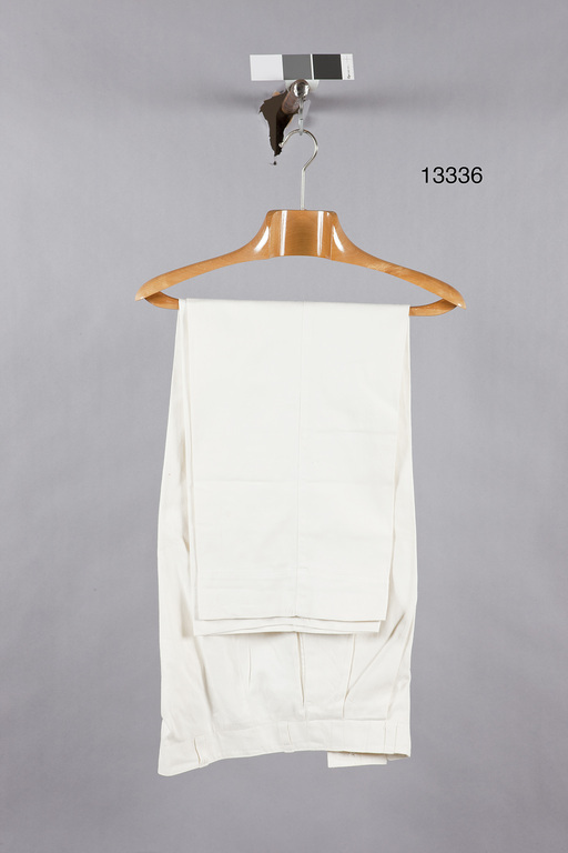 Långbyxor av vitt, s k engelskt skinn, knäppta med gylf med fem vita knappar, diam: 14 mm. I linningen sex hällor. I sidsömmarna fickor, en bakficka knäppt med liten knapp och knapphål. På höger sida fram liten ficka med dragkedja. Mitt bak på insidan av mittsömmen stropp, samt märklapp med blå text: "FOLKE BERNADOTTE"