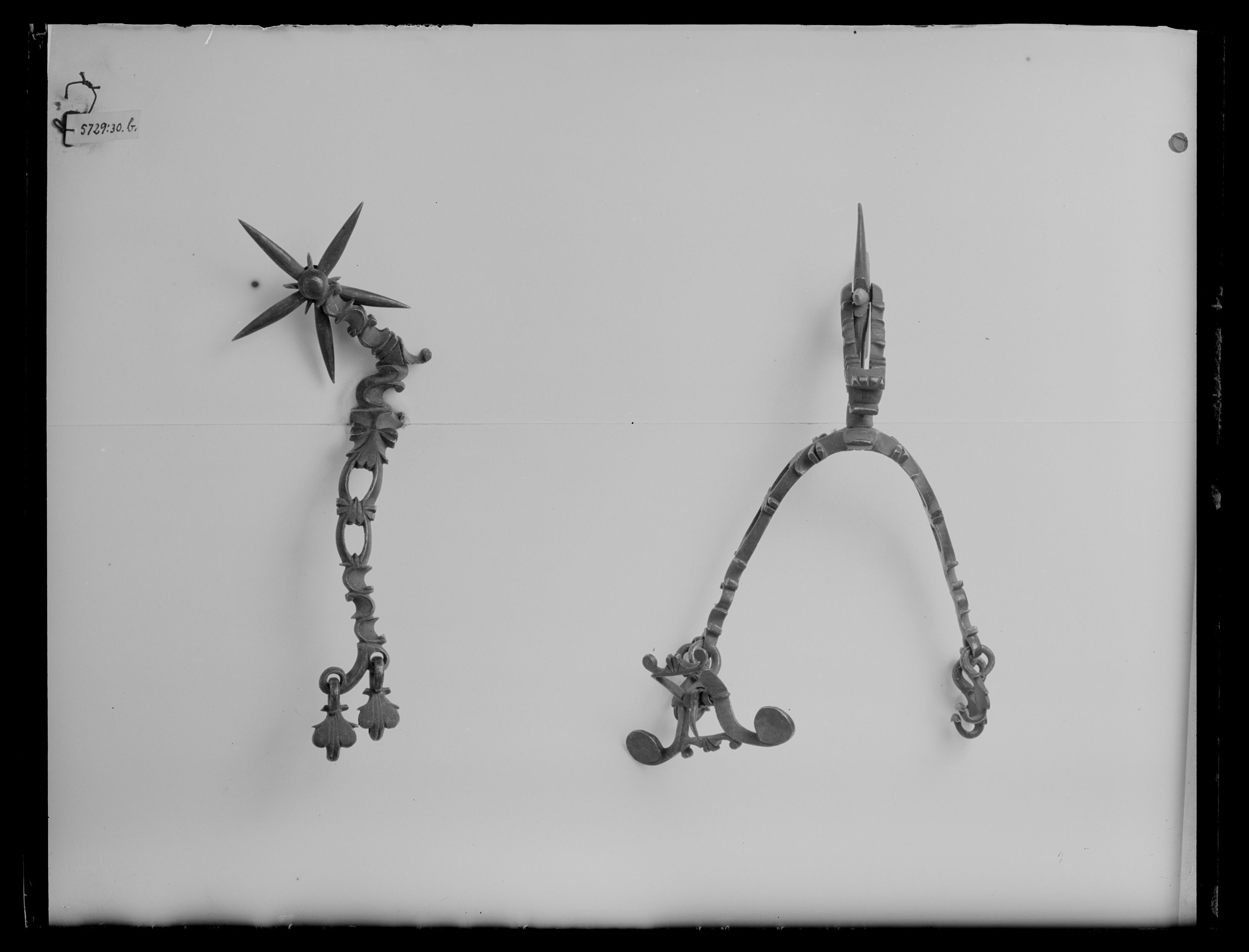Sporre av stål. U-formade en aning svängda skänklar genombrutna och ciselerade, i ändarna böjda med två hål, vari på ena sidan två hakar, på andra sidan en hake och en sölja, l: 32mm b: 61 mm, med två stora utstående voluter. Hals böjd i vinkel och ciselerad, l: 45 mm. Femuddig klinga d: 52 mm med fem små uddar i mitten.