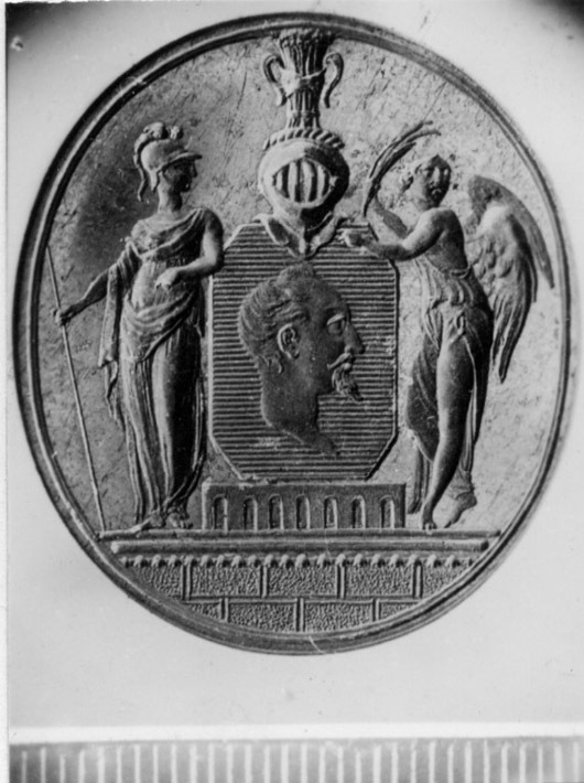 Dekor: Rektangulär sköld med avtagna hörn, skraffering för blå färg, däri manshuvud, halsbild, profil vänster, mustasch och pipskägg (möjligen senare tillfogade). Skölden krönt med bygelhjälm. En vase som hjälmprydnad. Sköldhållare till höger kvinna i antik dräkt, hjälm med hjälmprydnad, till vänster ängel med palmkvist i handen. Skölden står på postament på mur.