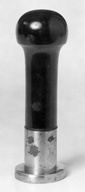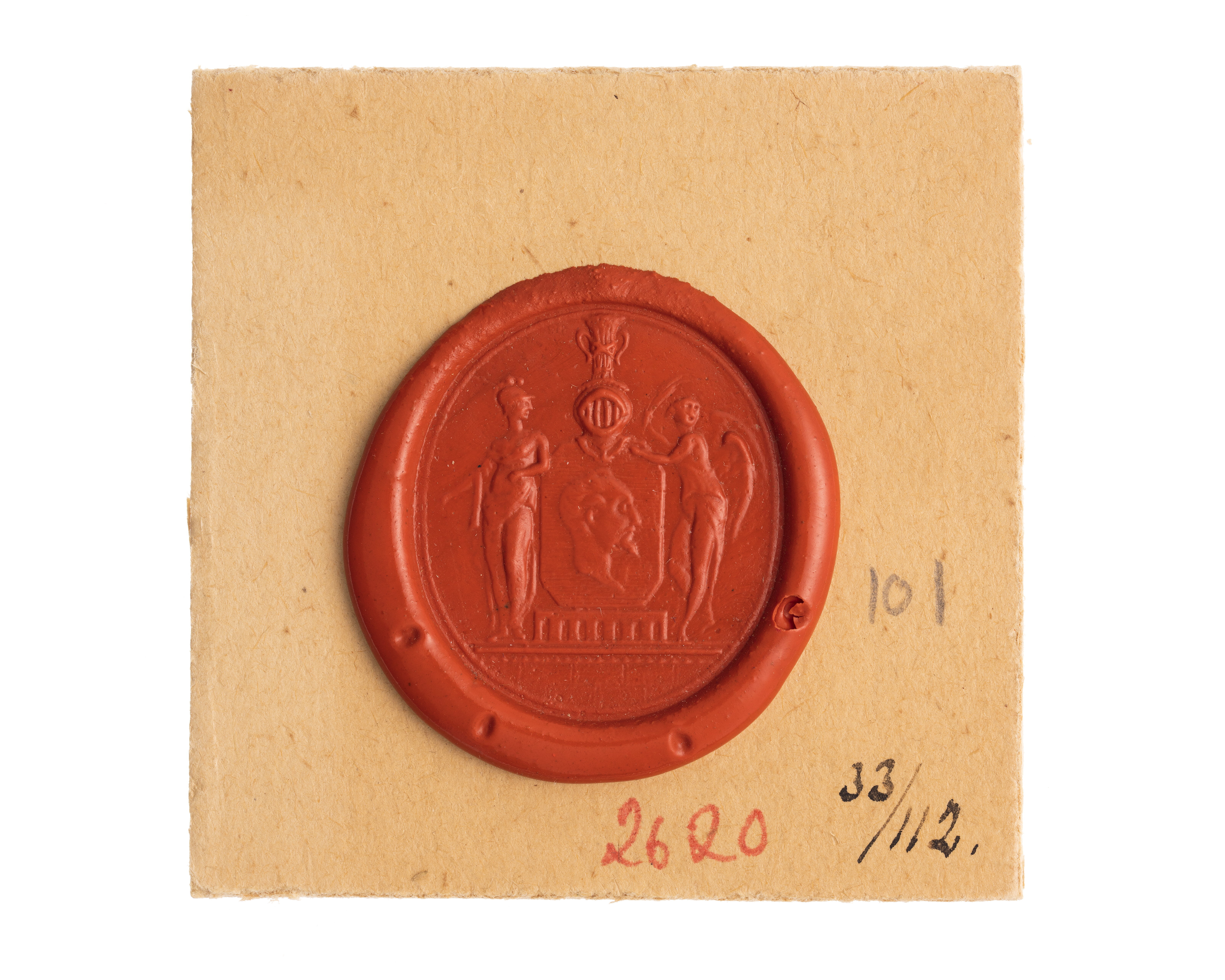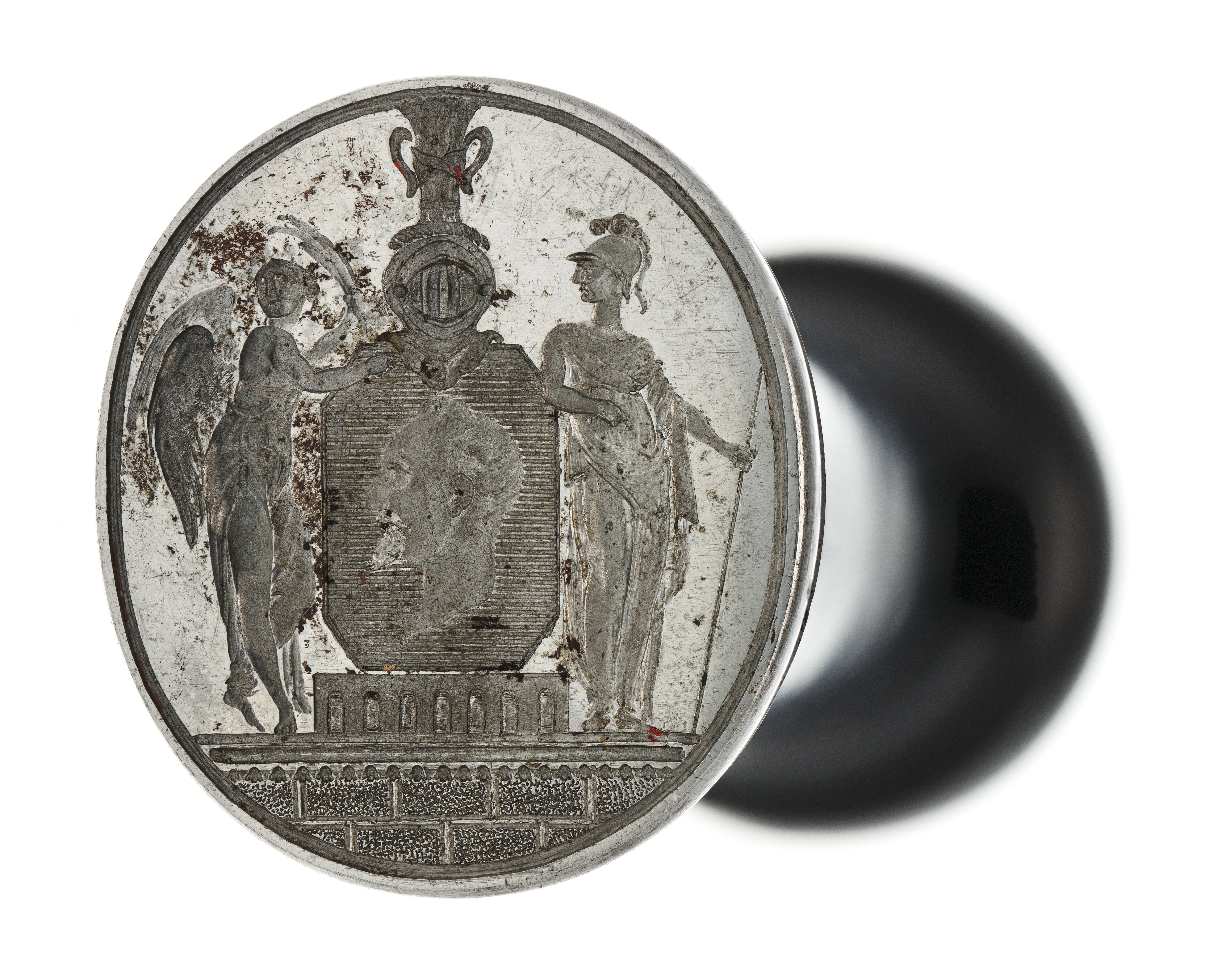 Samhörande med etui nr 2621. Oval platta av stål, däri graverat vapen, rektangulär sköld med avtagna hörn, skraffering för blå färg, däri manshuvud, halsbild, profil vänster, mustasch och pipskägg (möjligen senare tillfogade). Skölden krönt med bygelhjälm. En vase som hjälmprydnad. Sköldhållare till höger kvinna i antik dräkt, hjälm med hjälmprydnad, till vänster ängel med palmkvist i handen. Skölden står på postament på mur. Slät kantring. Randen något rundad, på plattans ovansida cylindrisk holk av stål, d: 21 mm, h: 25 mm. Svarvat skaft av ebenholts, cylindriskt, upptill vidgat till rund kula, d: 33,5 mm.