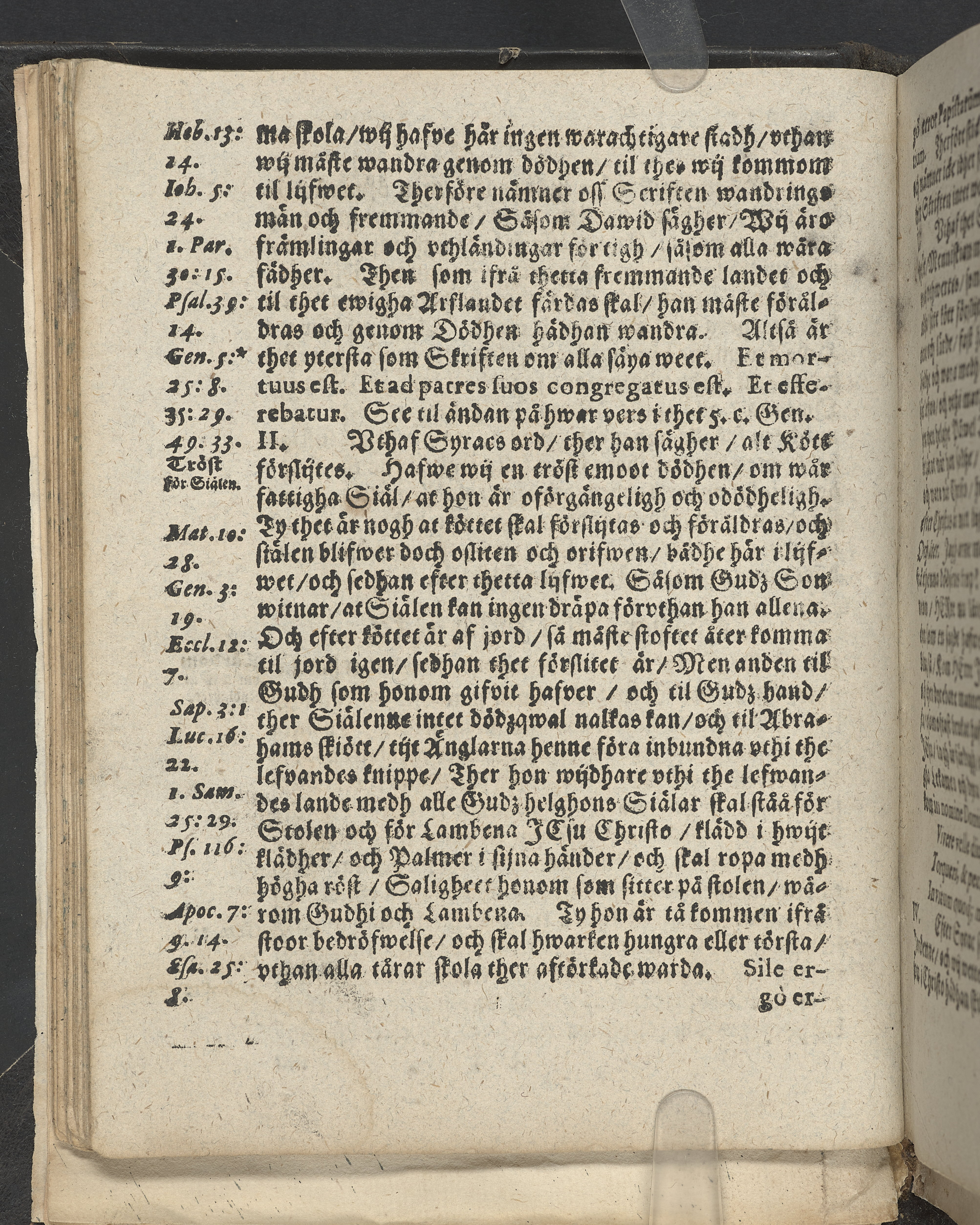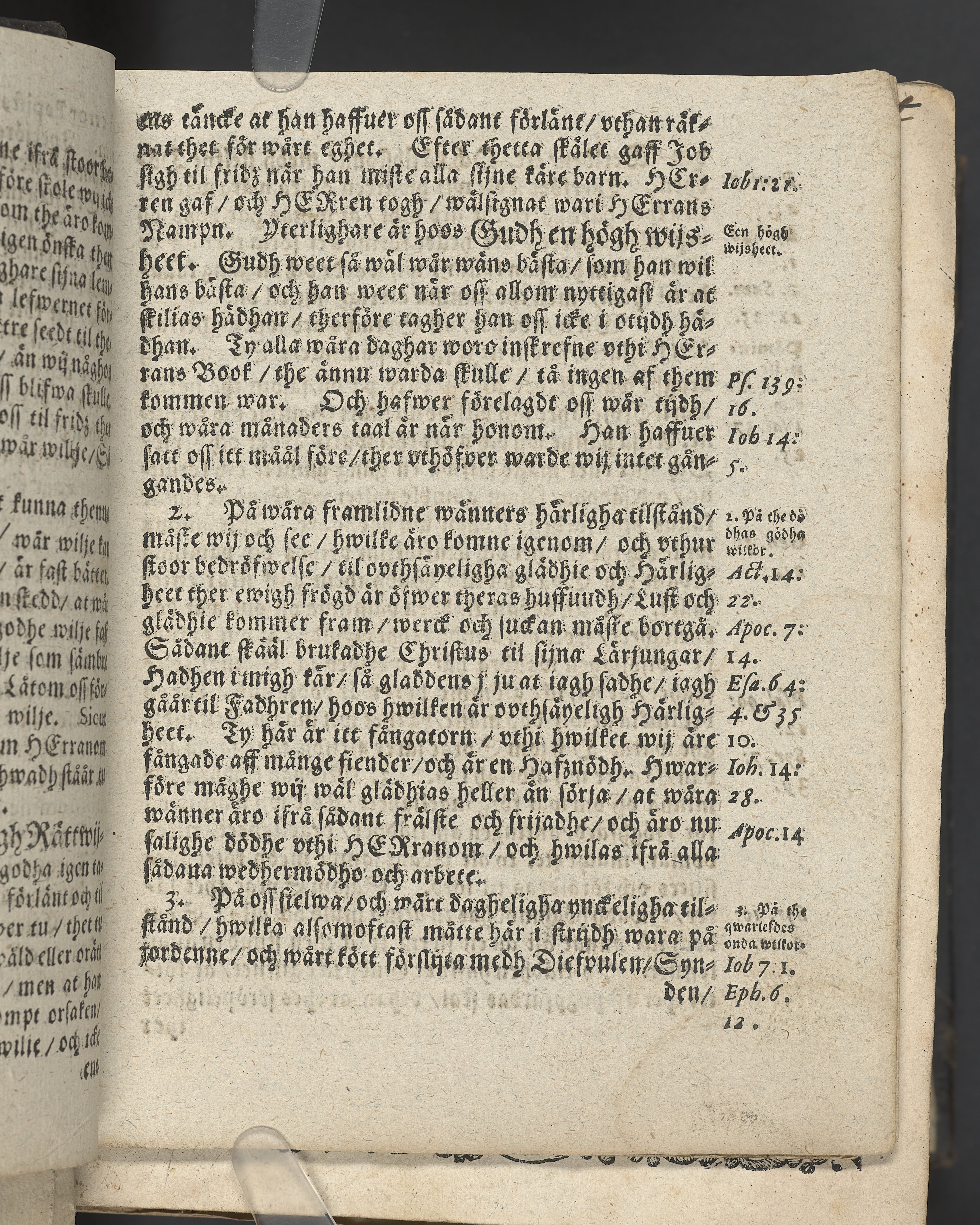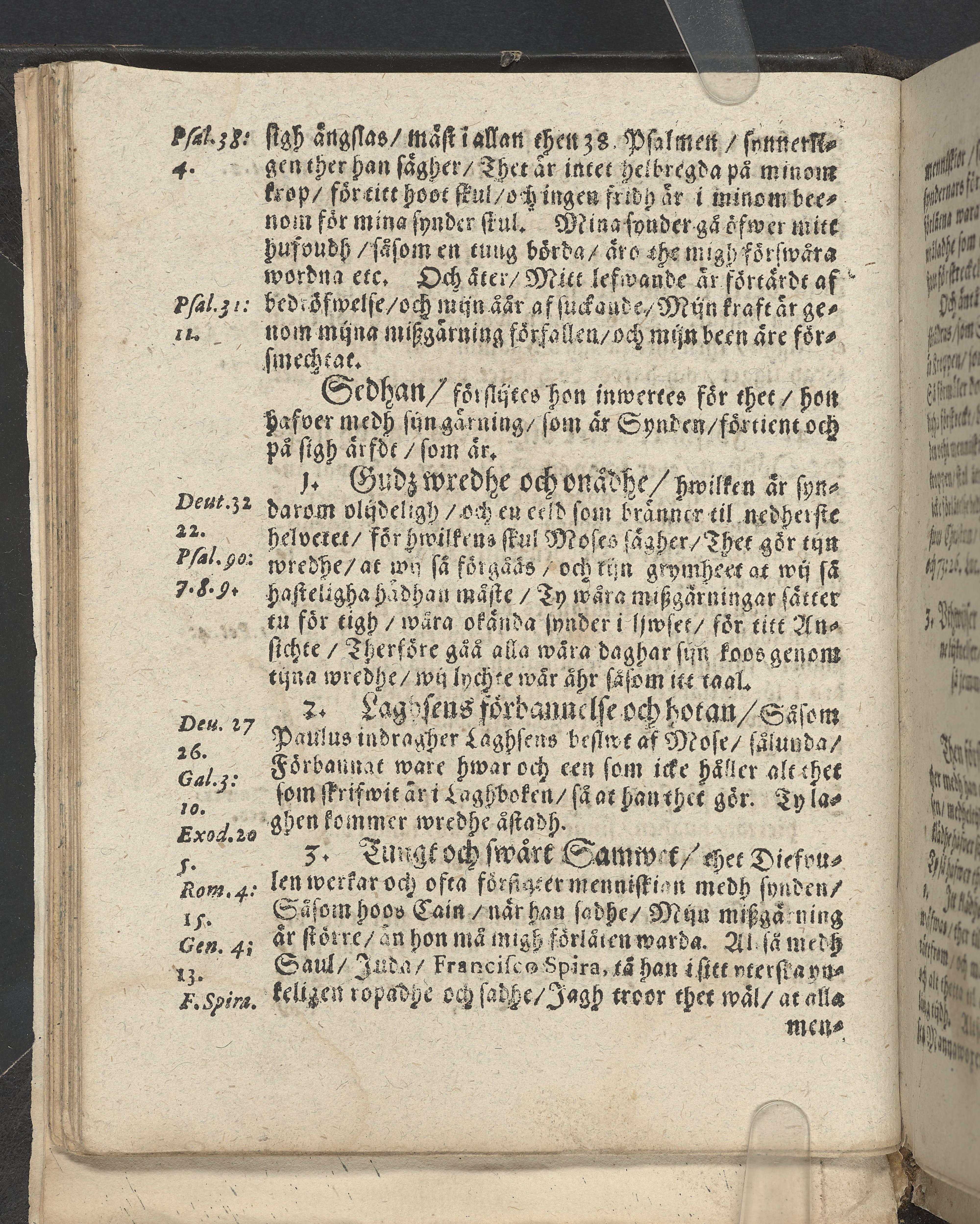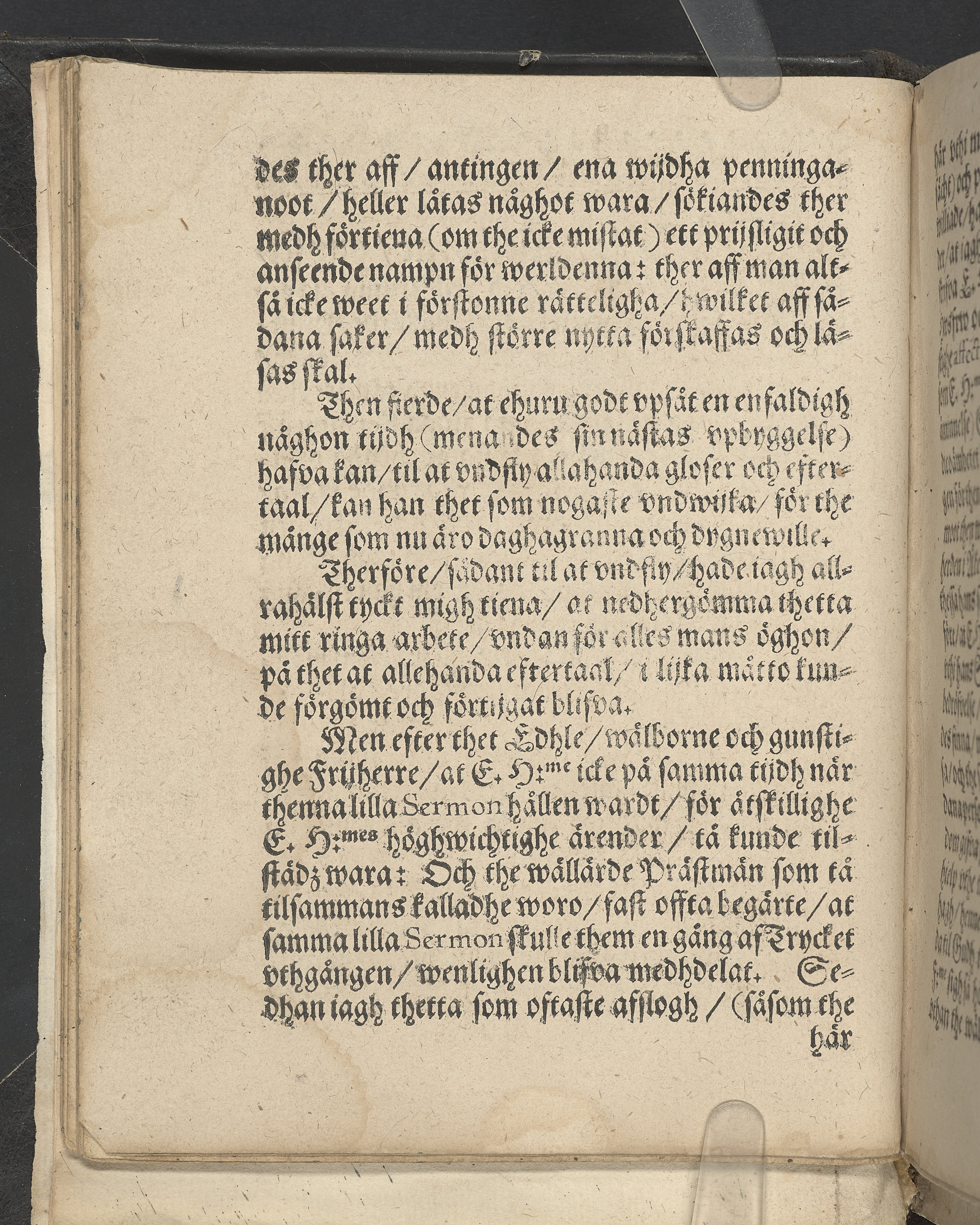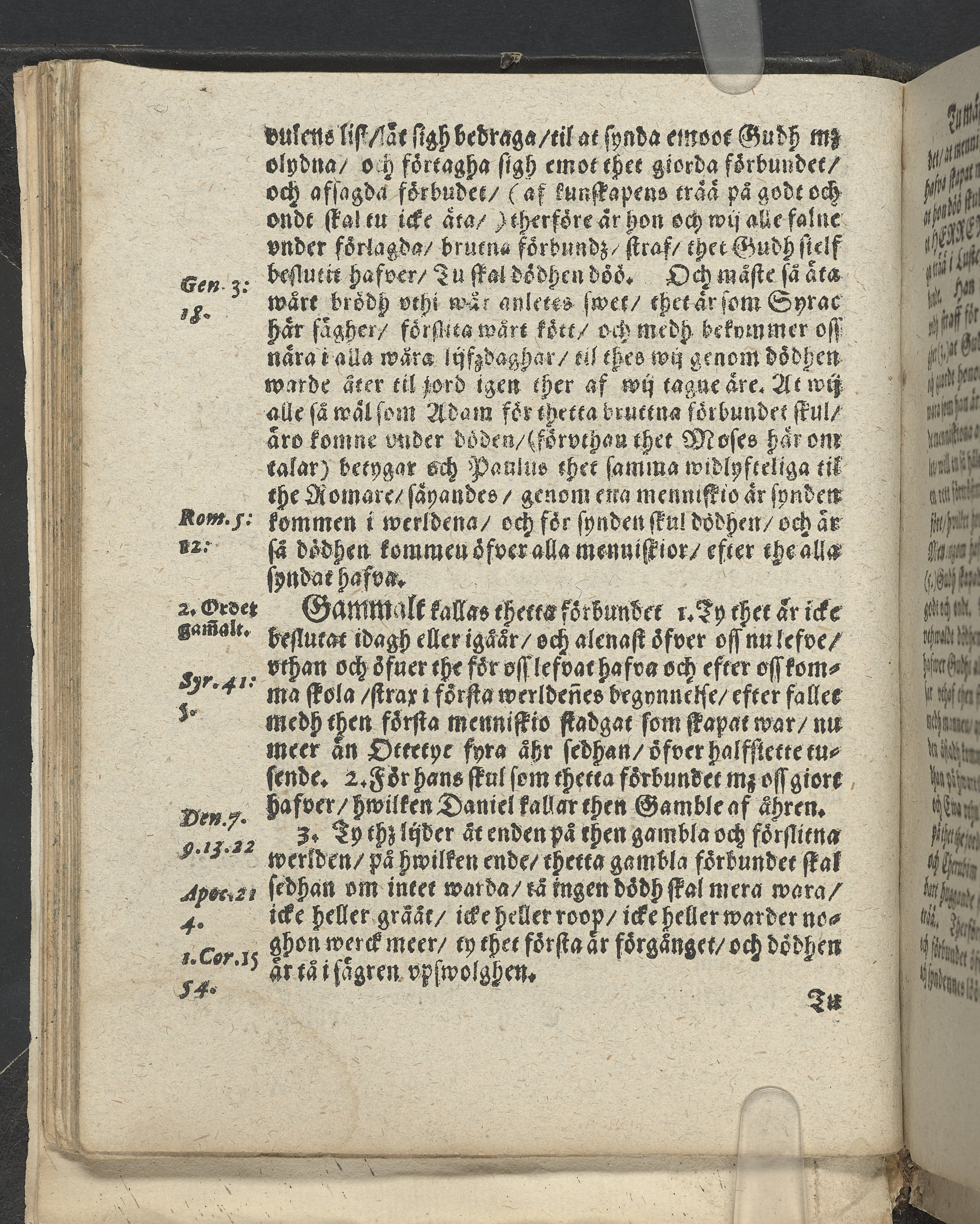 I övre högra hörnet på titelsidan (delvis beskuret) med bläck "2". I nederkant vänster på titelsidan med bläck "Tom. 1624". Snitt stänkta i rött och blått.