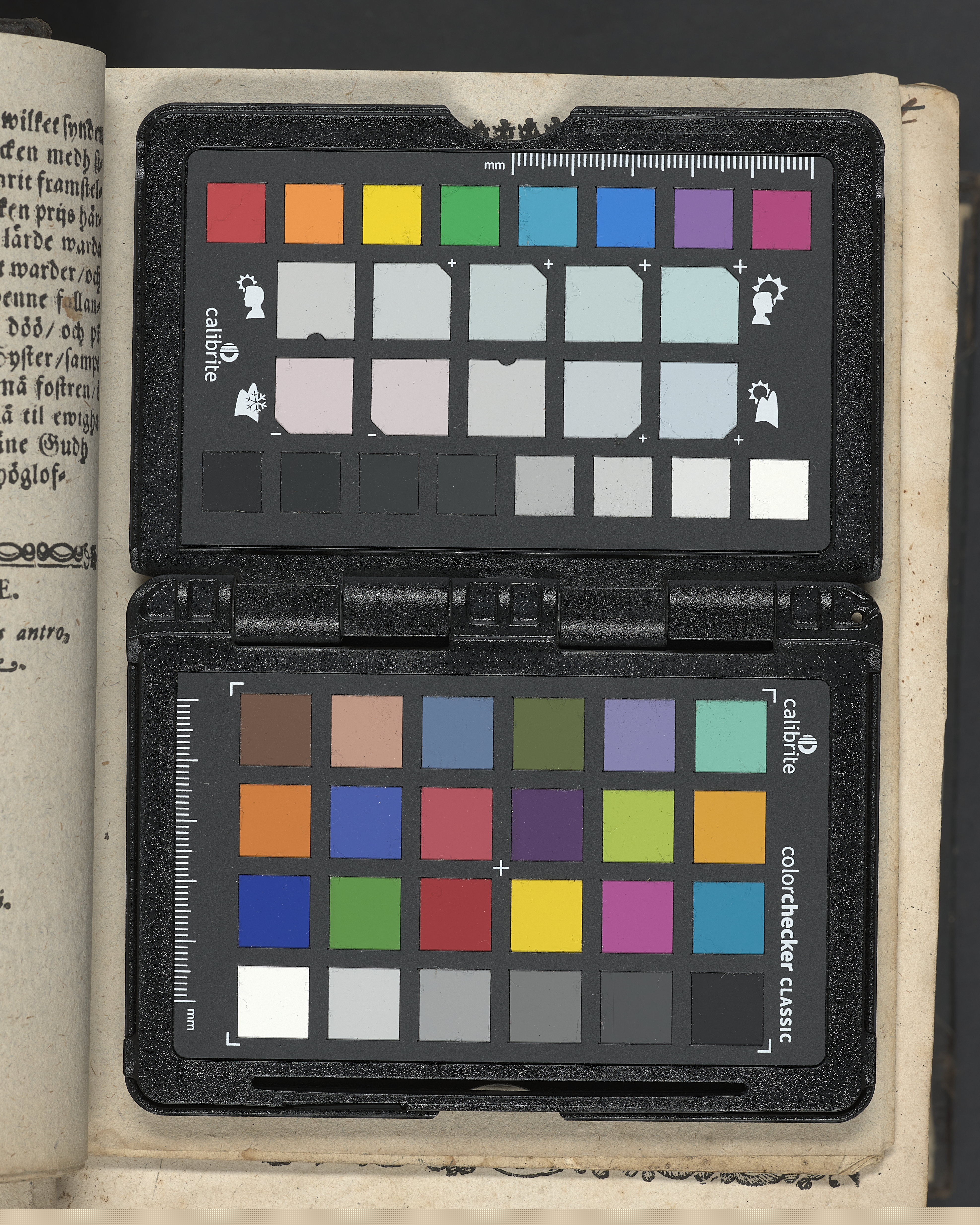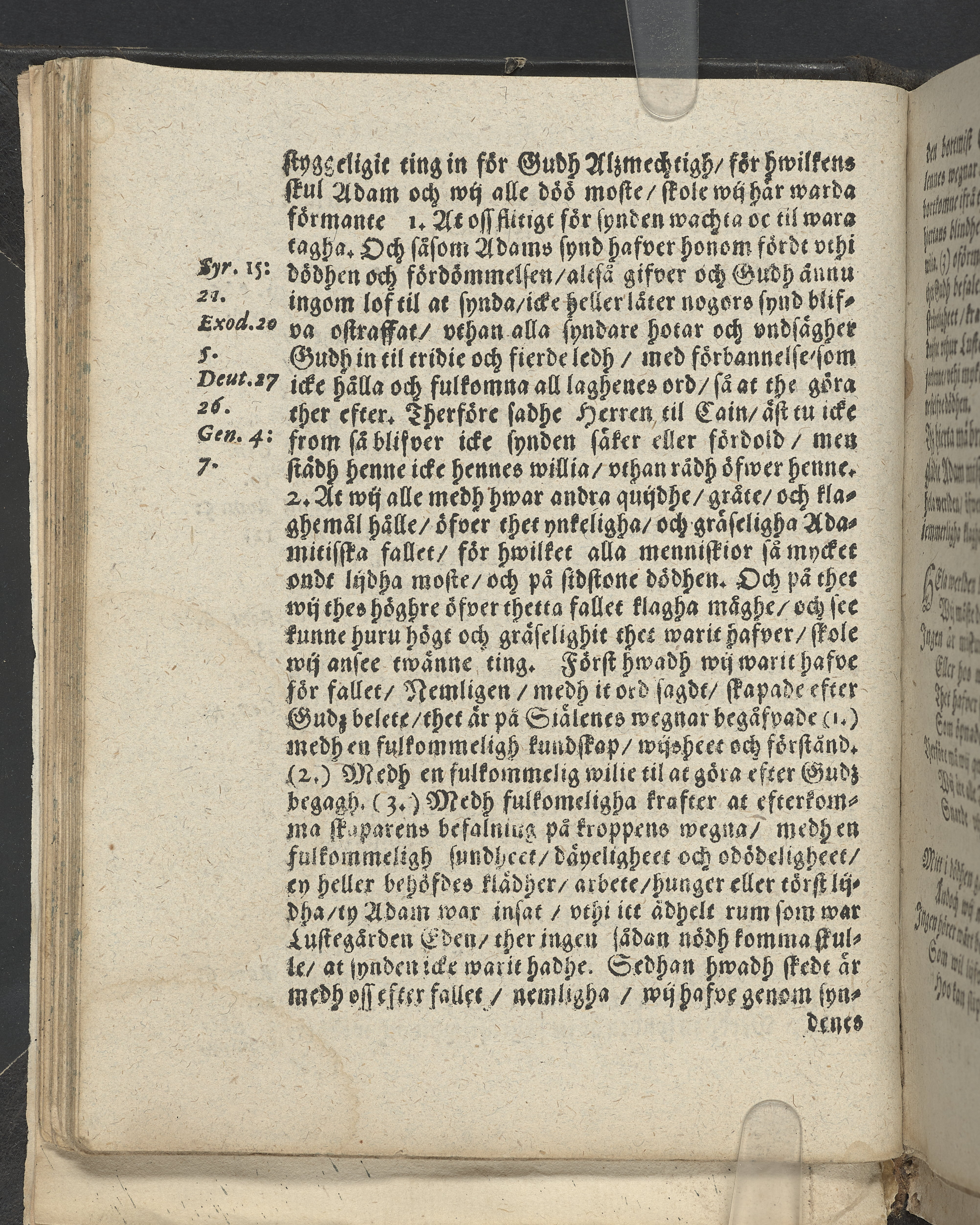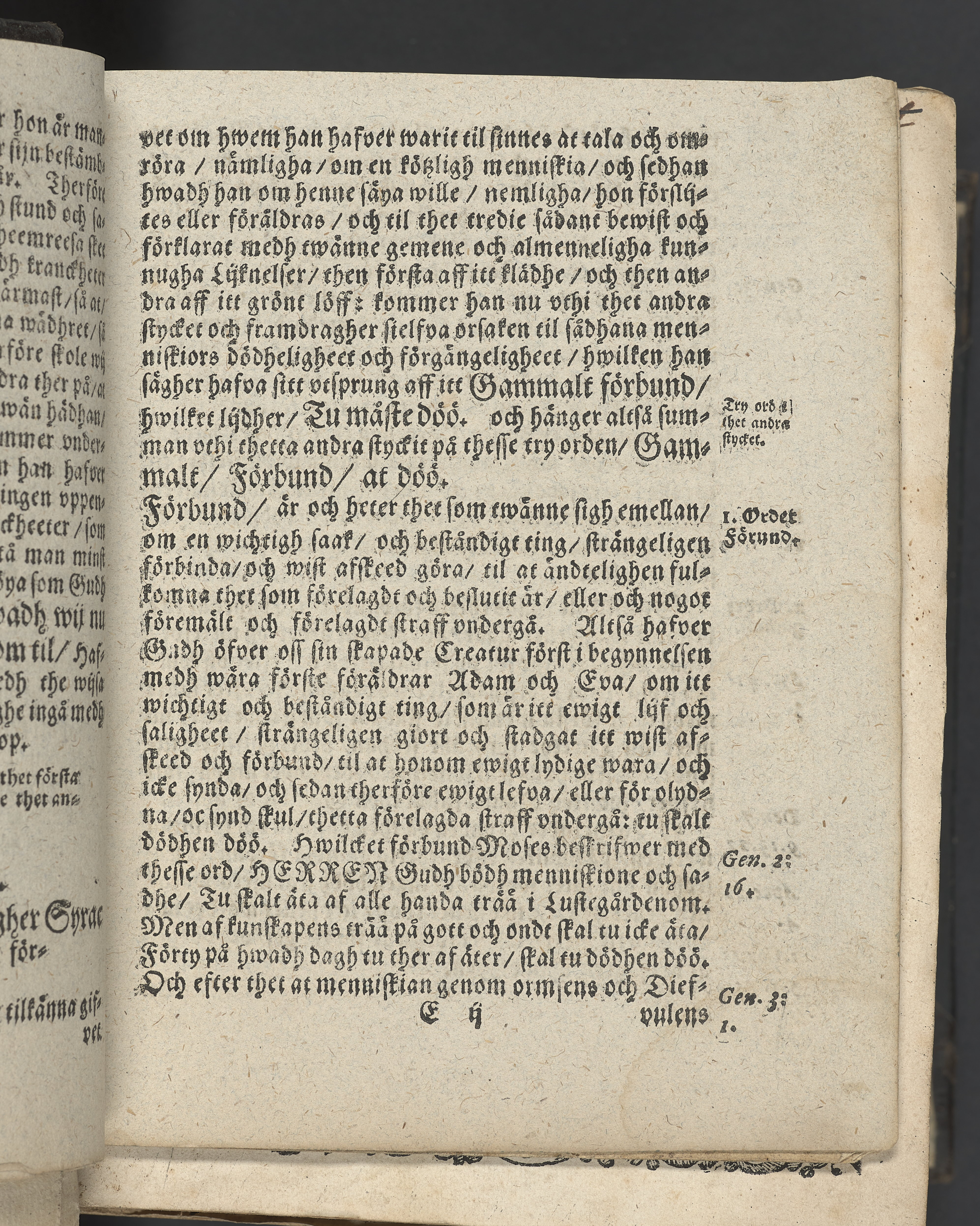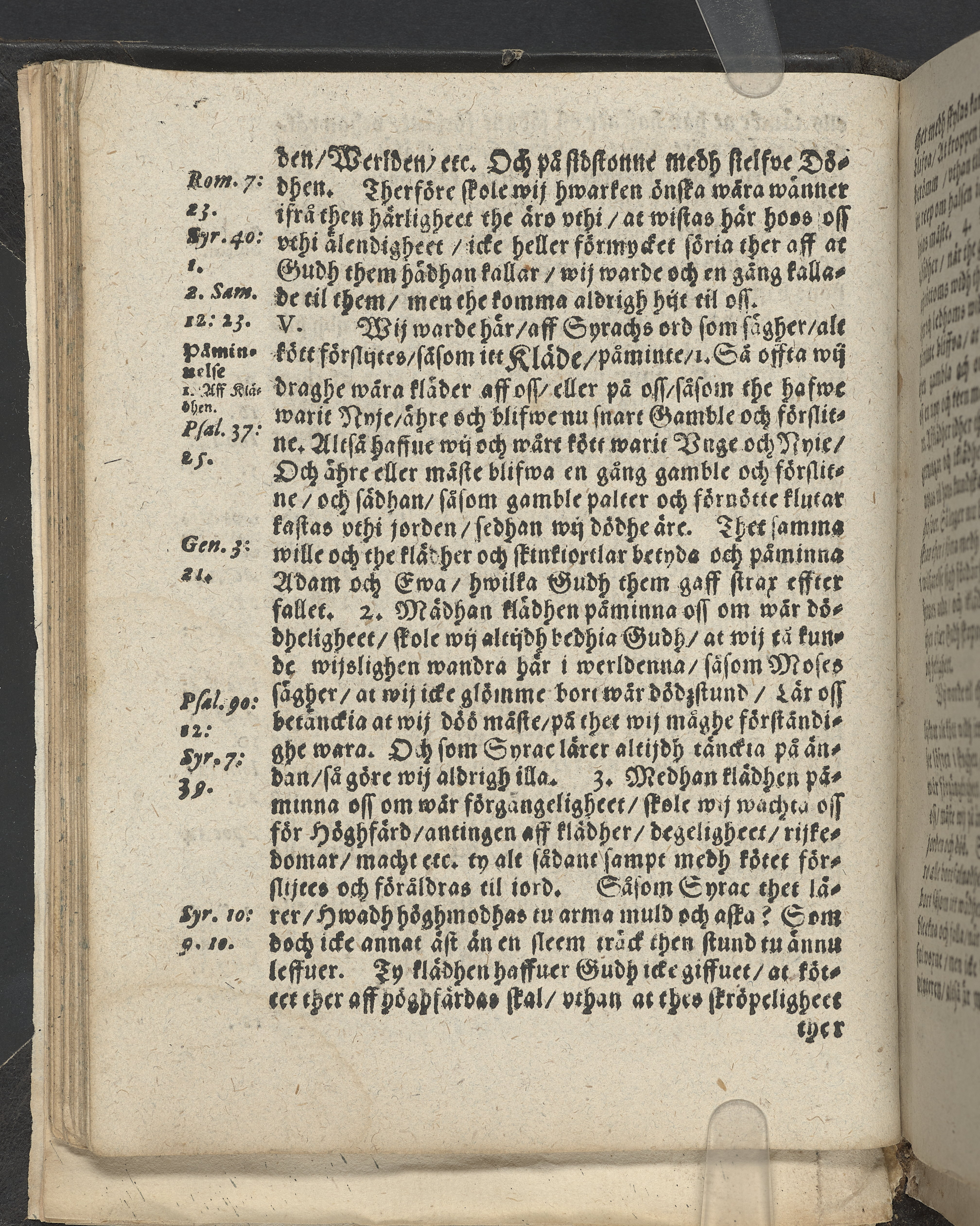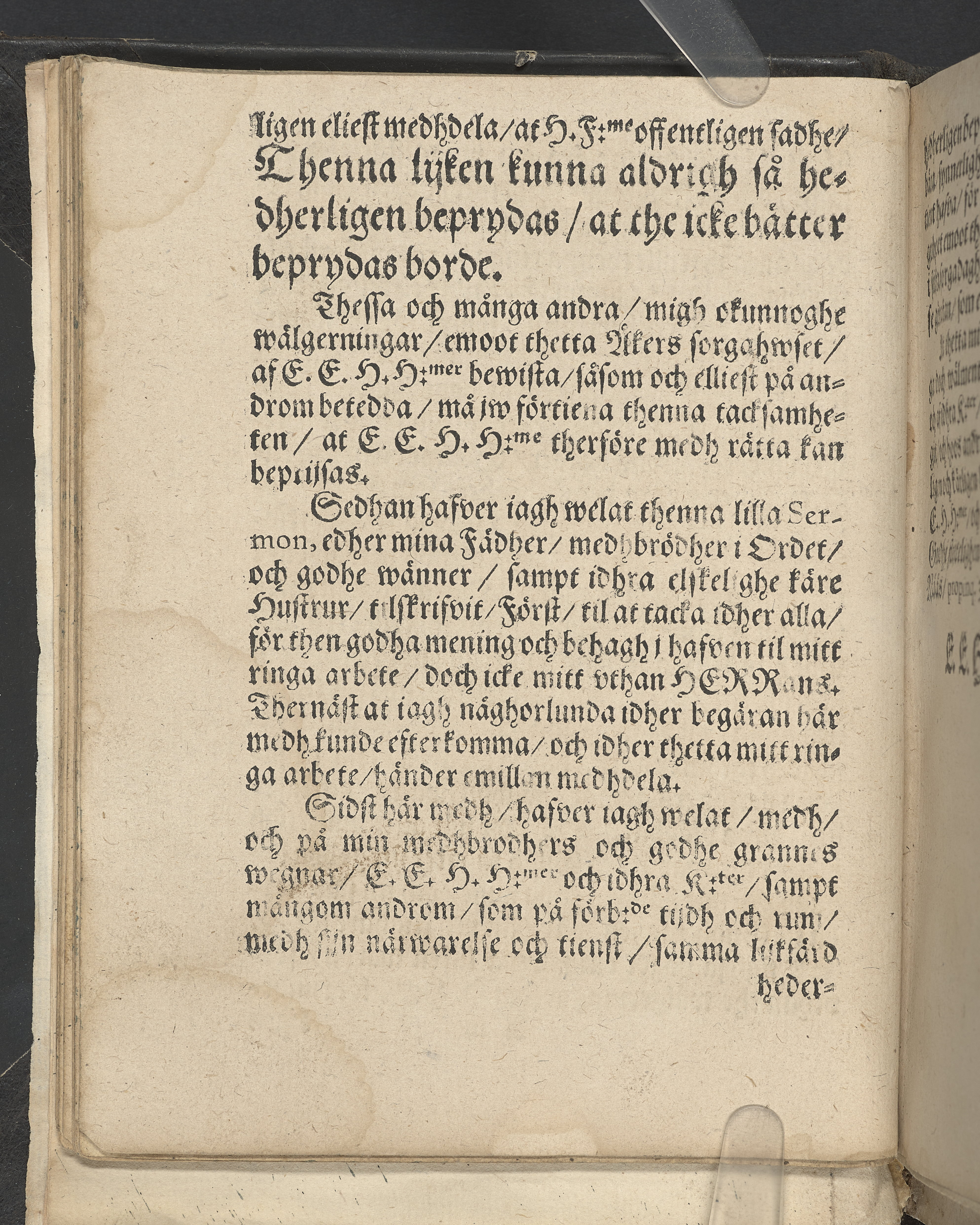 I övre högra hörnet på titelsidan (delvis beskuret) med bläck "2". I nederkant vänster på titelsidan med bläck "Tom. 1624". Snitt stänkta i rött och blått.
