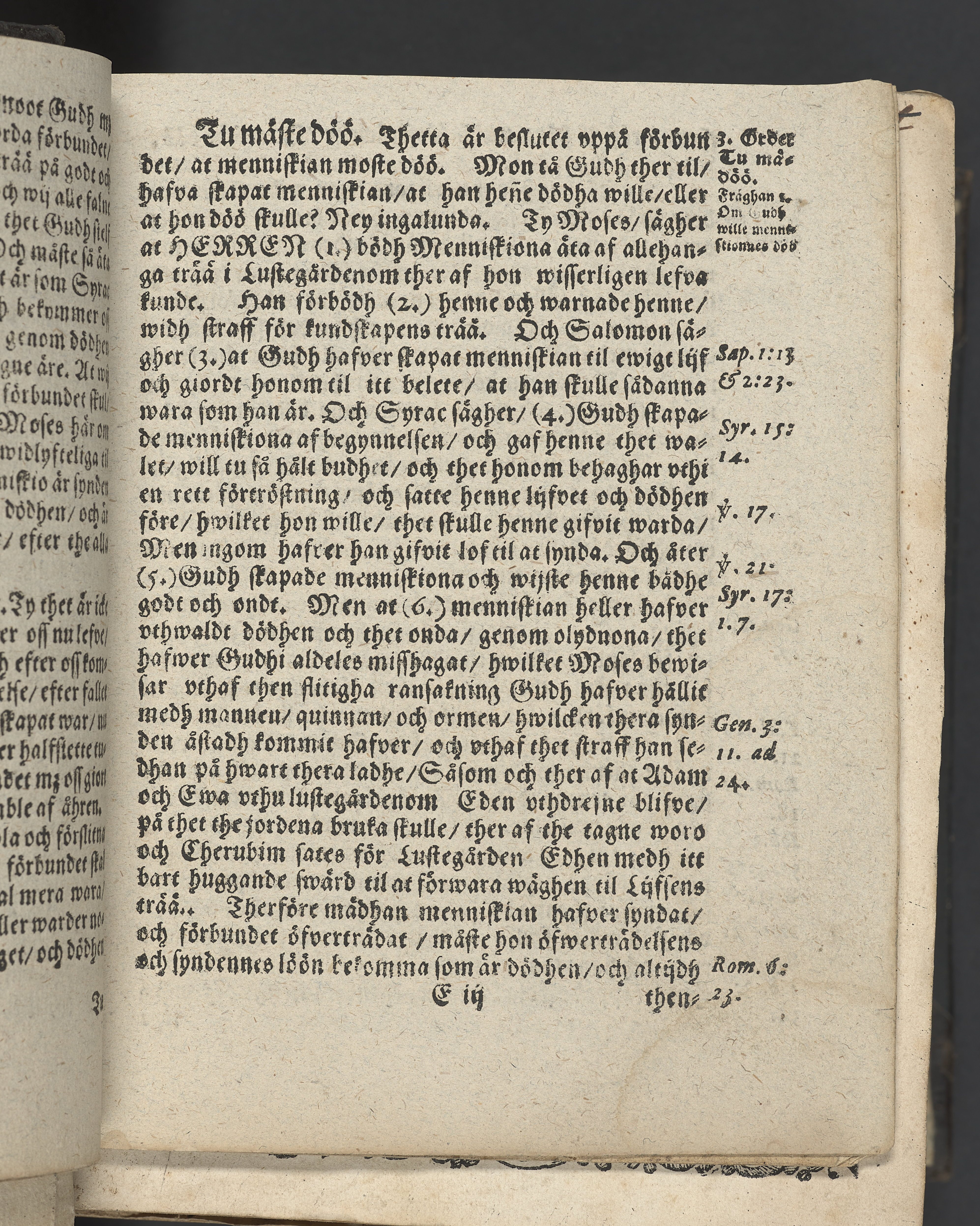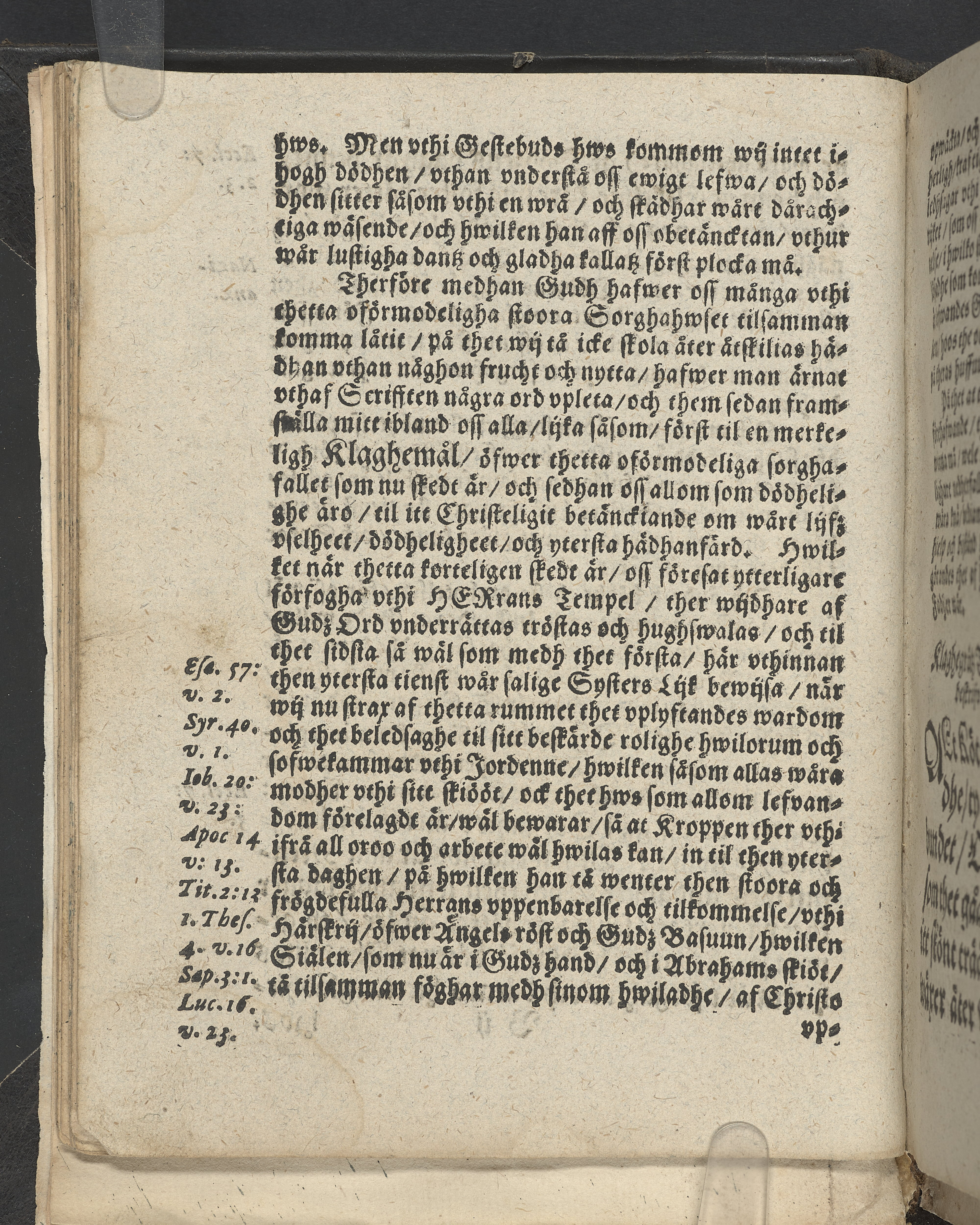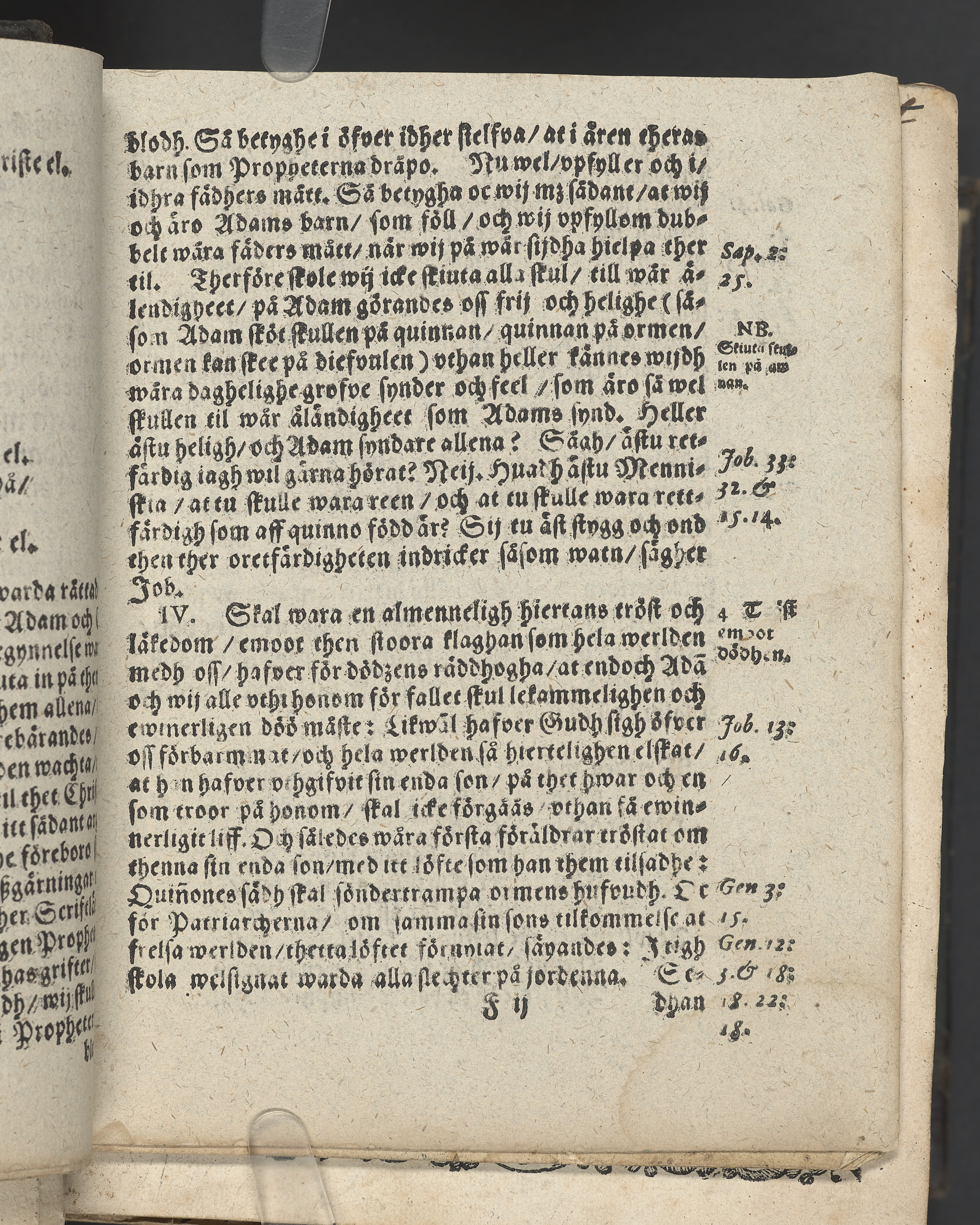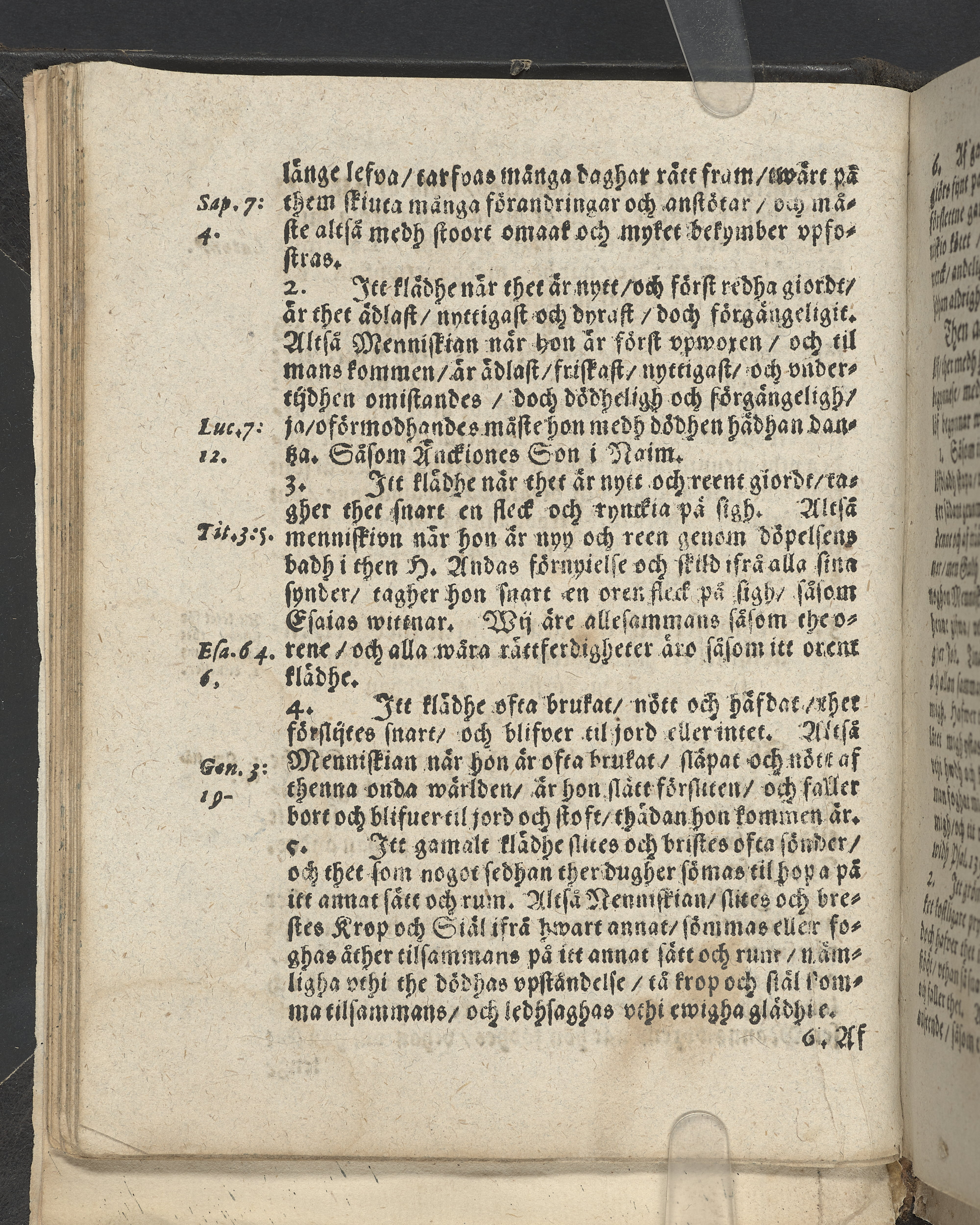 I övre högra hörnet på titelsidan (delvis beskuret) med bläck "2". I nederkant vänster på titelsidan med bläck "Tom. 1624". Snitt stänkta i rött och blått.