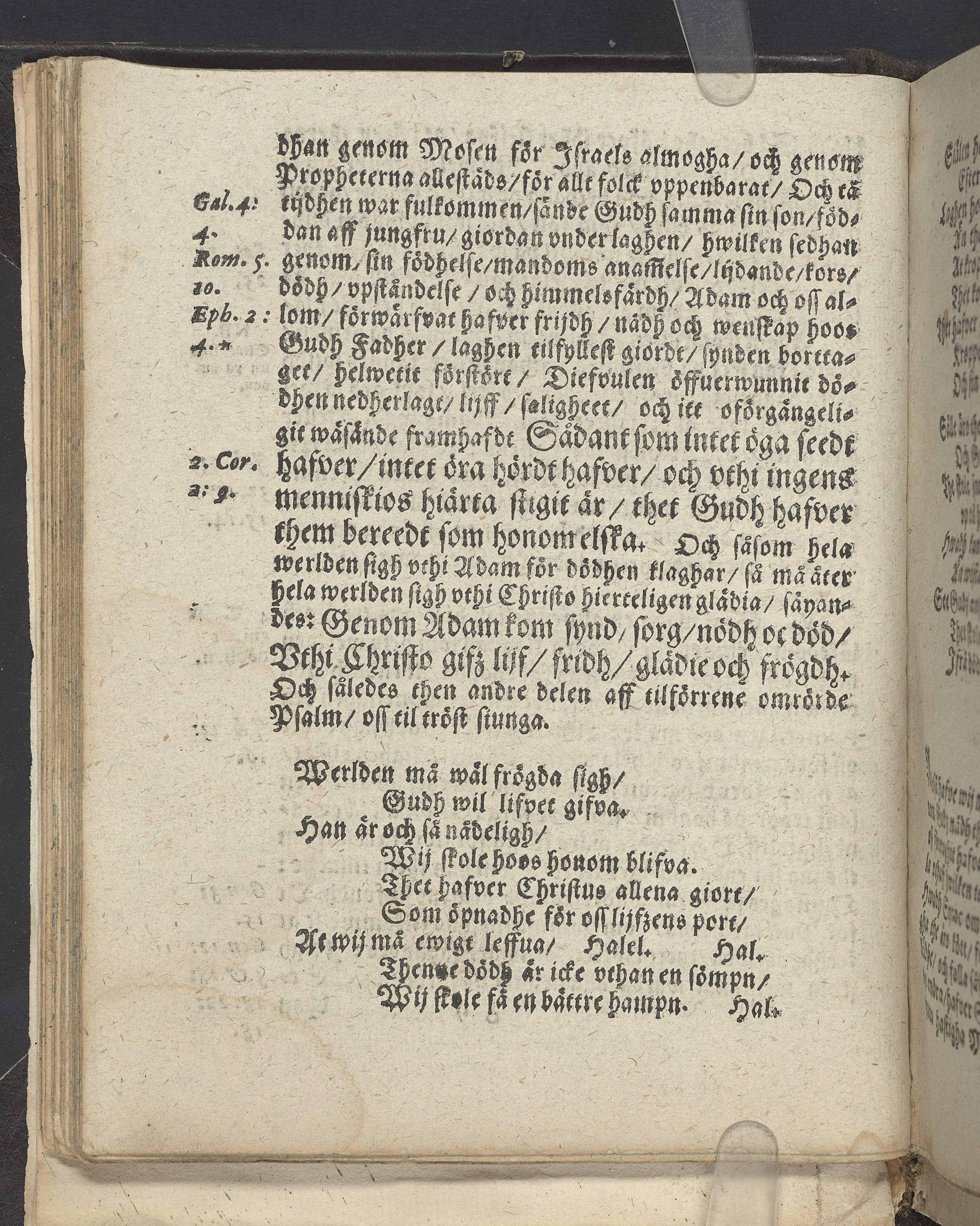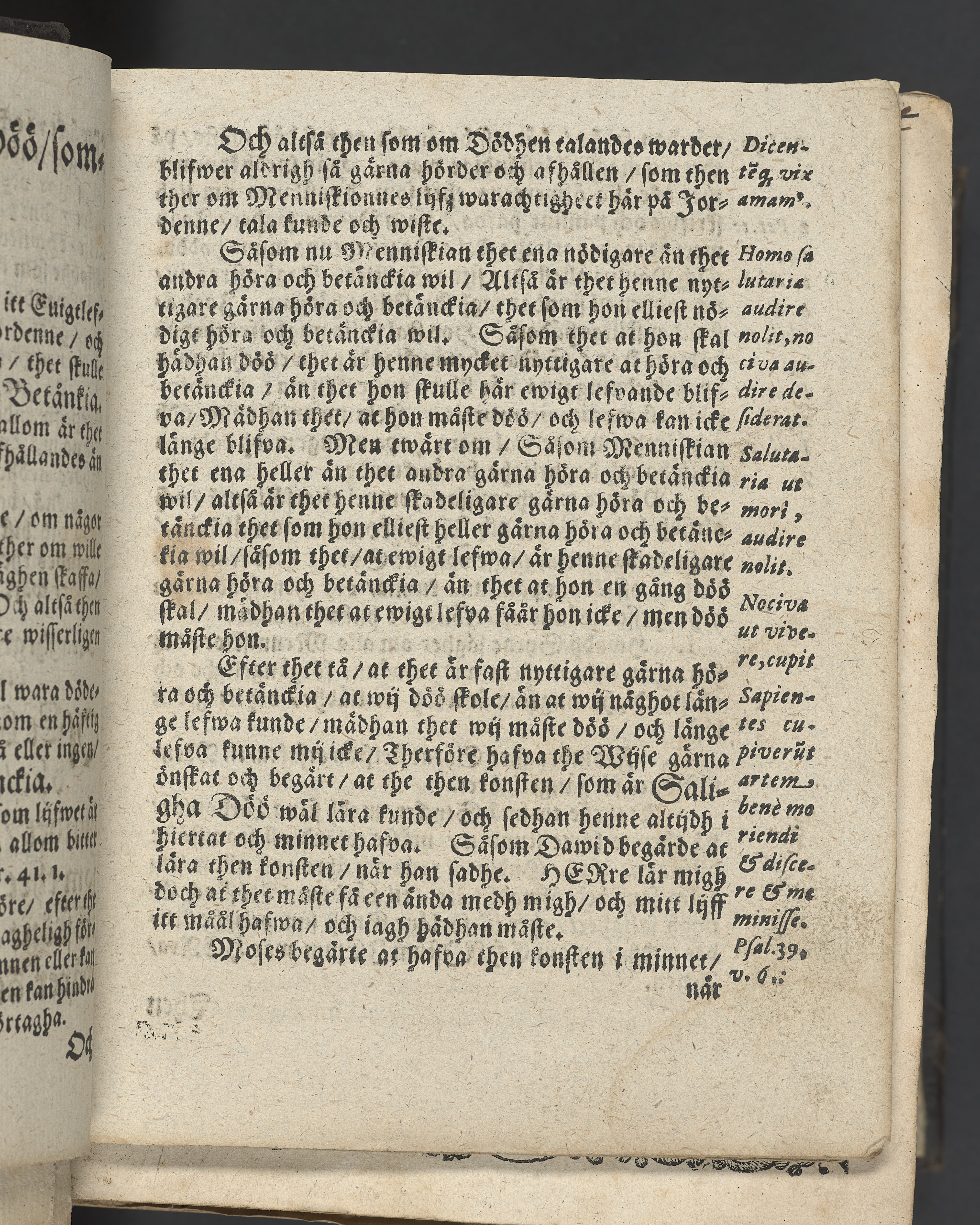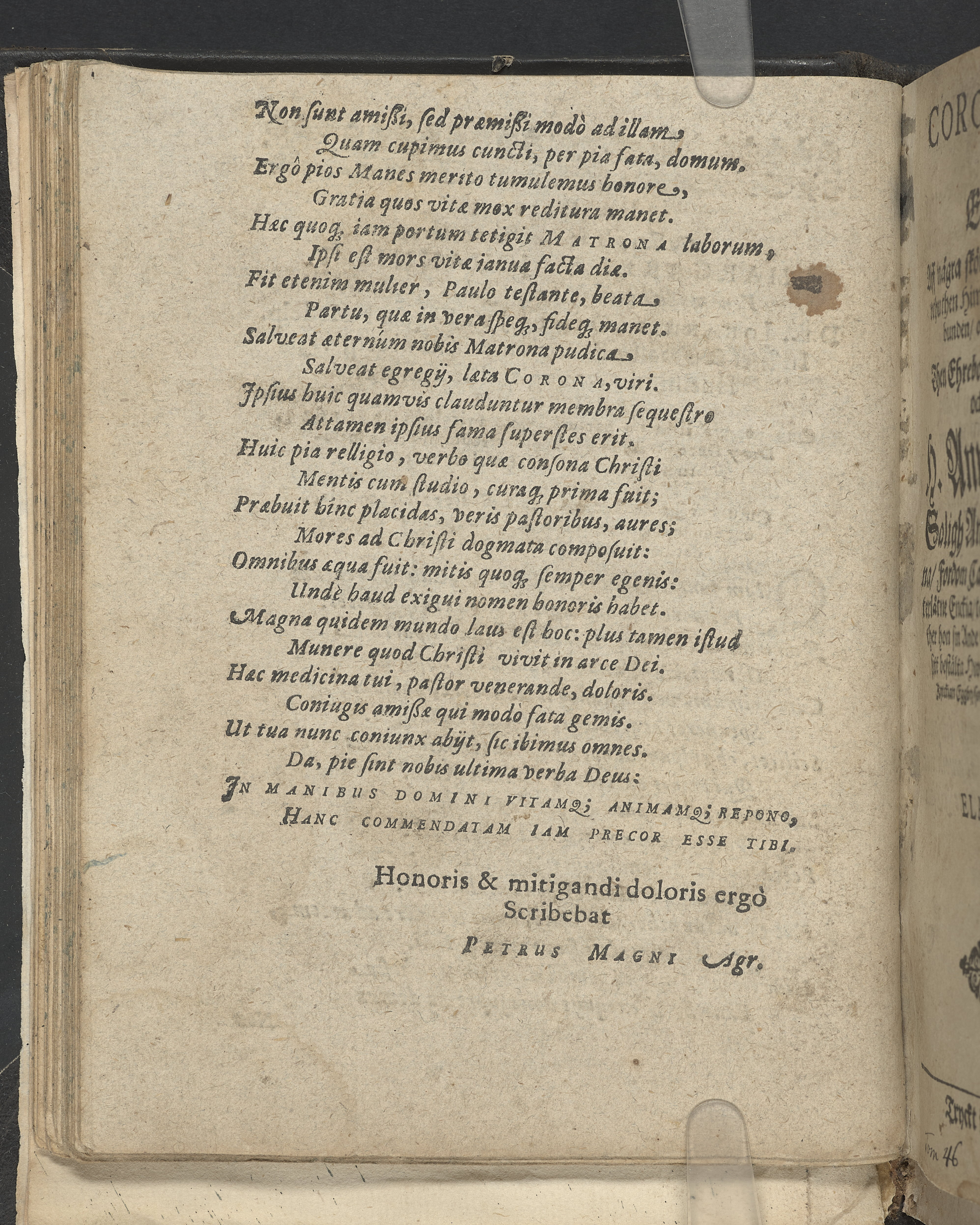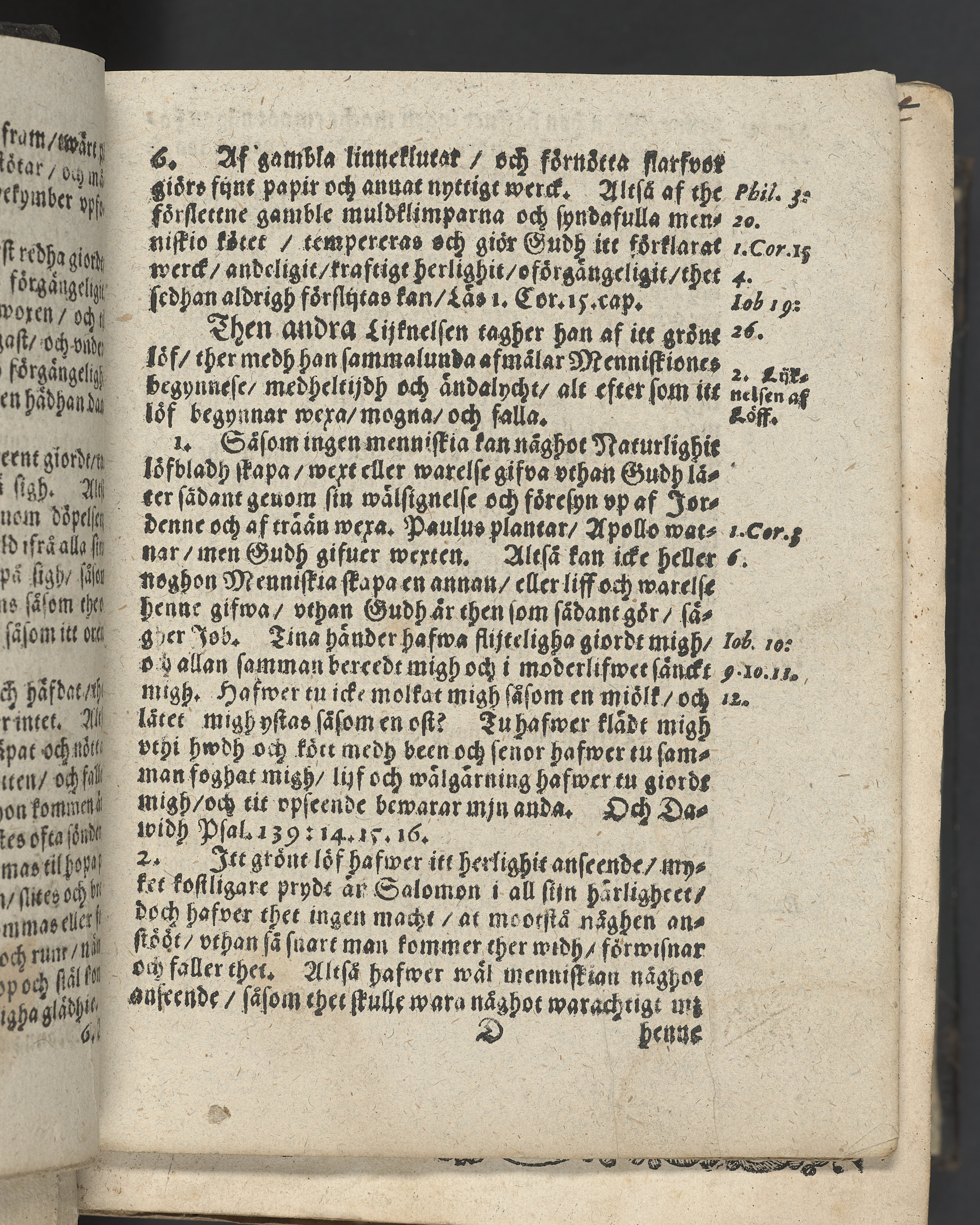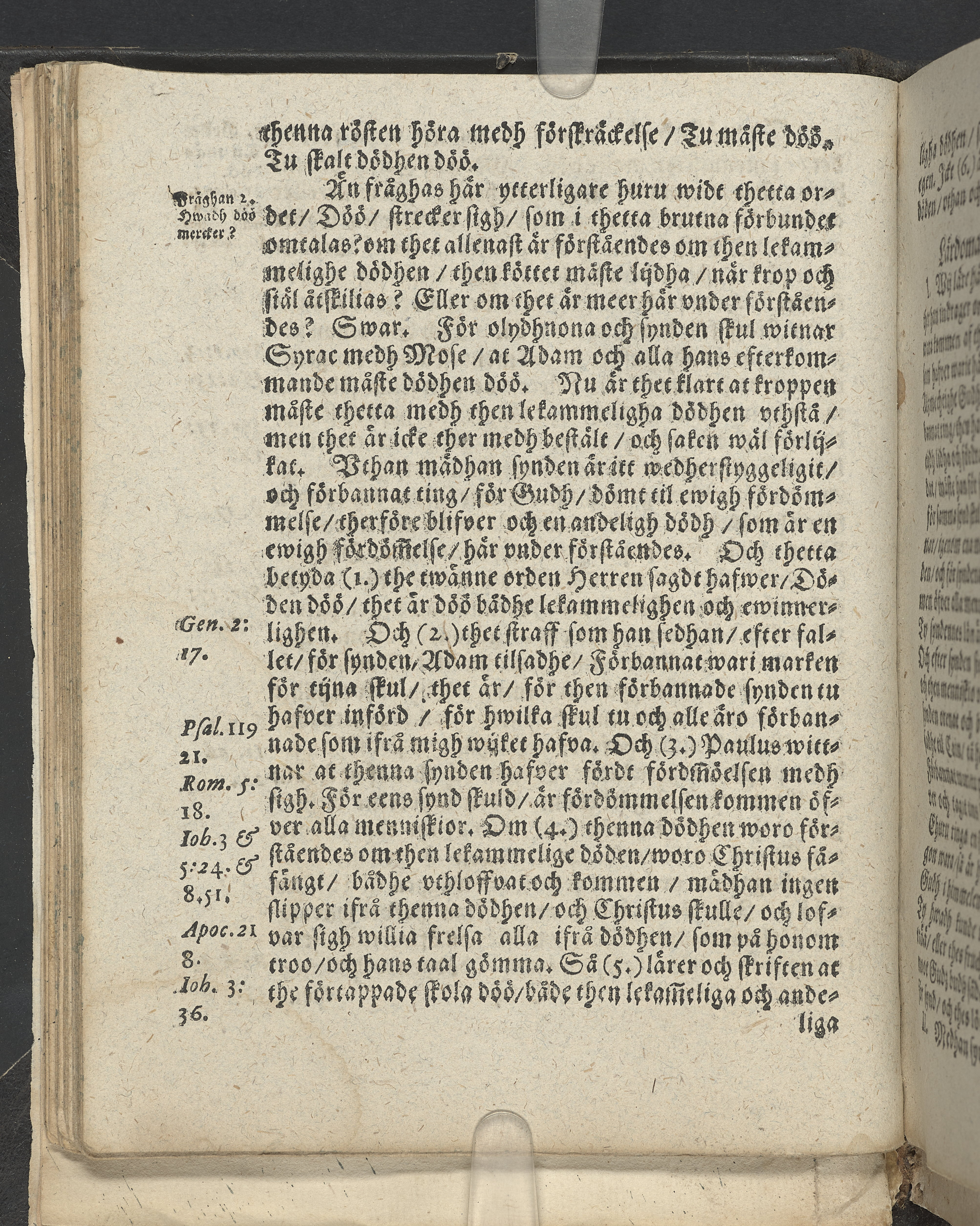 I övre högra hörnet på titelsidan (delvis beskuret) med bläck "2". I nederkant vänster på titelsidan med bläck "Tom. 1624". Snitt stänkta i rött och blått.