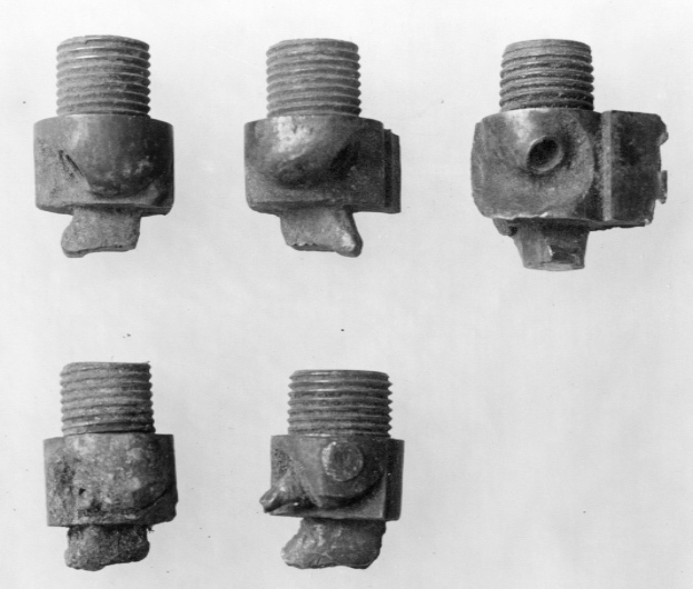 Gängad svansskruv med asymetriskt huvud. I änden ett borrat hål som förbinds med ett från sidan borrat och gängat hål.