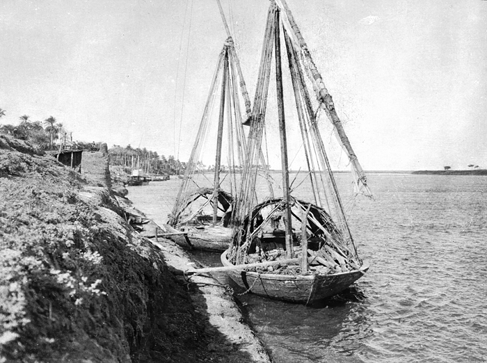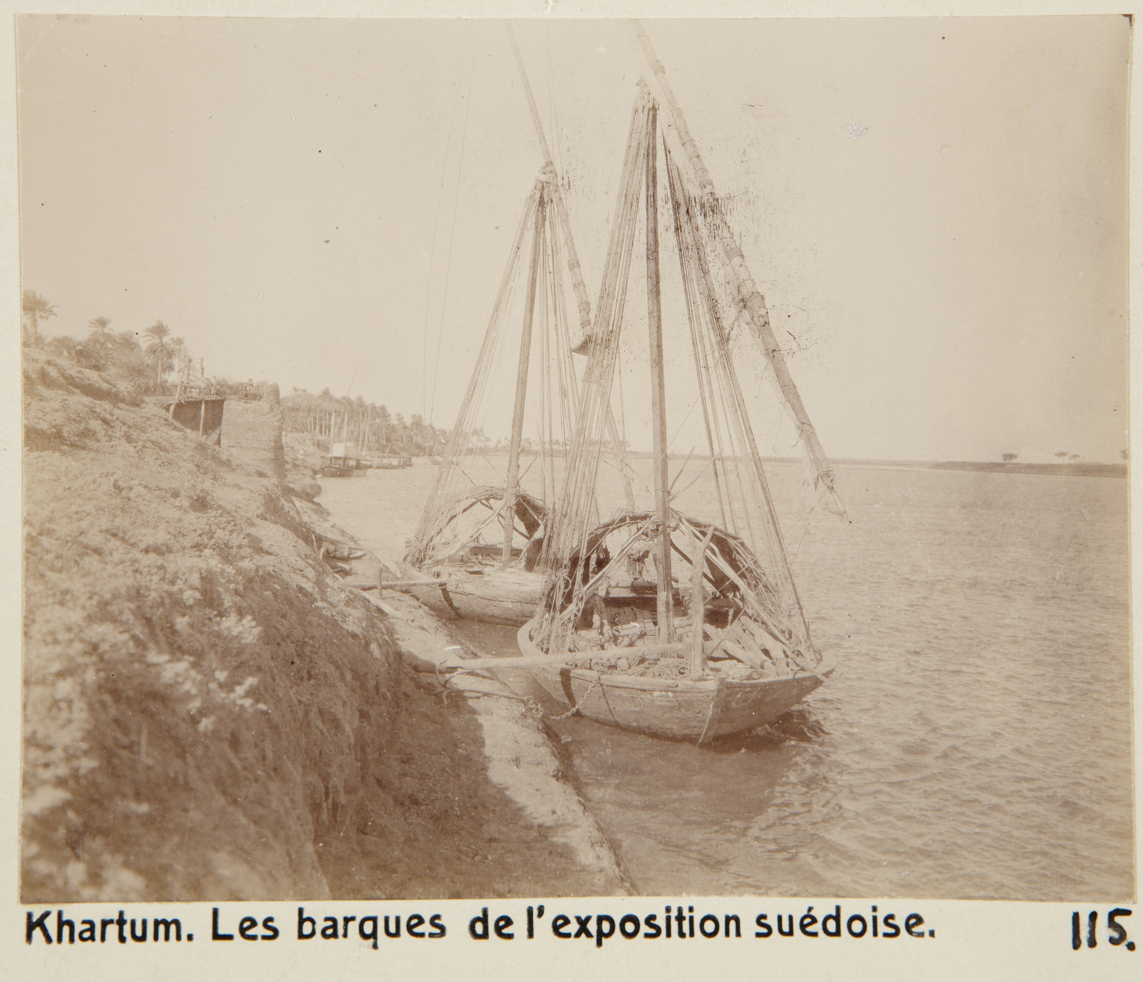 Khartoum, Sudan. Den svenska expeditionens båtar. På fotografiet står det "Khartum. Les barques de l'exposition suédoise" - den svenska utställningens båtar - men i museets katalog står det "l'expédition suédoise". Fotografierna LXVI:M.01.- 201. kommer från resan till Egypten och Sudan som Wilhelmina och Walther von Hallwyl gjorde vintern 1900-1901. De lämnade Sverige den 5 november 1900 och fortsatte från Egypten till Palestina den 28 mars 1901. Med på resan var döttrarna Ellen med maken Henric de Maré och Irma med maken Wilhelm von Geijer. Wilhelminas sällskapsdam, fröken Ida Uhse reste också med. Under en del av resan anslöt sig ledamoten av Internationella domstolen i Kairo, assessorn Otto Conrad Waldemar Cedercrantz med makan Anna Elisabeth. Vid resan uppför Nilen hade Walther von Hallwyl hyrt ångfartyget Columbia med besättning. Båtresan startade i Kairo 27 december 1900, gick ända till Wadi Halfa varifrån man reste vidare med tåg till Khartum och tillbaka till Wadi Halfa. Båten vände åter i riktning mot Kairo, men det verkar som att sällskapet tog tåg sista biten, från Luxor. Henric och Ellen de Maré samt fru Cedercrantz lämnade båten redan då de passerade Luxor första gången. Resten av sällskapet återvände till Kairo den 1 mars. Fotografierna LXVI:M.01.-120. togs av resenärerna själva, de största av Ellen de Maré, de mellersta av Wilhelmina von Hallwyl och de minsta av Wilhelm von Geijer. Resten köptes av professionella fotografer i Kairo, de flesta från Studio Photogr. Artistique G. Lekegian & Cie. Alla uppgifter kommer från Ida Uhses reseanteckningar.