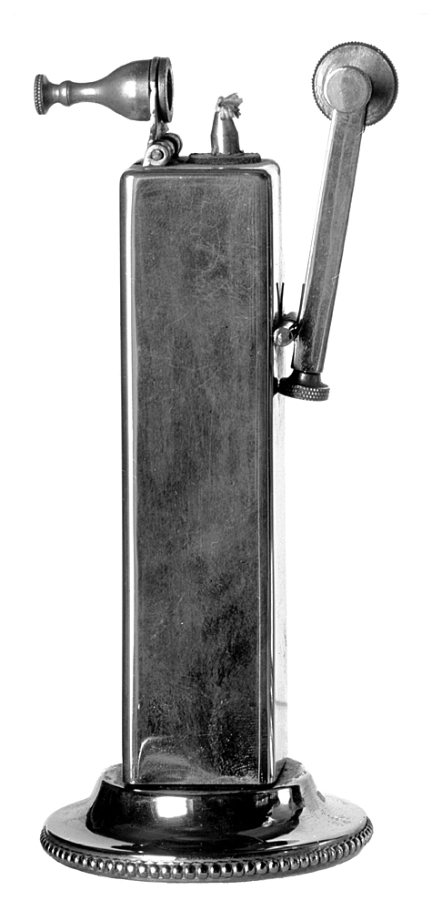 CIGARRTÄNDARE (för sprit). Av nickel. Hög fyrsidig pelare på rund fotplatta. Fotplattan genom en kort tapp skruvbar i tändaren. Inuti tändaren vit bomull, som uppsuger spriten, då tändaren påfylles. Höjd: 14,5 cm. Fotplatta, diameter: 5,8 cm. Gåva till Walther von Hallwyl Julaftonen 1914 från hans f. d. svärson kammarherren Alfred Henrik de Maré.