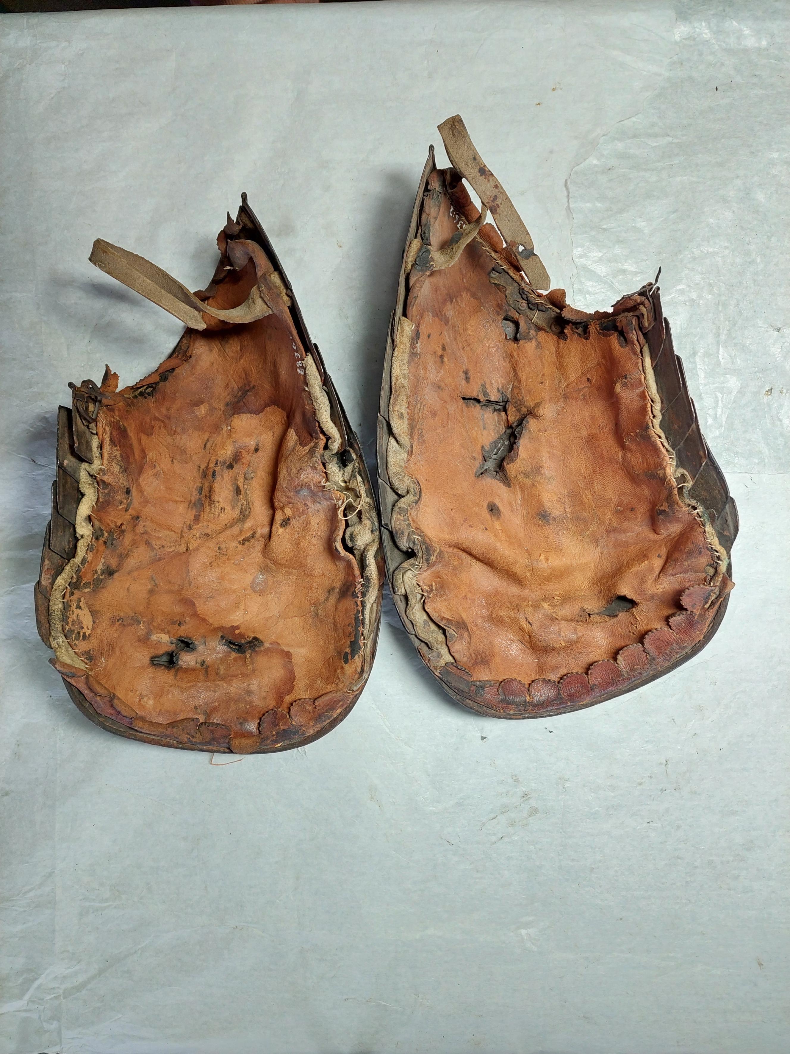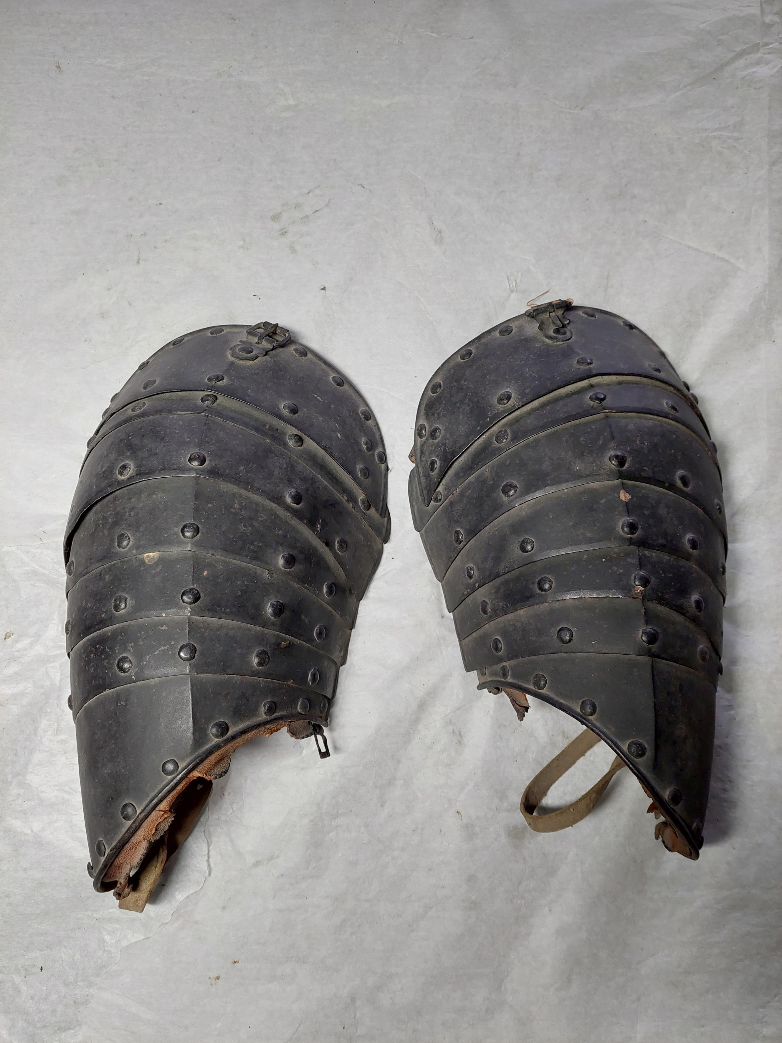 :1 vänster :2 höger Av svartmålat stål med övermålade nitar. Bestående av sju lameller. Översta lamellen med ett spänne - för fästande i ringkragen. Axelstyckena kantade med uddbårder av läder. Brunt läder-foder. I nederkanten spänne och rem.