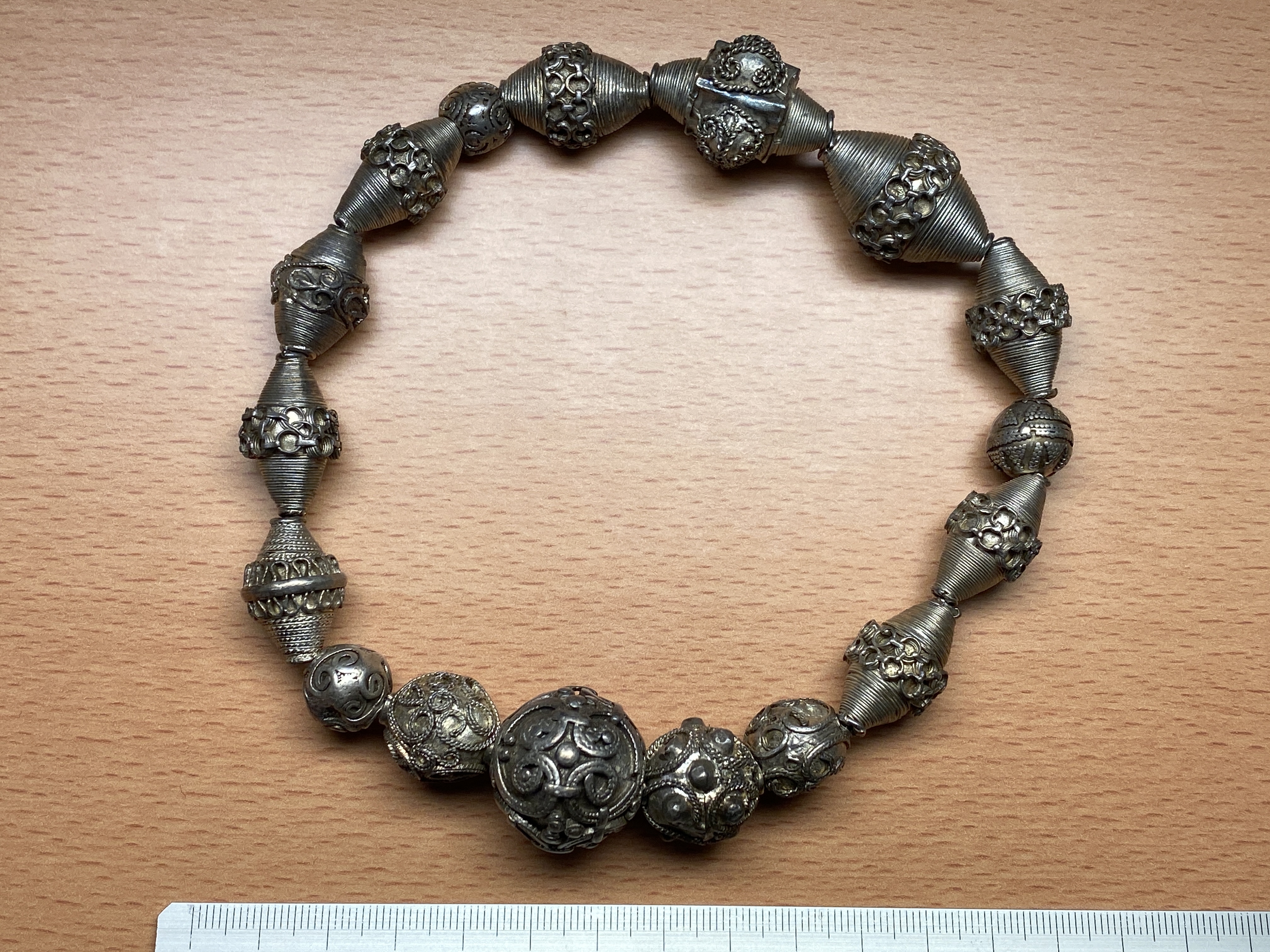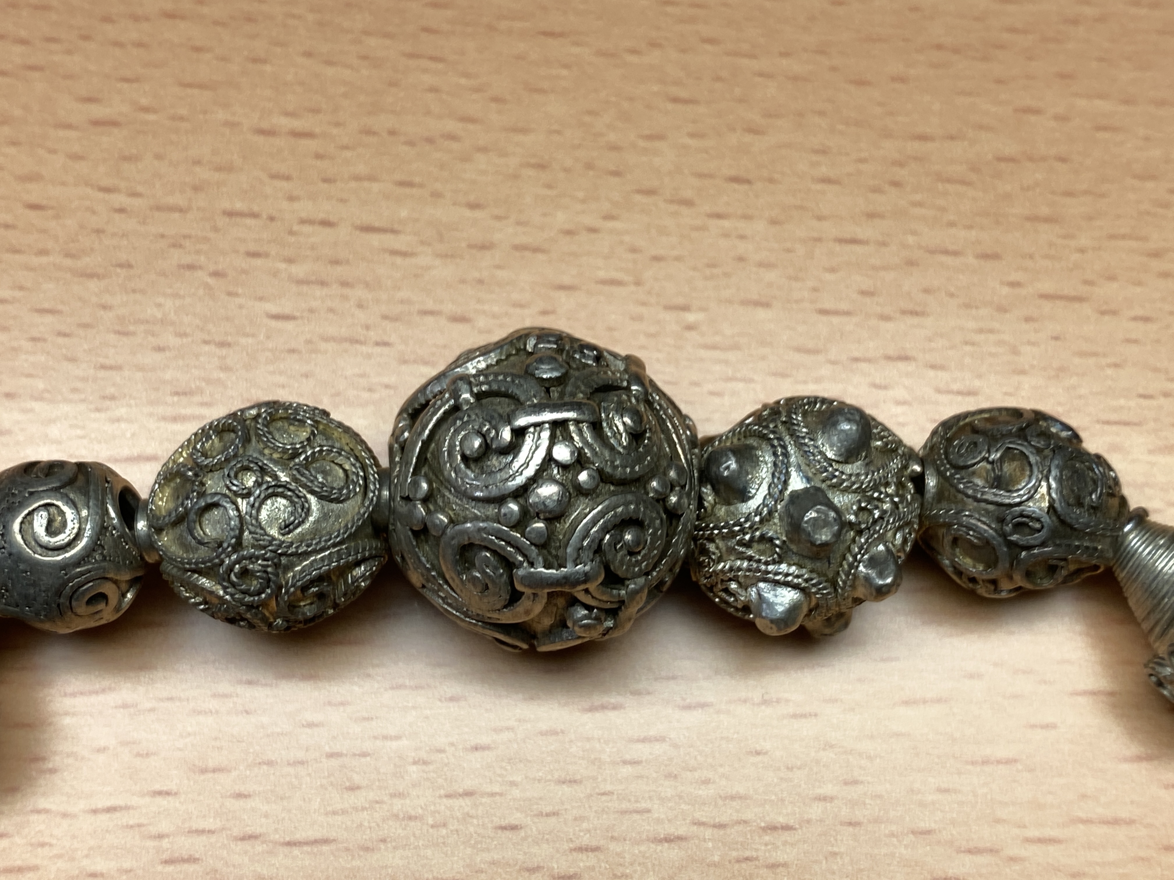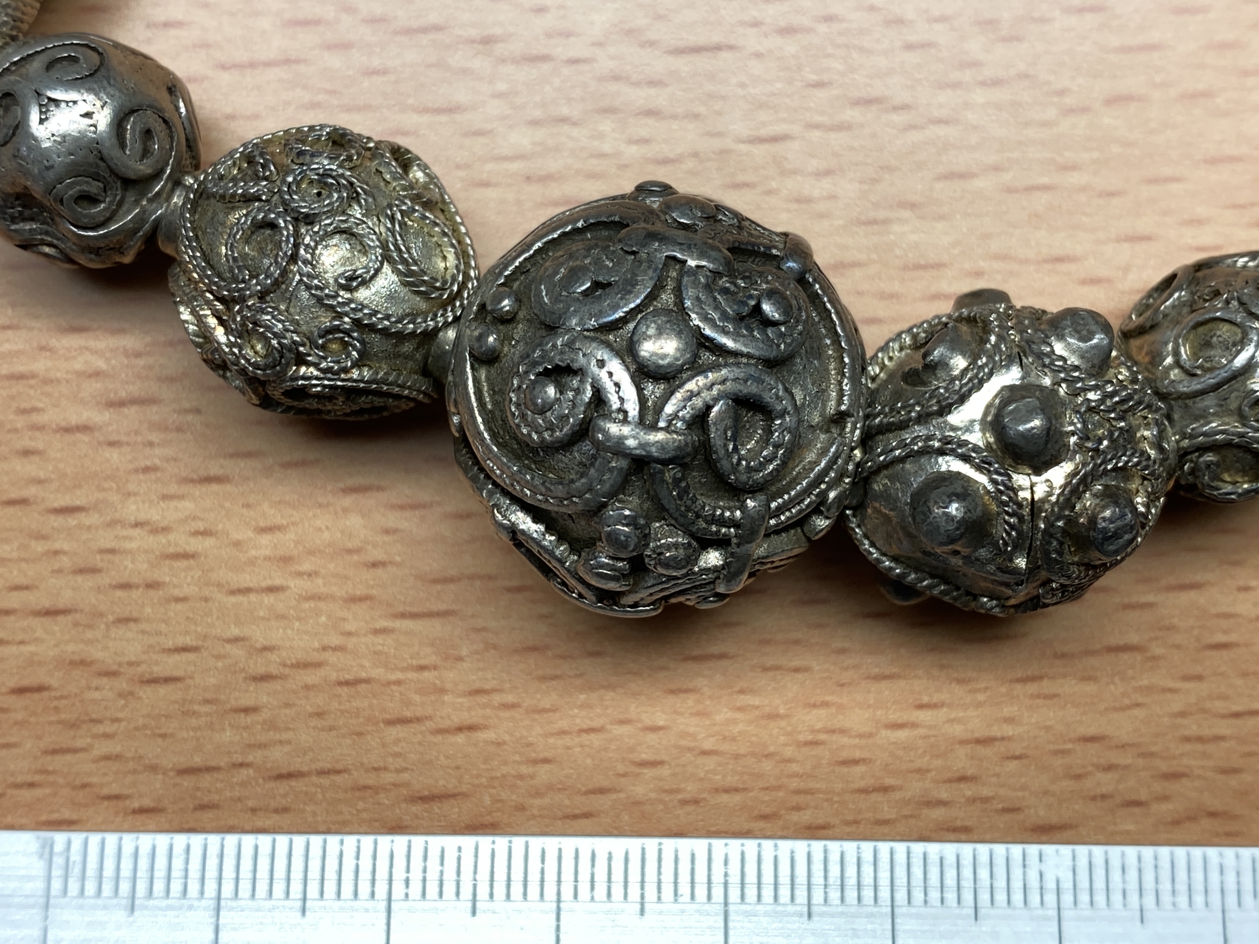 7 sfäriska pärlor med filigran dekor och granulering i olika mönster. Storlekar mellan 24 till 10 mm.