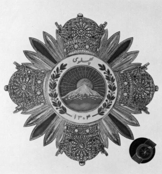 Fyra kejsarkronor av silver, (platina ?) ornerade med orange, grön, vit och blå emalj, ställda i kors runt medaljong täckt med ljusblå emalj, därpå målat strålande sol av guld, som går upp bakom snötäckt berg (Demavand) av grå och vit emalj. Runtom en vitemaljerad ring med iranska skrifttecken av guld samt två grönemaljerade lagerkvistar. Mellan kronorna fem välvda spetsiga strålar av förgyllt silver, repstavskanter, de mittersta strålarna täckta av blå emalj. Frånsidan slät, vertikalt placerad säkerhetsnål samt två hakar, på nålen en liten stämpel, kugghjul, AB & Cie, 800.