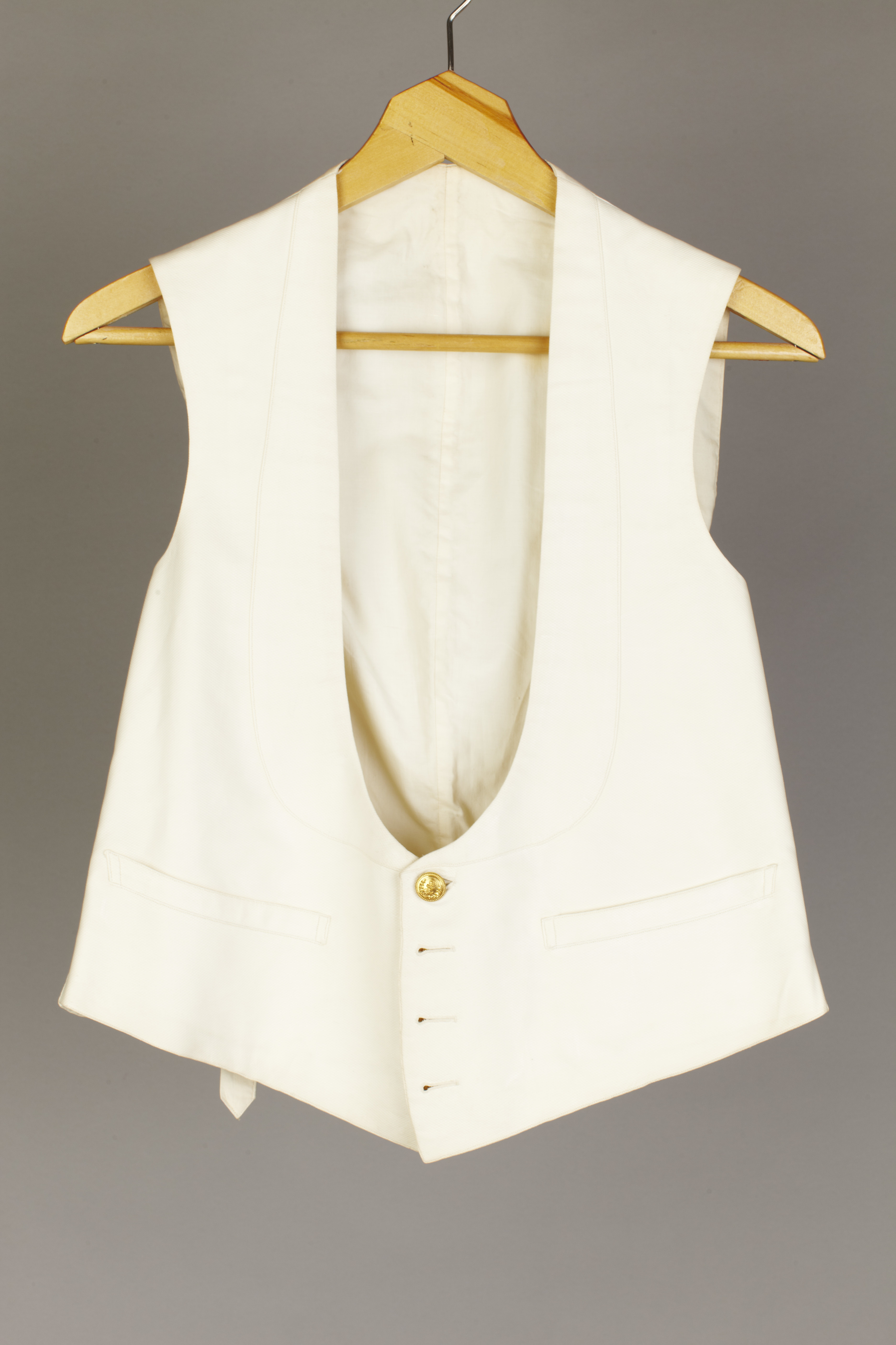 Vit väst av bomullspiké med schalkrage och knäppning med enkel rad om fyra knappar. Knapparna förgyllda, med krönt ankare, lagerkvist och repstavsbård, allt i kraftig relief, d: 17 mm, på undersidan inpräglat: " JENNENS & Co // LONDON ". Två stolpfickor fram. Ryggstycke av vit bomullstuskaft, samma tyg i livstyckenas foder. Nedtill bak sprund och spänntampar med förgylld mässingssölja, märkt: " PARIS // MARSHALL & Co ".