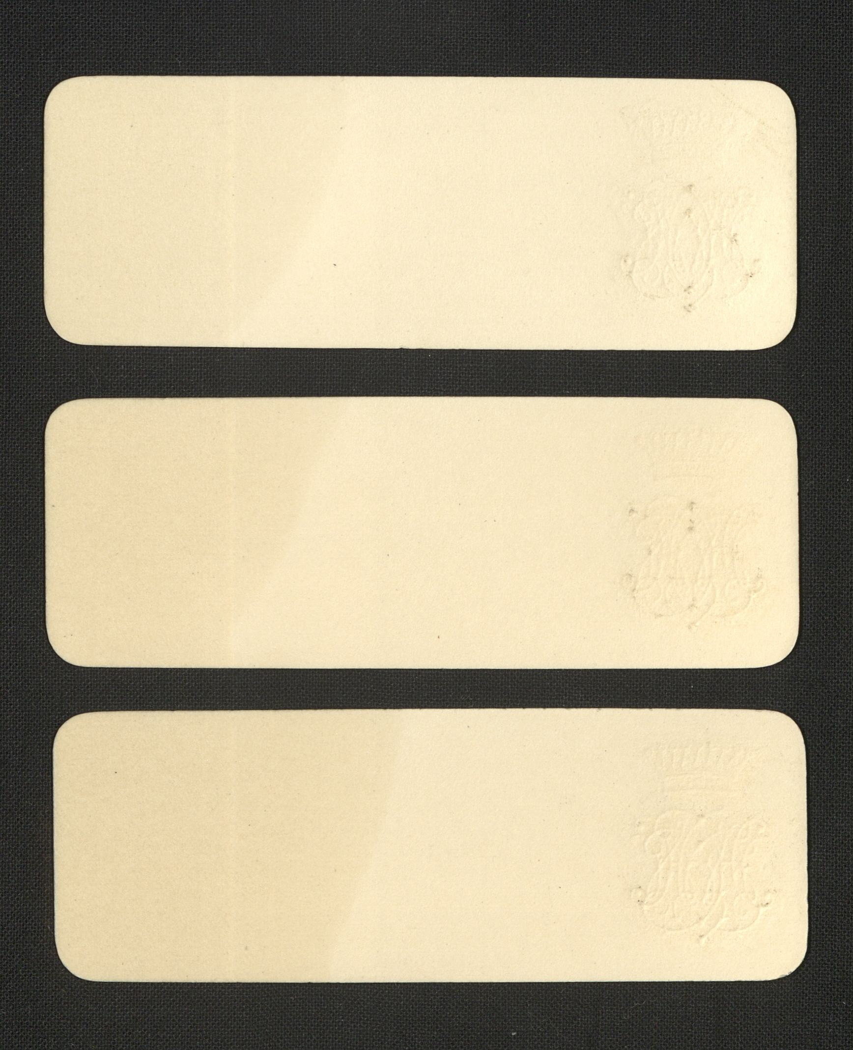 Tre stycken placeringskort med spegelmonogram (W.v.H.) under grevekrona i guldtryck; guldkanter. Ej använda. Utförda efter beställning av Wilhelmina von Hallwyl hos Frans Svanström & Co, Norrmalmstorg 1. Dylika placeringskort användes vid alla stora middagar i Hallwylska huset, Hamngatan 4 mellan åren 1902 och 1921.