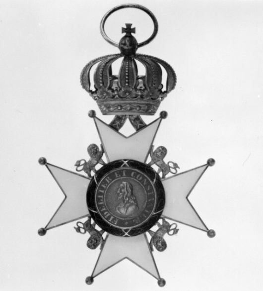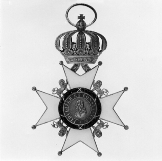 Vitemaljerat malteserkors av förgyllt silver, kulor på spetsarna, mellan korsarmarna gående, framåtvända lejon av guld. Svagt välvd medaljong av förg.silver, därpå reliefporträtt av hertig Ernst den fromme, halsbild, profil v. , däromkring blåemaljerad ring med guldtext: " FIDELITER ET CONSTANTER ". Ytterst en grönemaljerad eklövskrans. Frånsidans medaljong svagt välvd, delad nio ggr av svart och guld, därpå grönemaljerad balk, vars övre kant bildas av klöverskura (Sachsen). Däromkring blåemaljerad ring med guldtext: " D. 25. DECEMBER 1833 ". Ytterst grönemaljerad eklövskrans. Mellan den övre korsarmens spetsar två band av guld, däri fäst sluten krona av guld, igenom äpplet draget en bandring av guld.
