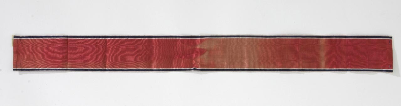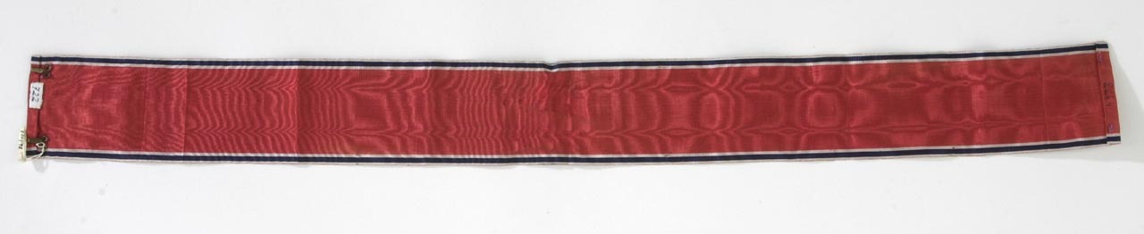 Halsband av röd sidenmaoré med vit-blå-vita kantränder, b: 1+3+1,5 mm. Fästning med hakar av mässing och hyskor av rött silke.