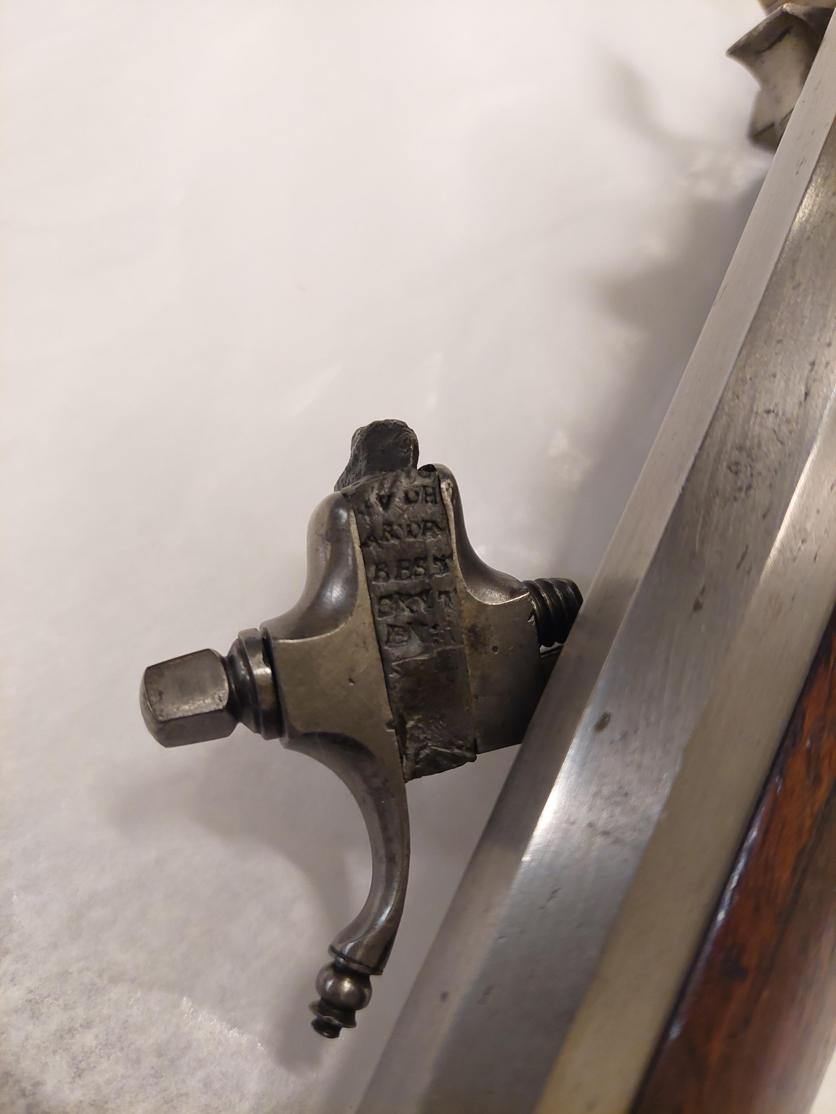 Pyrit i blymantel med stämplad text: "1652 C RS" på den ena sidan, "GVDH ÄR DEN BEST SKYTEN" på den andra.