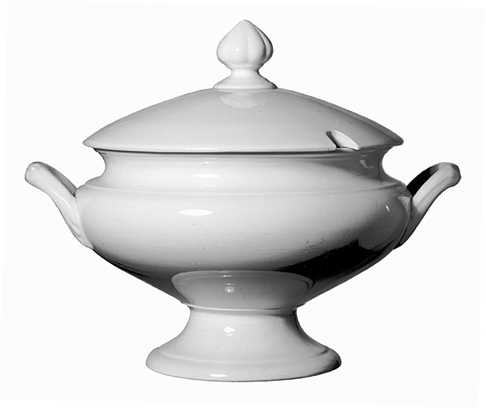 SOPPSKÅL med lock av porslin. Rund, skålformig, på fot samt med kälformigt indragen, sned uppåtstående bräddkant och två handtag. Fot låg, starkt utsvängd, med ytterkanten stavformigt avslutad. Handtag nästan rundstaviga, bågformiga och snett utstående samt med bladformiga fästen. H: 17,1; D: 26,1 cm. Fot: D: 14,9 cm. Lock: Lågt, kupigt, med falskant och vertikalt räfflad toppig hjässknopp på kälformig hals samt fotplatta. I lockkanten ett avlångt hål för soppsleven. Lock: H: 9,7; D: 24,3 cm.
