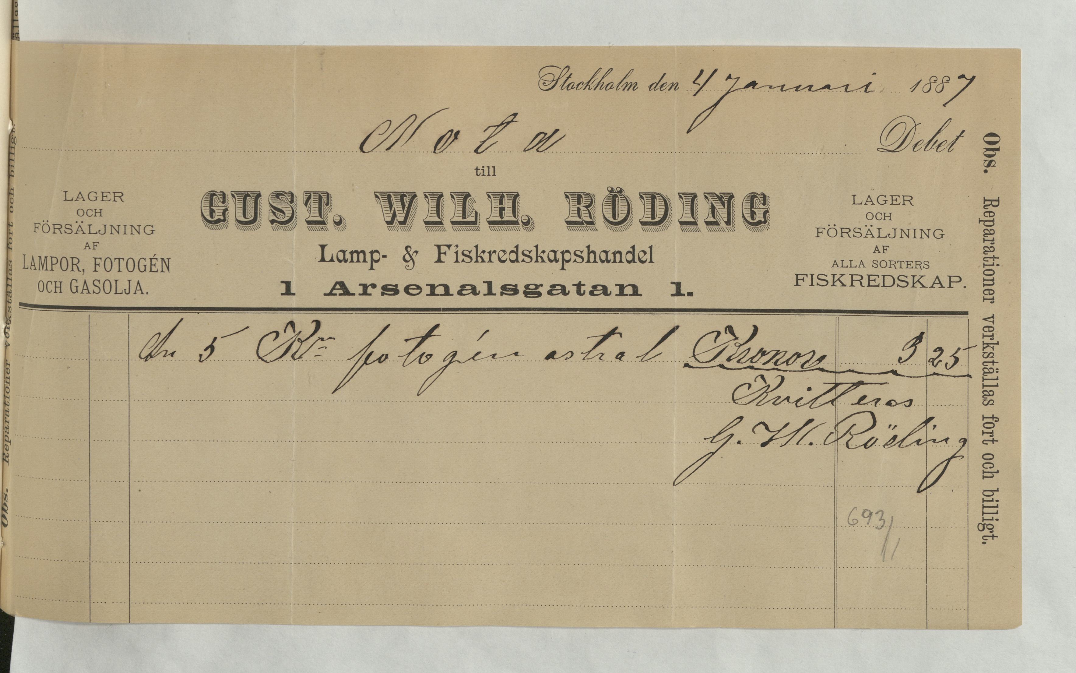 Kvitto från Gust. Wilh. Röding, Lamp- och Fiskeredskapshandel, på en summa av 3:25Kr. Stockholm 4 januari 1887.