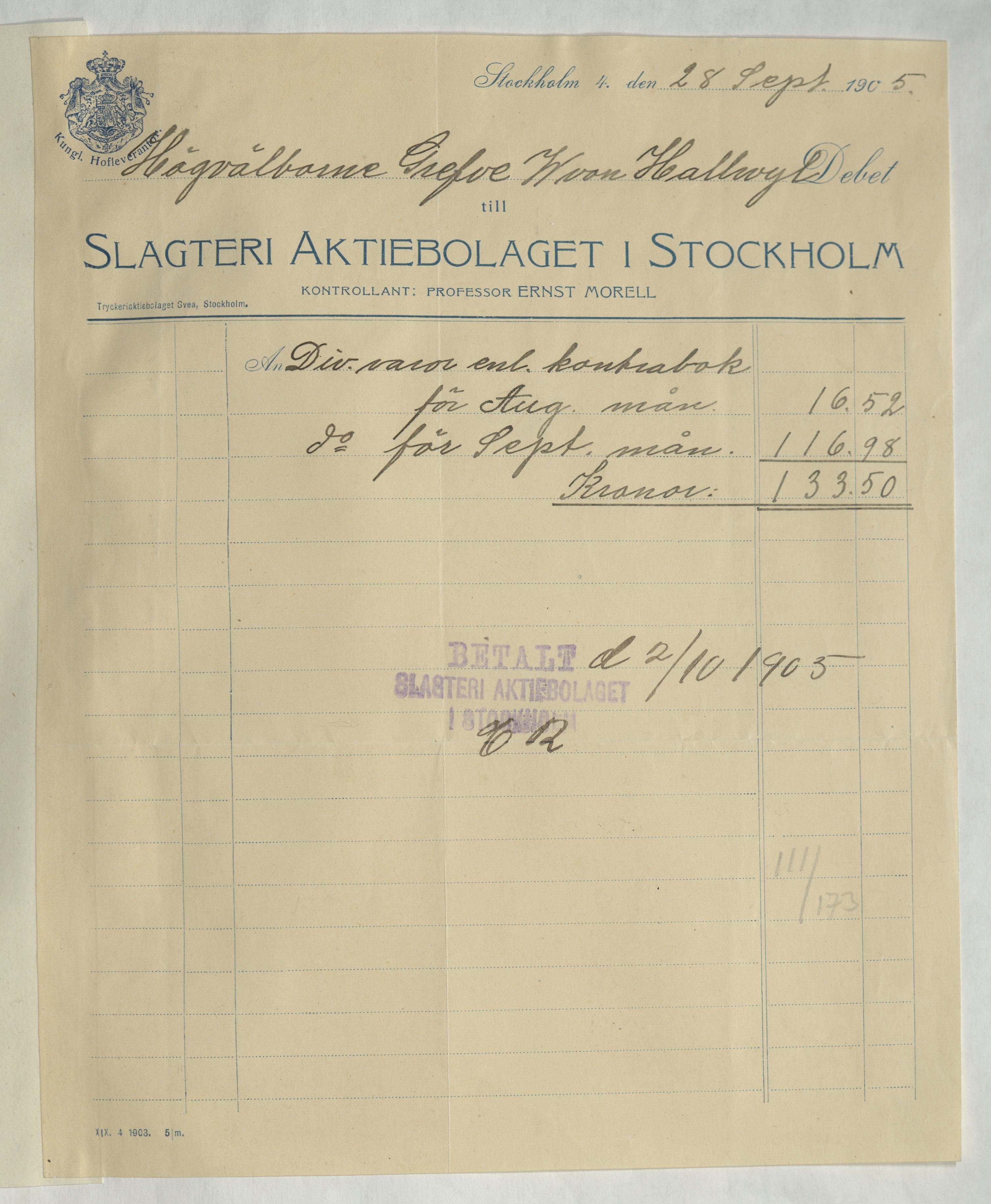 Kvitto från Slagteri Aktiebolaget i Stockholm