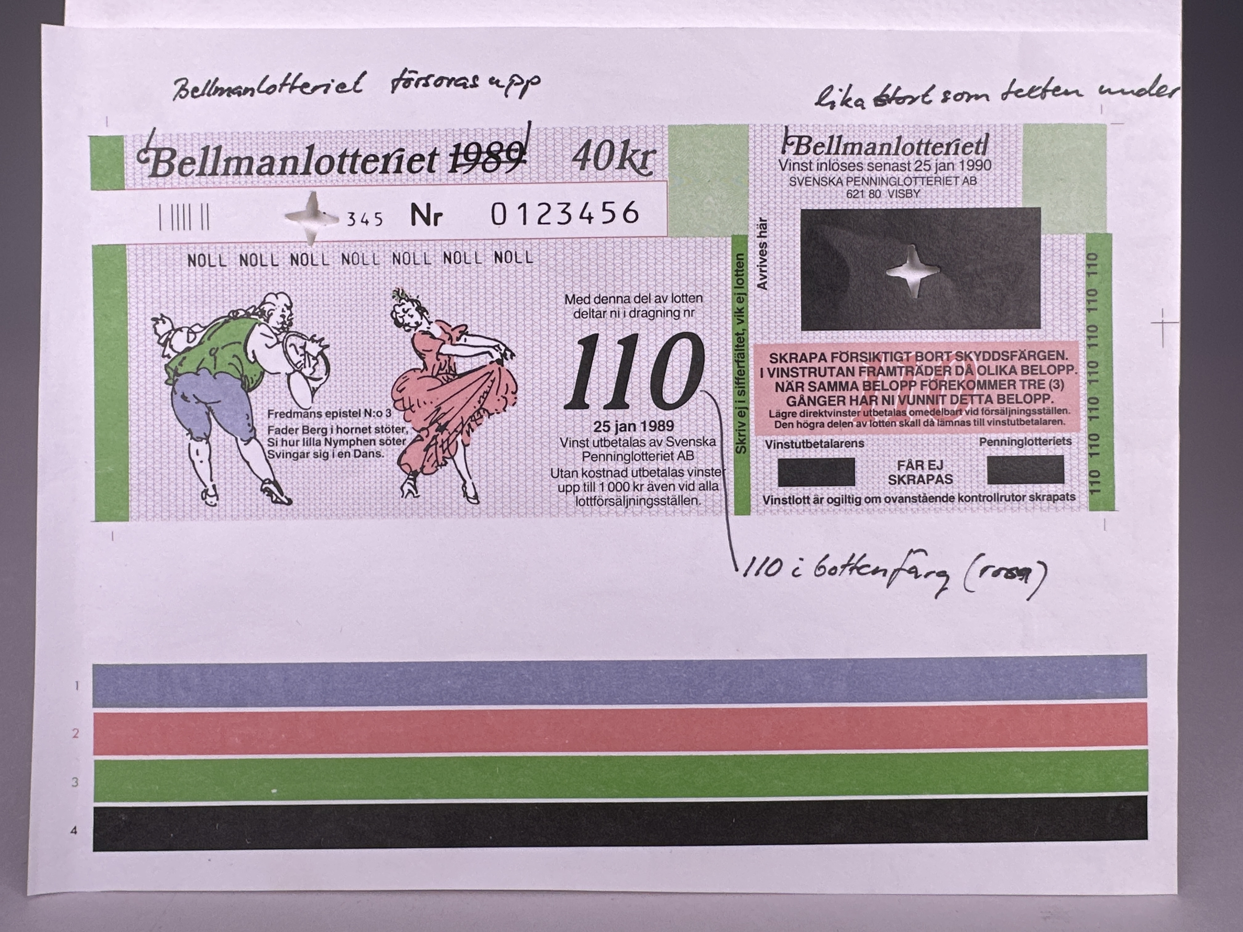 Lotterisedel, provtryck med handskrivna kommentarer (designförslag). En del av produktionsmaterial som användes vid design och tryck av lotterisedlar med dragningsdatum den 21 jan 1989. Pris 40 kronor. Motiv: från Fredmans epistel n:o 3. Dragning nr. 110.