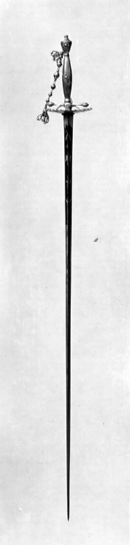 Fäste av högglanspolerat stål. Knapp urneformig, nederdelen med vertikalslipade fasetter och belagd på två motstående sidor med en rund rosett av fasettslipade (briljantslipade) nithuvuden. Nitknapp slät,rundad. Parerstänger raka, korta med spetsigt droppformiga, fasettslipade ändar. Fingerbyglar låga, smala. Parerplåt spetsoval, svagt skålformig och med rund-uddad kant, insidan belagd med bårder av nithuvuden, omväxlande i form av fasettslipade rosetter och runda, konvexa knappar. Mellan knappens nederdel och den främre parerstångsänden en handkedja, bestående av sex större (vid mitten) och mindre, fasettslipade stålpärlor, sammanfogade med ringformiga länkar. Vid handkedjans övre och nedre ände en tofs av små stålpärlor. Kavel tämligen smal, spolformig, liksom knappen slipad med längsgående fasetter, vid mitten på två motstående sidor en rund rosett av fasettslipade nithuvuden. Klinga rak, treeggad, s.k. stukatklinga. Starka delen med etsad och förgylld dekor mot blånerad bakgrund. Baspartiet helt förgyllt, på insidan etsat: "F.W.". Härovanför en rad av fyra ornament i form av trofé-och bladgrupper.