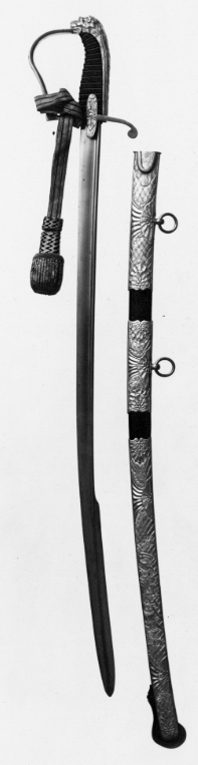 Balja av svärtat läder med tre mycket breda beslag av reliefornerad, förgylld mässing, alla med samma ornering på in- och utsidan. Orneringen består genomgående av ett rundmönstrat matt ytmönster, upptill och nedtill överlagt med en kraftig palmett. På mitten av de två övre beslagen ett kraftigt vinkelformigt ornament, bildat av fem snett mot varandra ställda hålkälar. På det nedre beslaget återfinns detta ornament på båda sidor om en trofégrupp bestående av en halvrustning med hjälm, två ovala sköldar och två korsade sablar, det hela flankerat av fyra fanor och några små lagerkvistar. Nedre beslaget (motsvarande en doppsko) avslutas nedtill med en asymmetrisk släpsko av mörkt stål (högre uppdragen på framsidan).