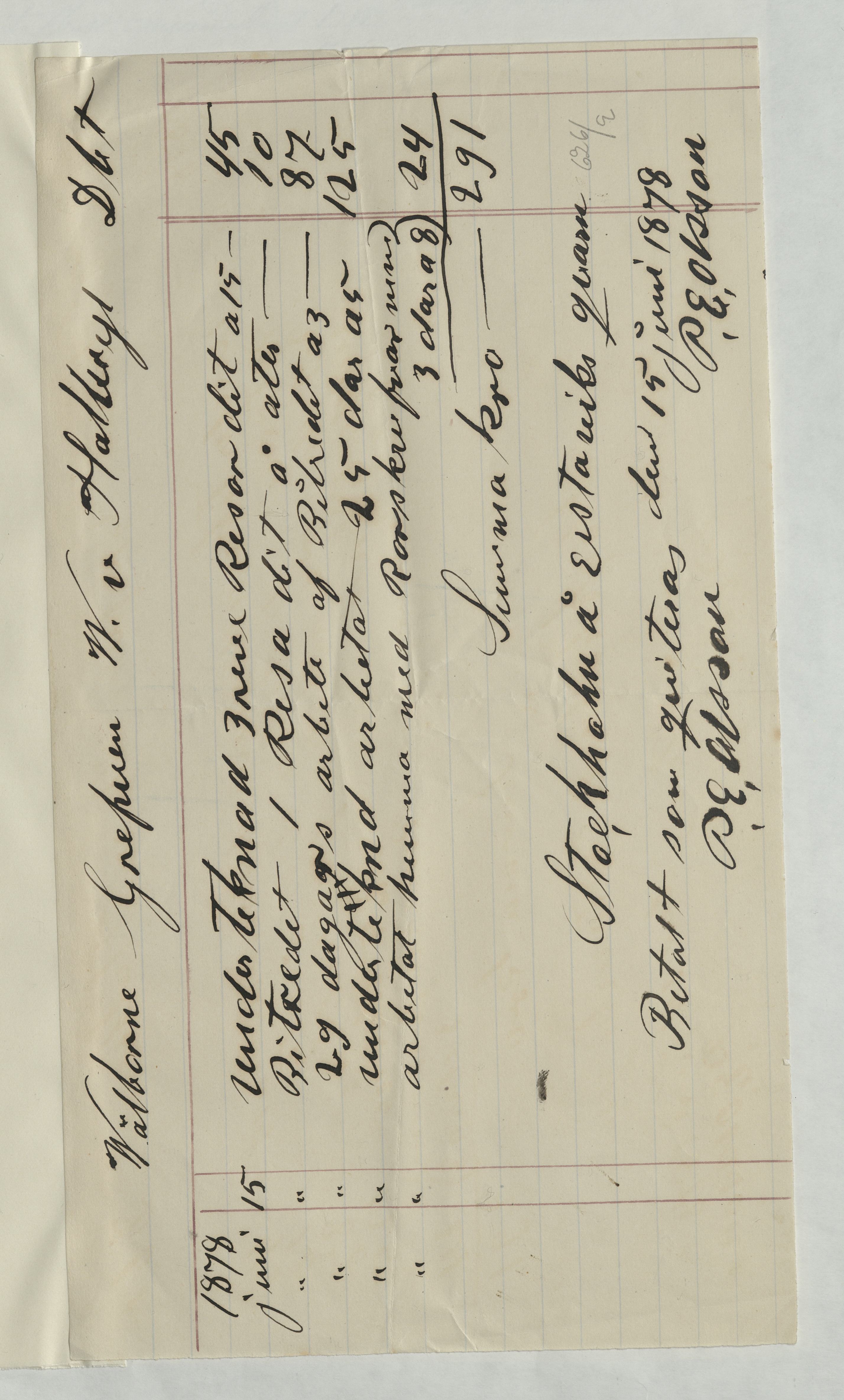 Kvitto från P.E Olsson, Södertelge och Furulunds Mekverkstad, Ericlund, för repation och resor. 291Kr betalat, Stockholm 15 juni 1878.