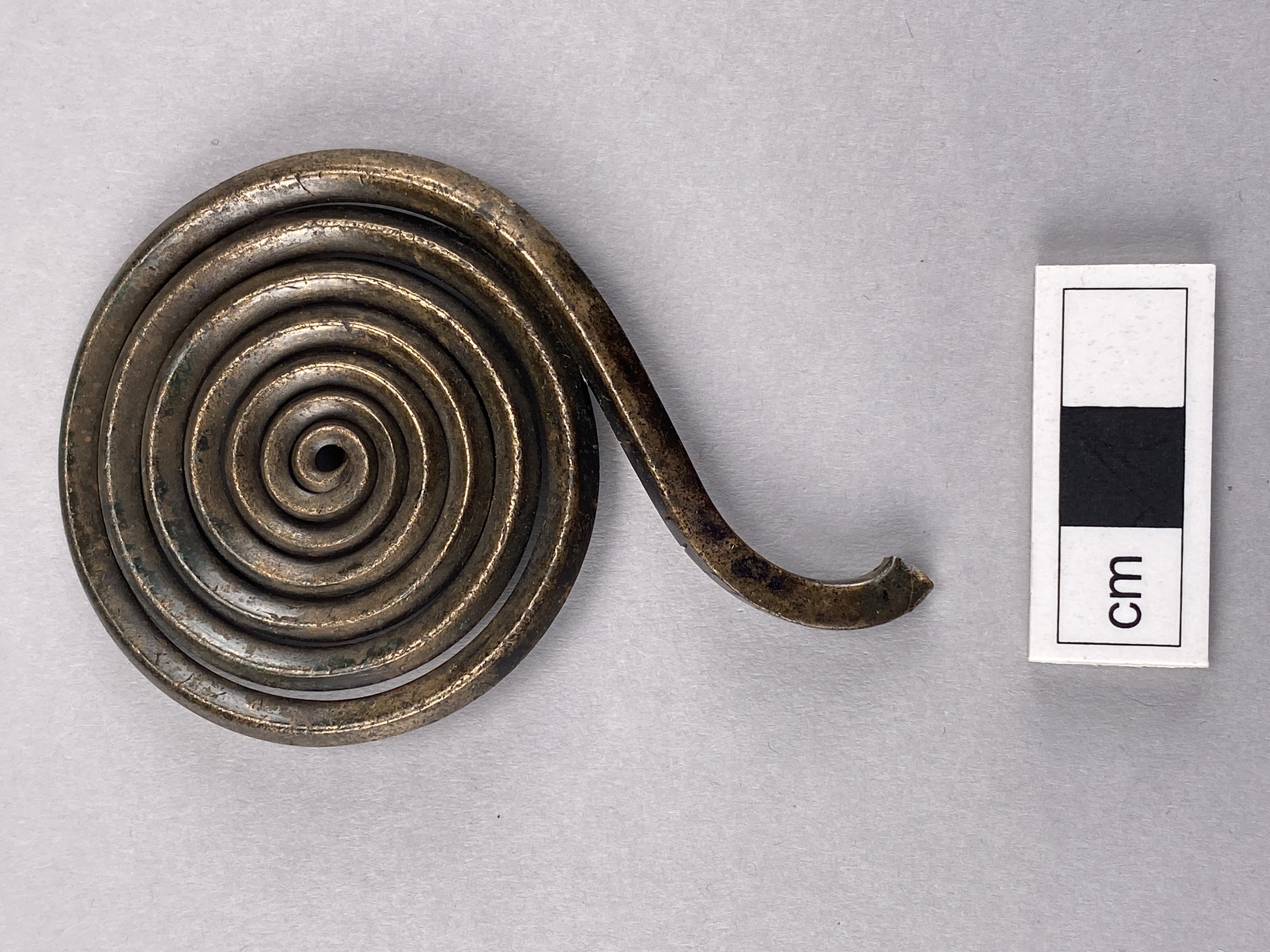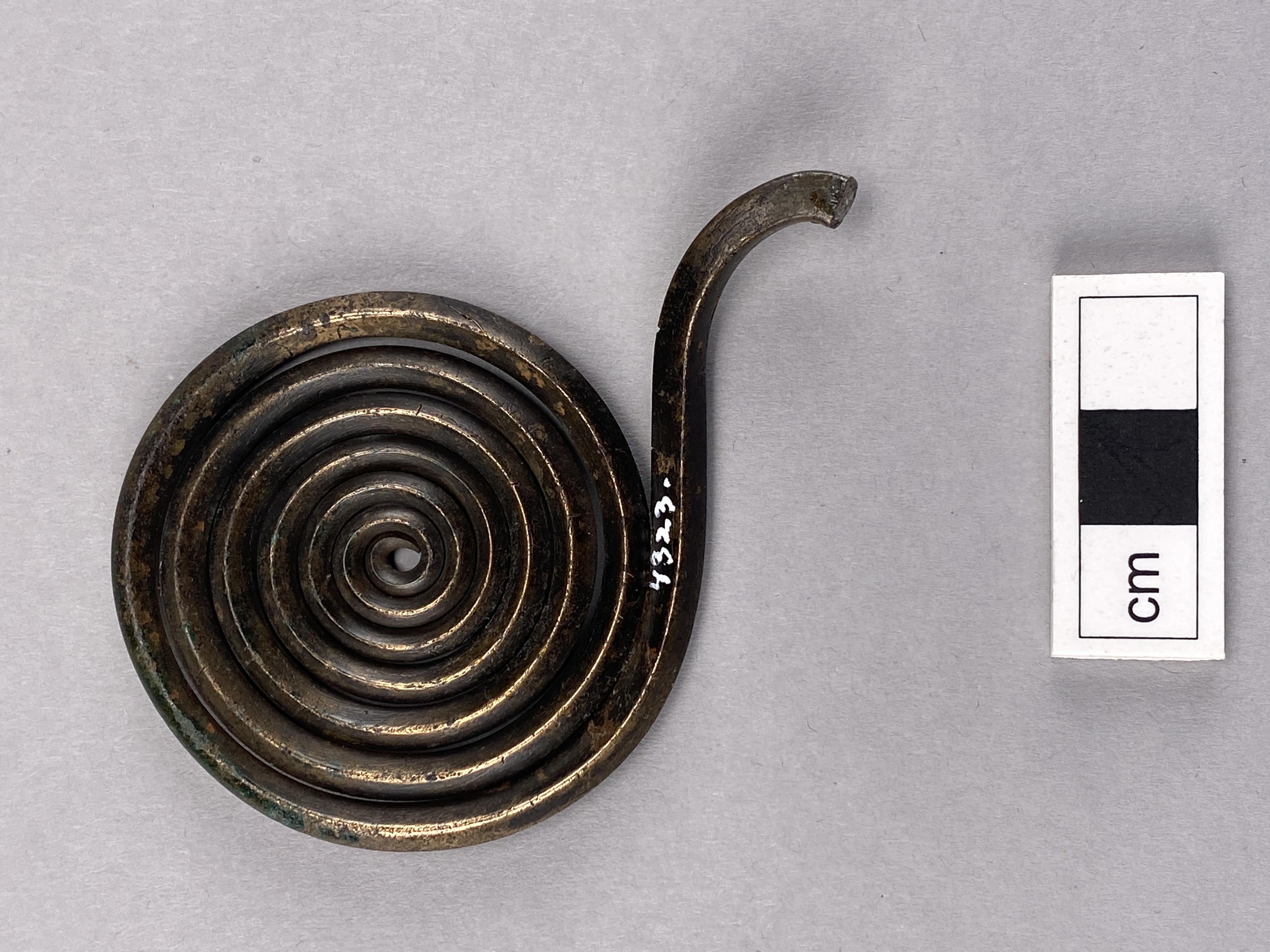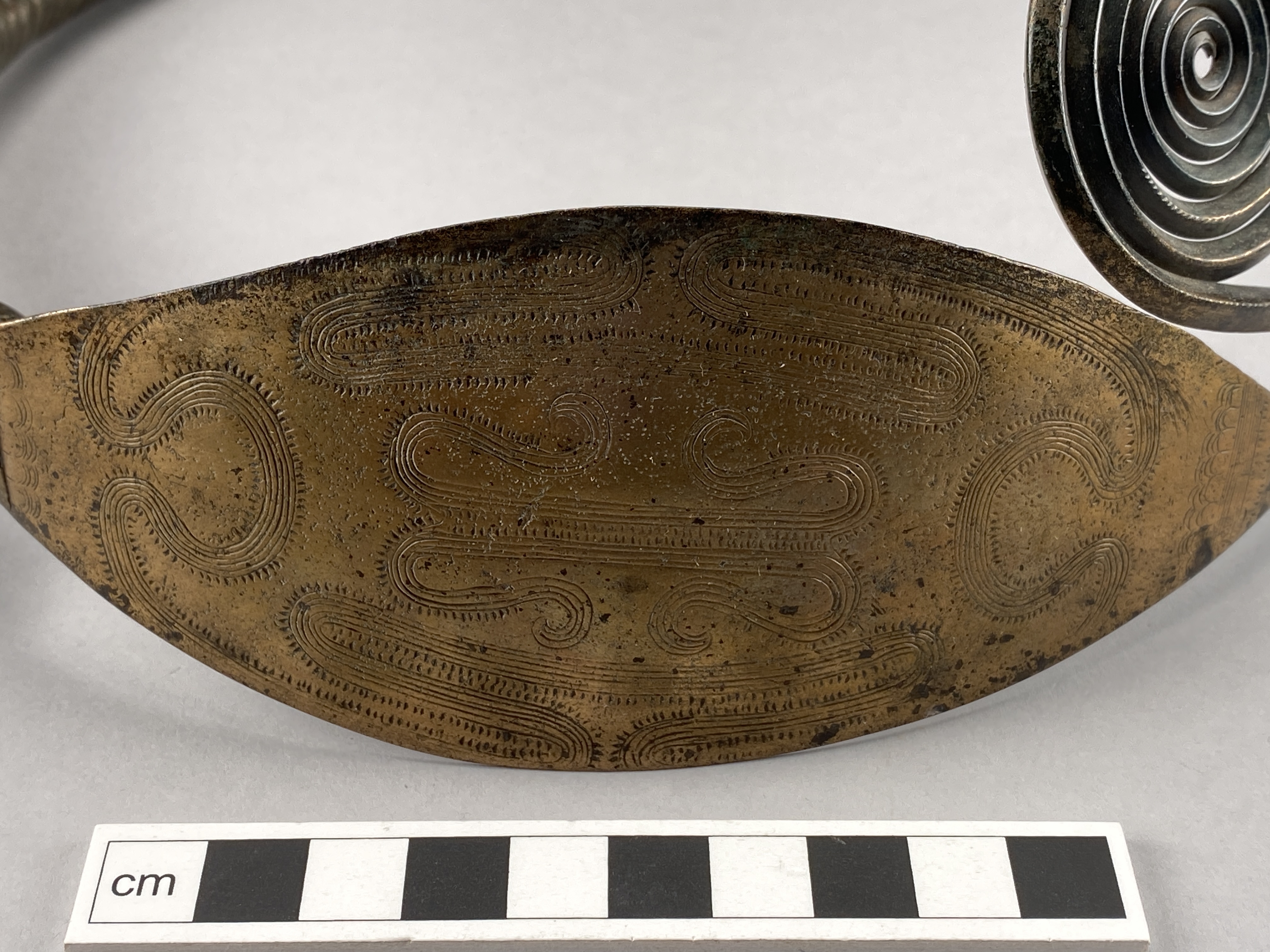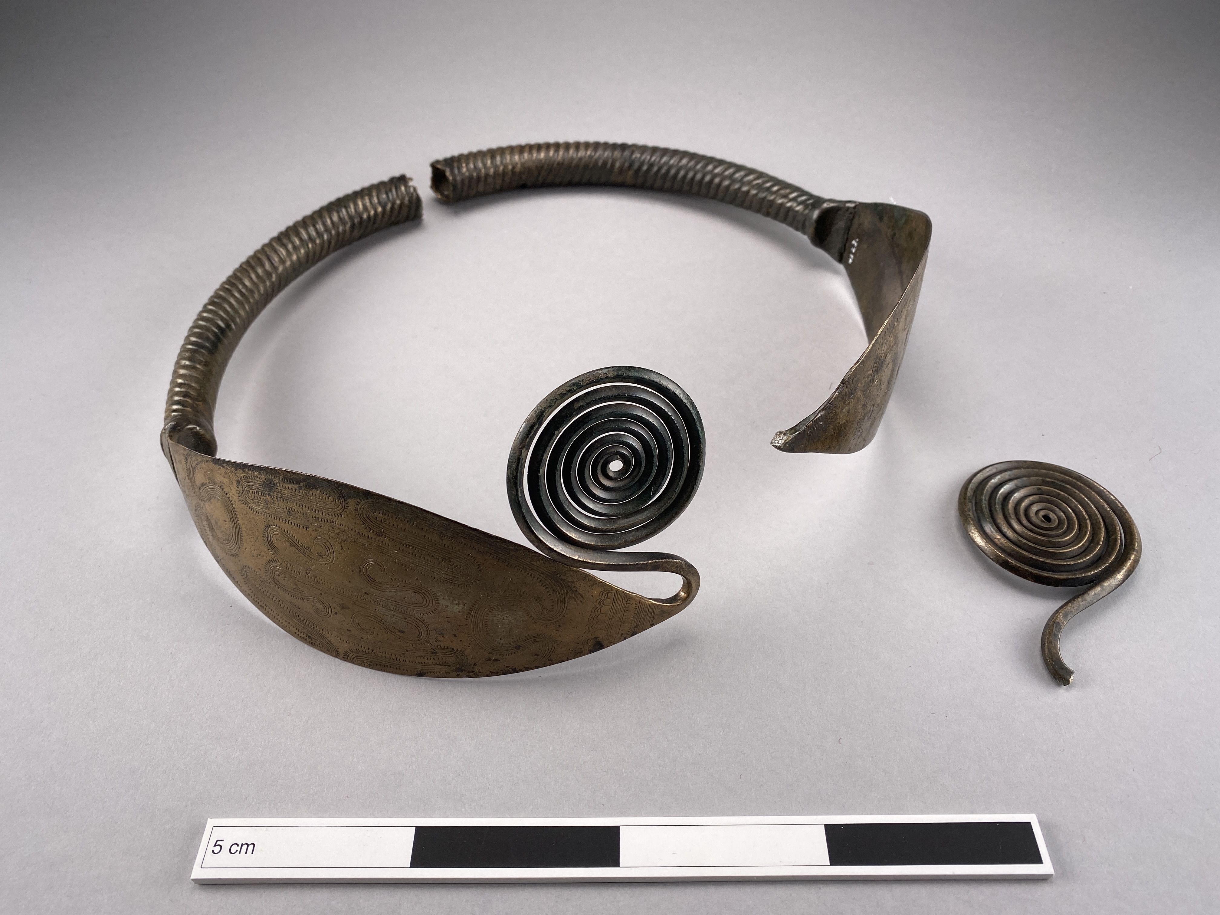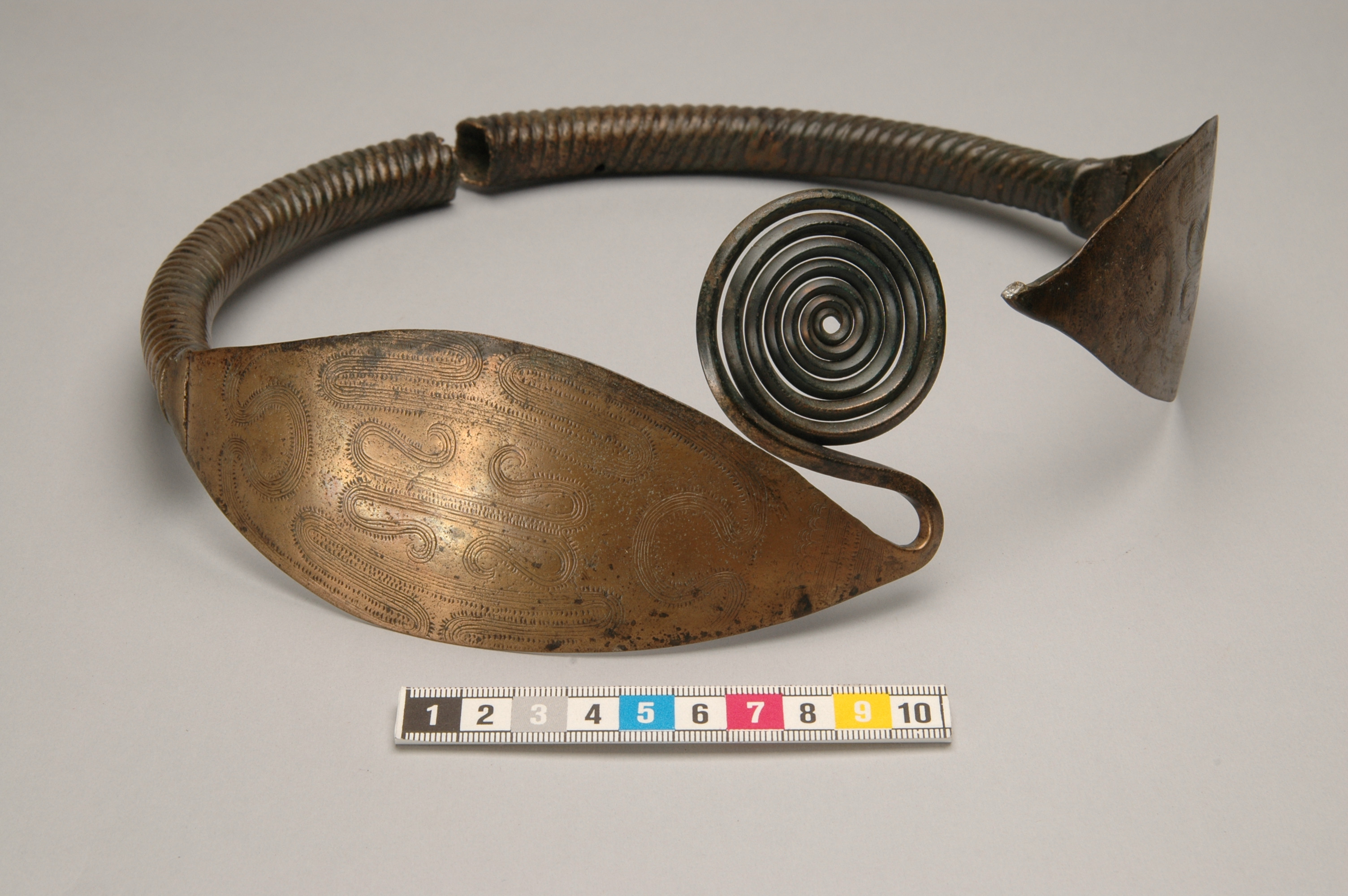 Halsring av brons. Ihålig, med stora ovala ornerade ändplattor som avslutas med stora spiraler. Den ihåliga ringen har snedräfflad ornering åstadkommen genom gjutning. Plattorna är gjorda för sig, möjligen delvis hamrade, varefter de pågjutits på vardera ringänden. Ringen har i gammal tid brutits sönder på mitten, men har lagats.