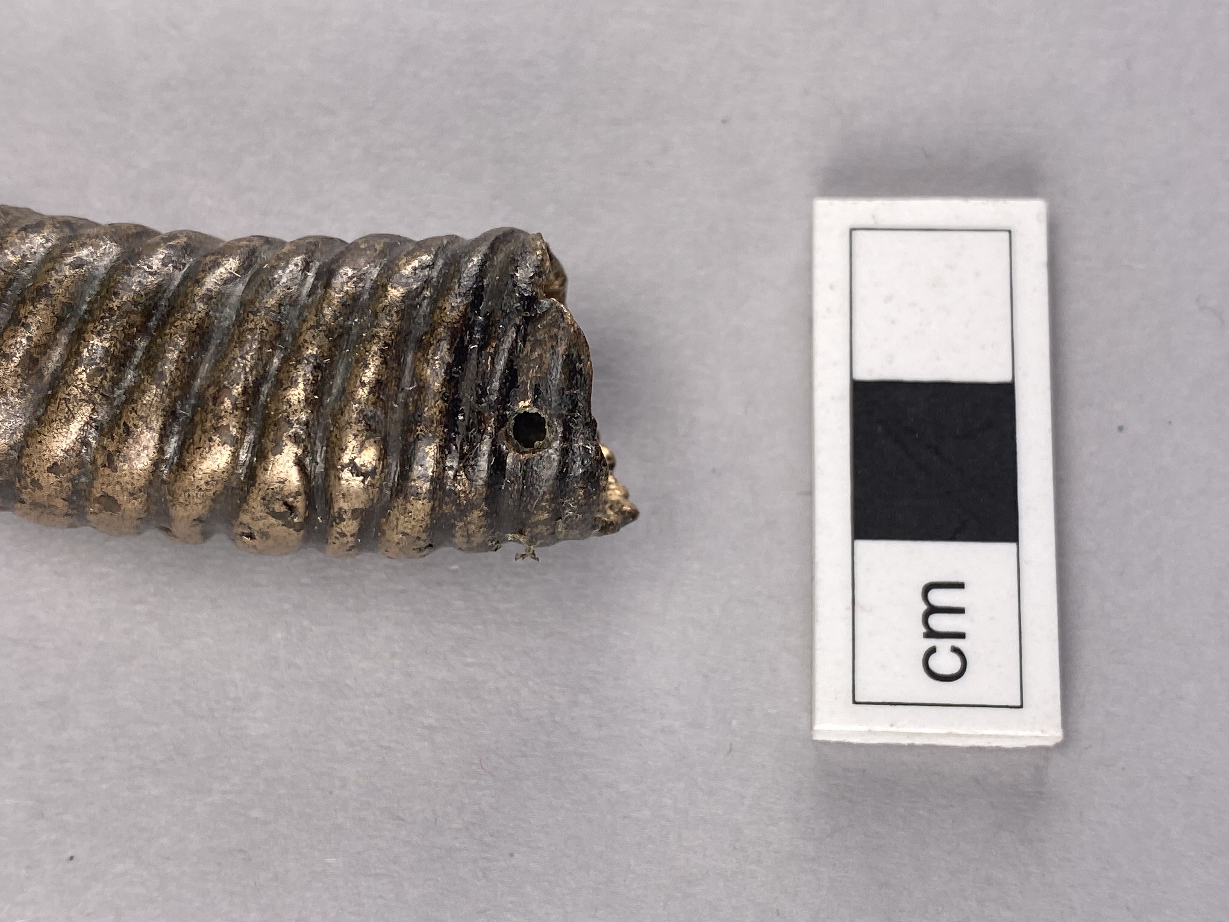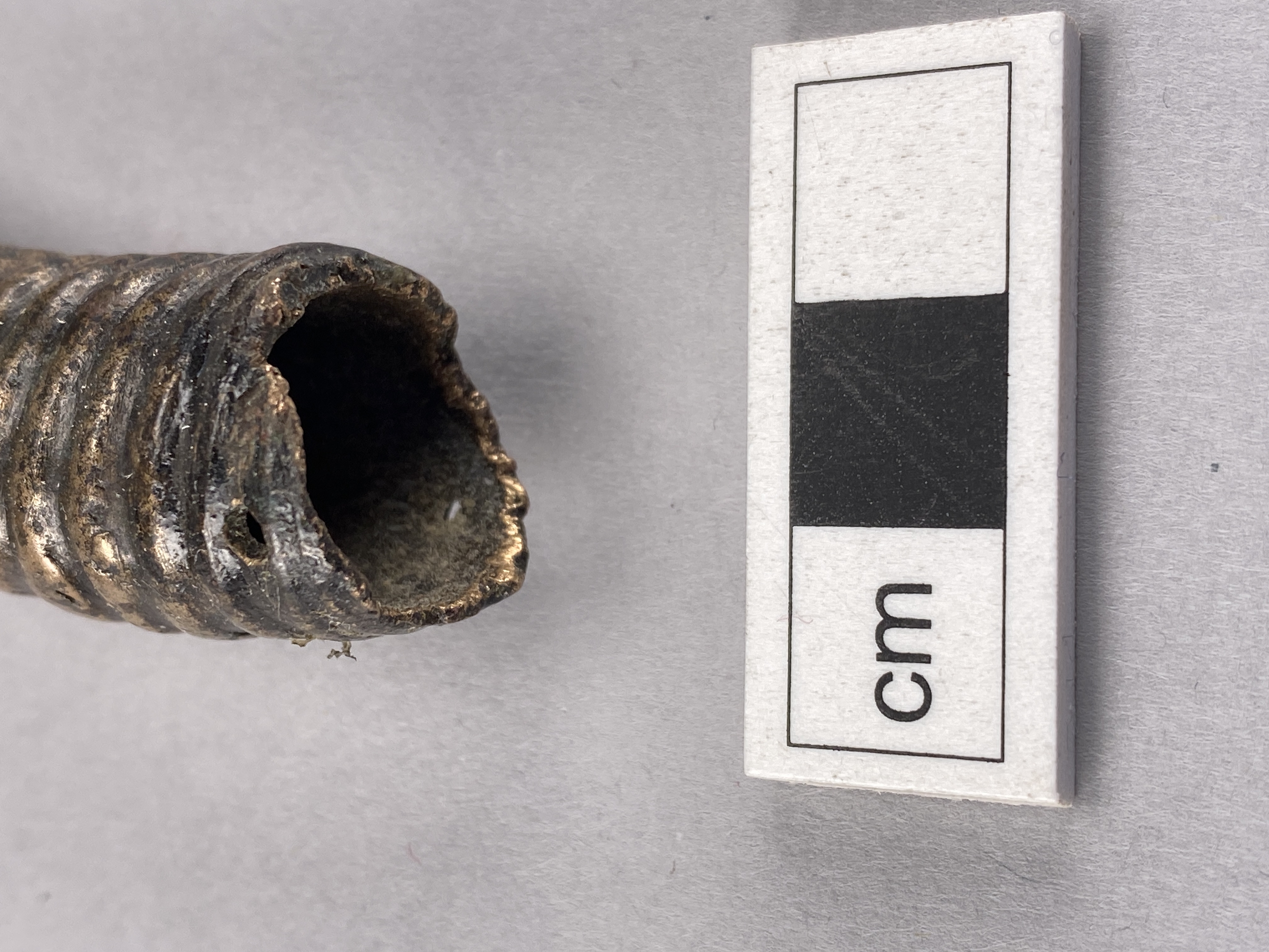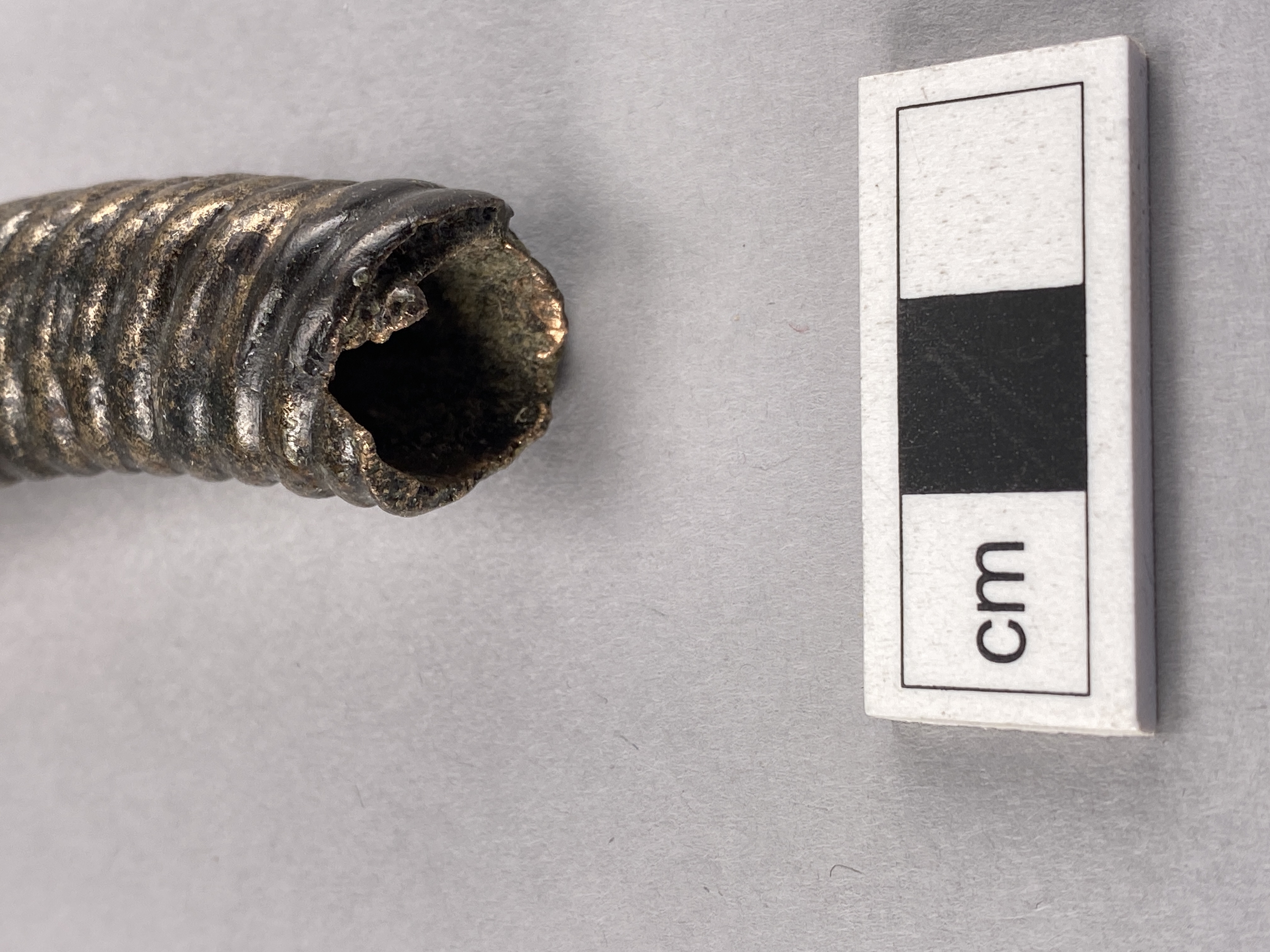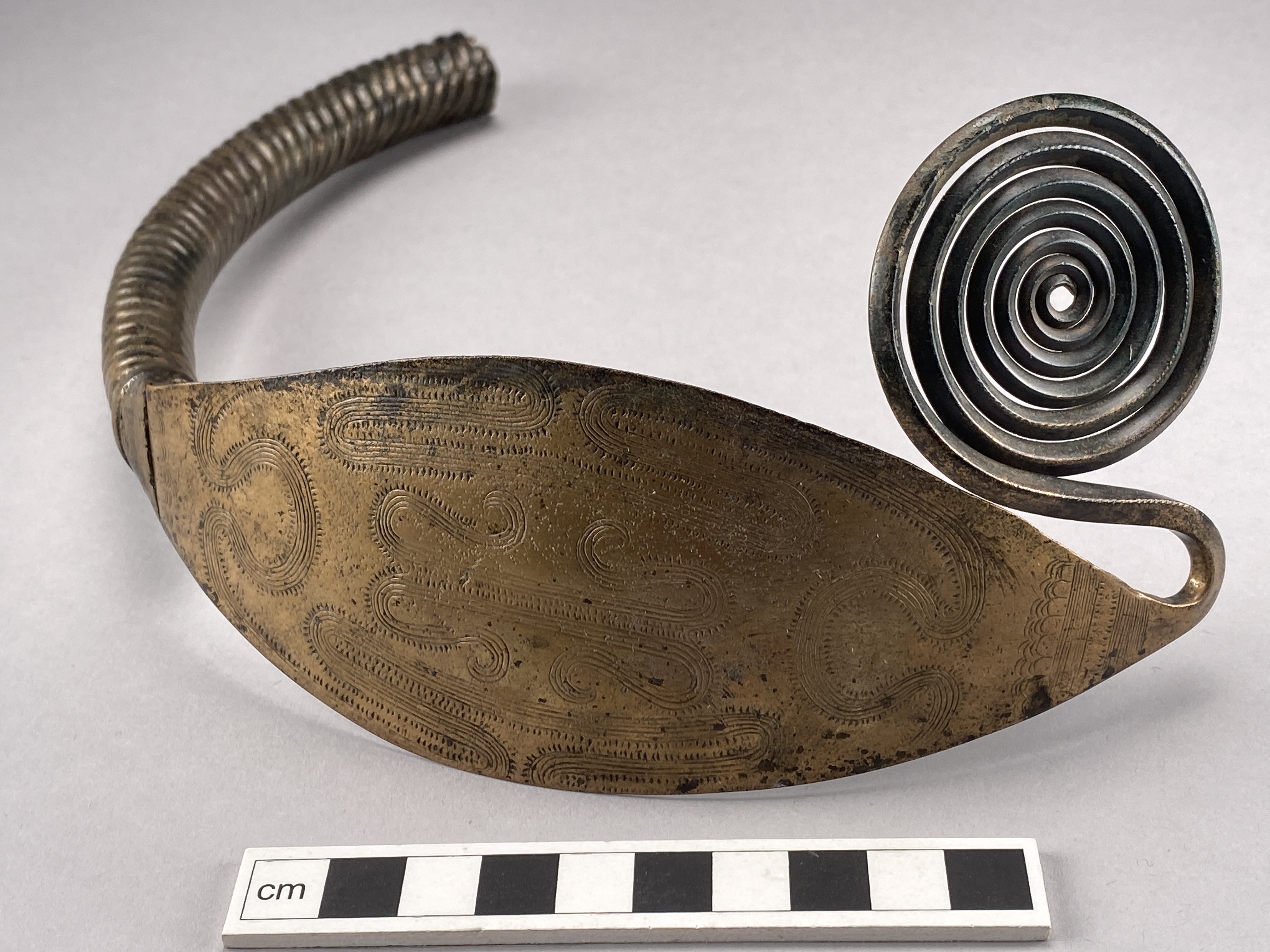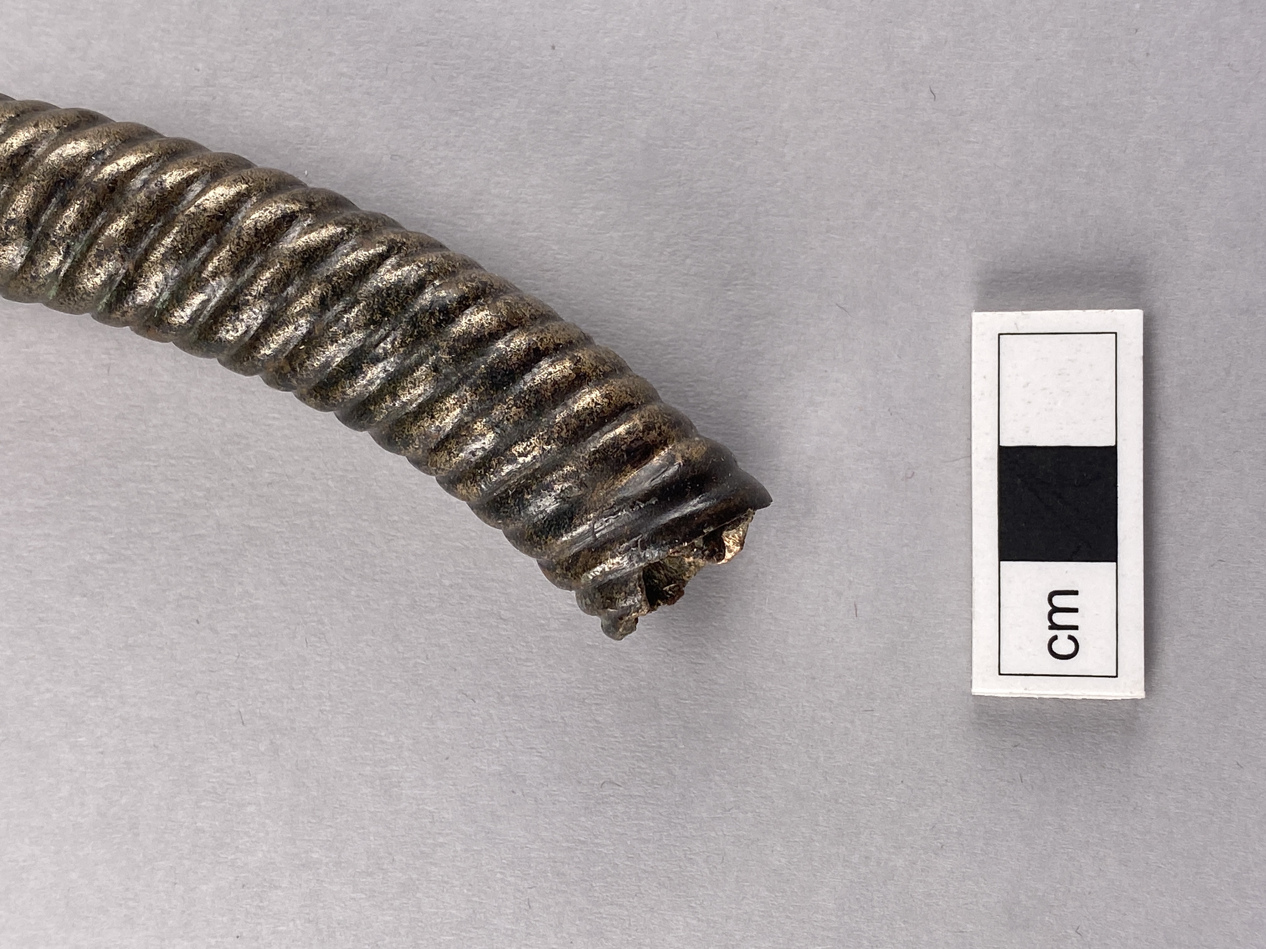 Halsring av brons. Ihålig, med stora ovala ornerade ändplattor som avslutas med stora spiraler. Den ihåliga ringen har snedräfflad ornering åstadkommen genom gjutning. Plattorna är gjorda för sig, möjligen delvis hamrade, varefter de pågjutits på vardera ringänden. Ringen har i gammal tid brutits sönder på mitten, men har lagats.
