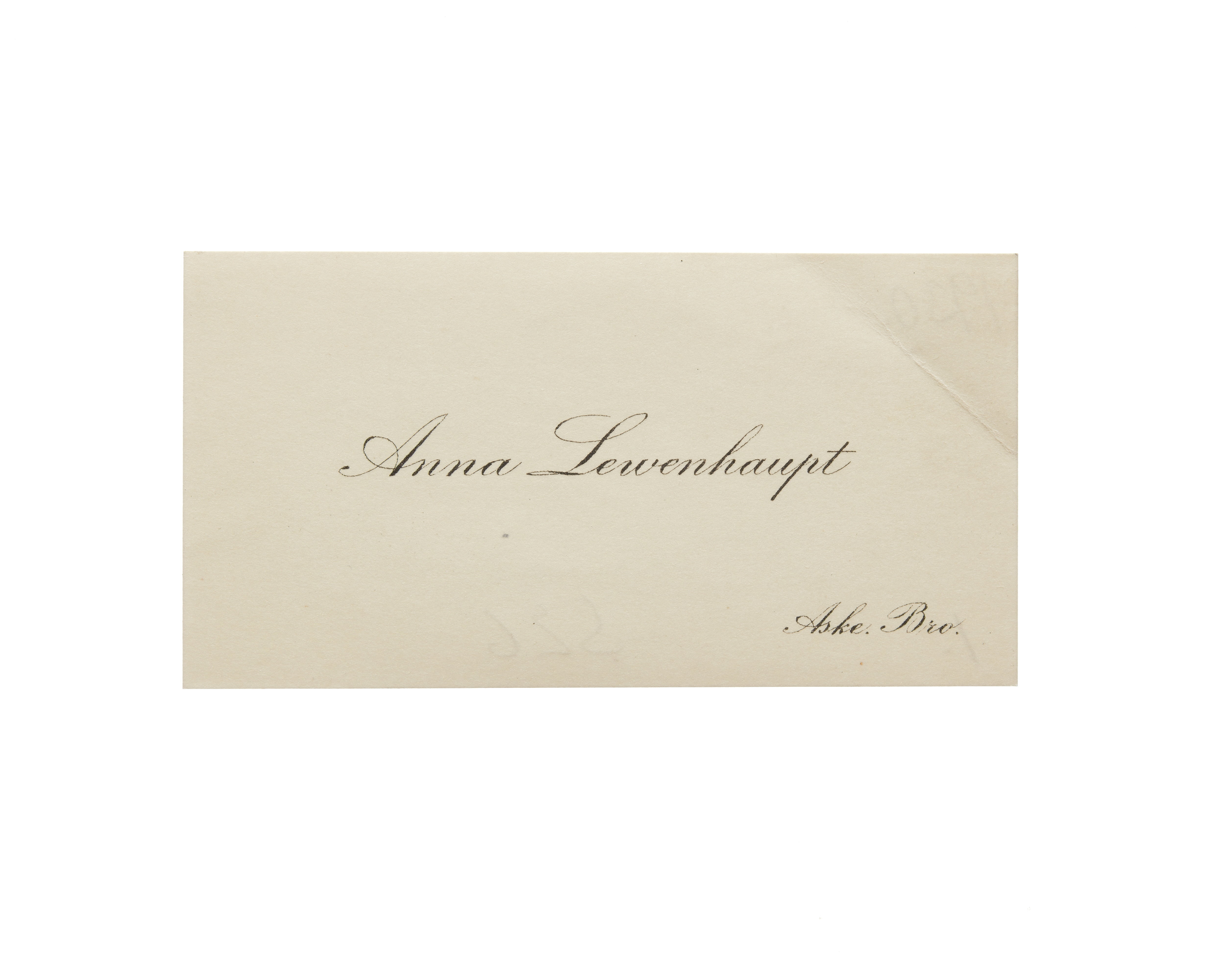 Ett visitkort från Anna Lewenhaupt, daterat 1930, vikt i övre högra hörnet. Adress (nedre högra hörnet) Aske. Bro.